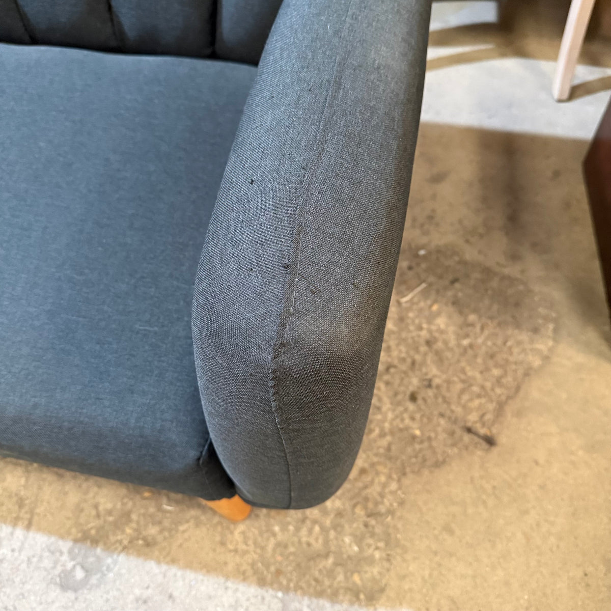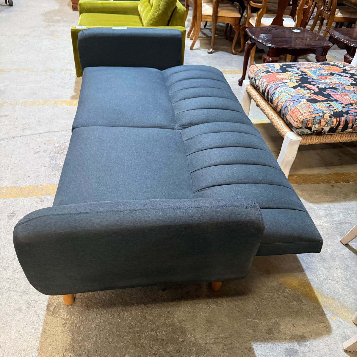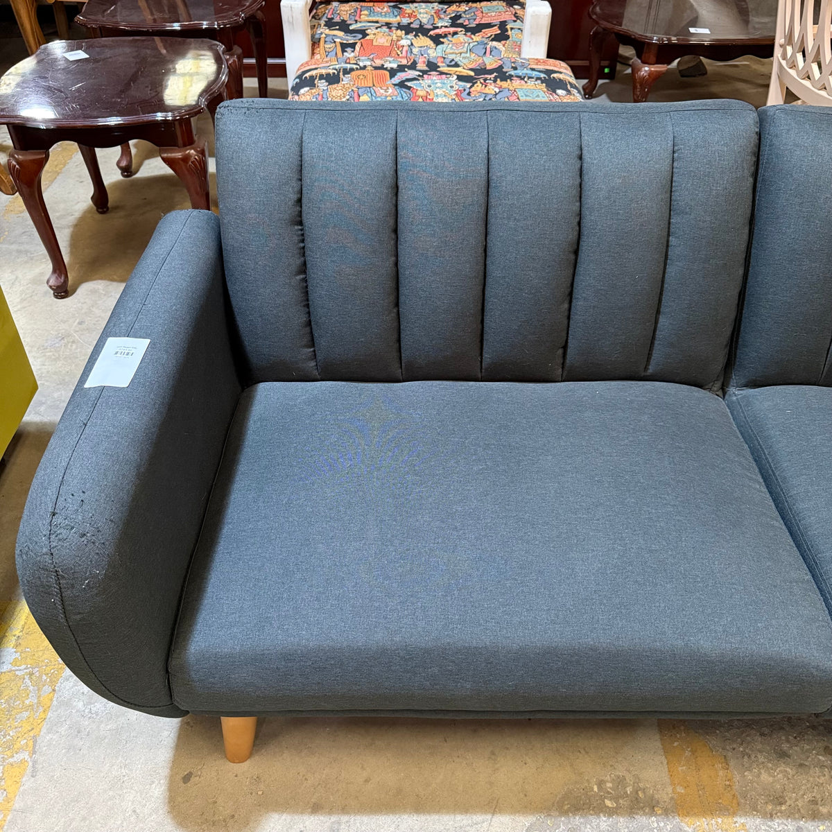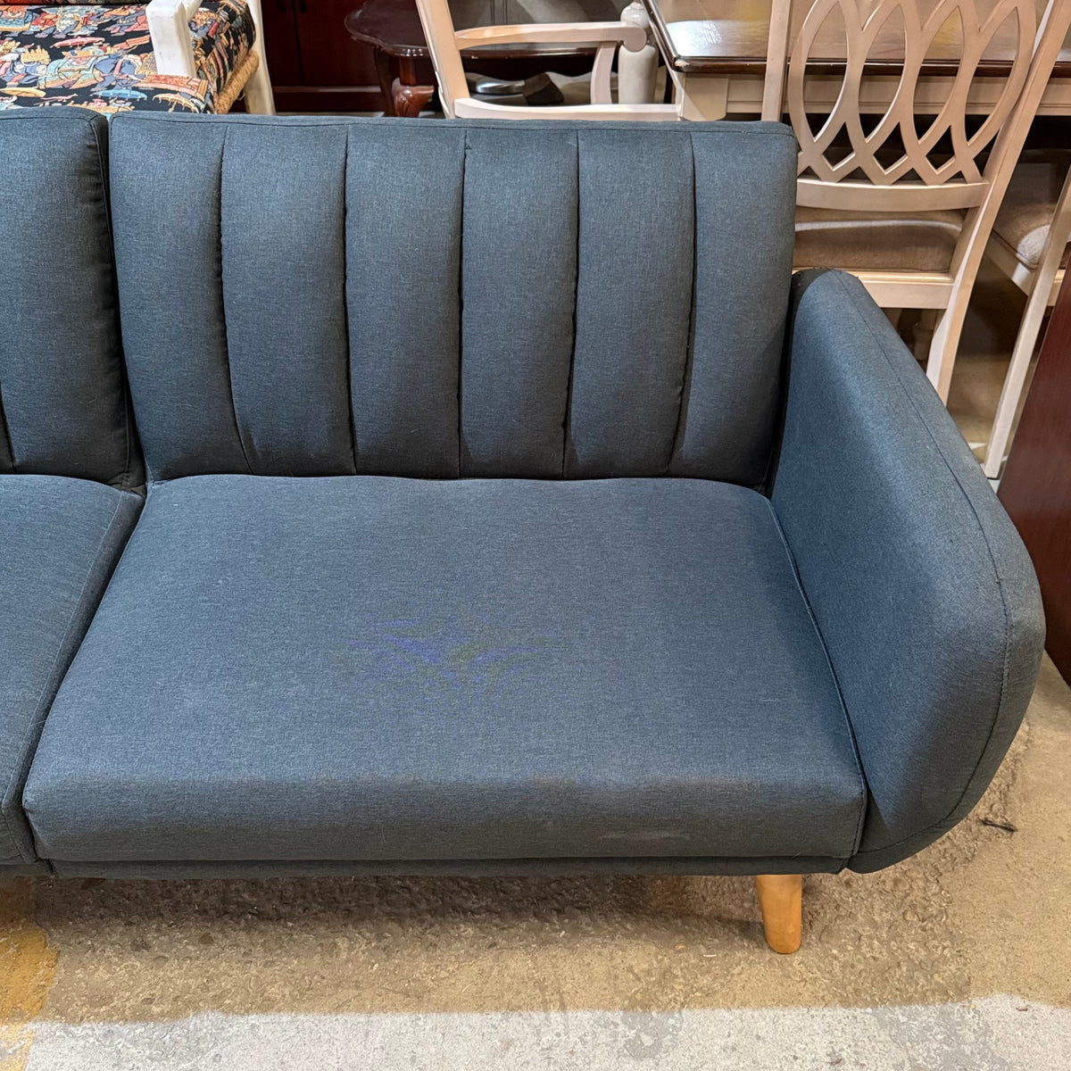 This product is a previously owned dark gray linen upholstered sleeper sofa by Dorel Home Furnishings. This sleeper sofa easily converts into a bed with two-positions to choose from -- upright or fully flipped all the way down. It sits on splayed, tapered wooden feet and is upholstered in a dark gray linen fabric.