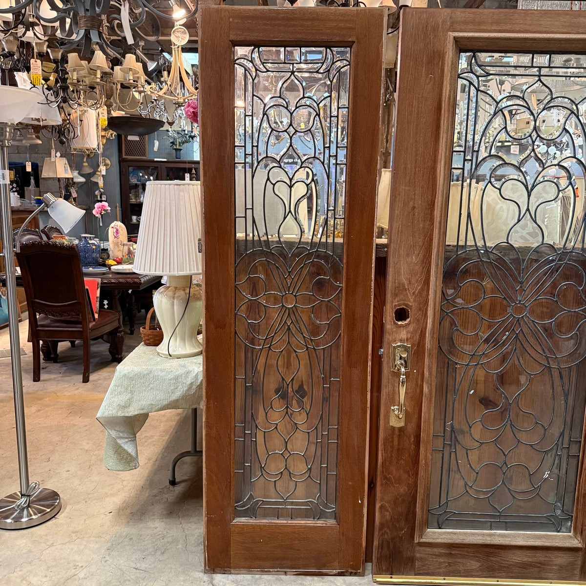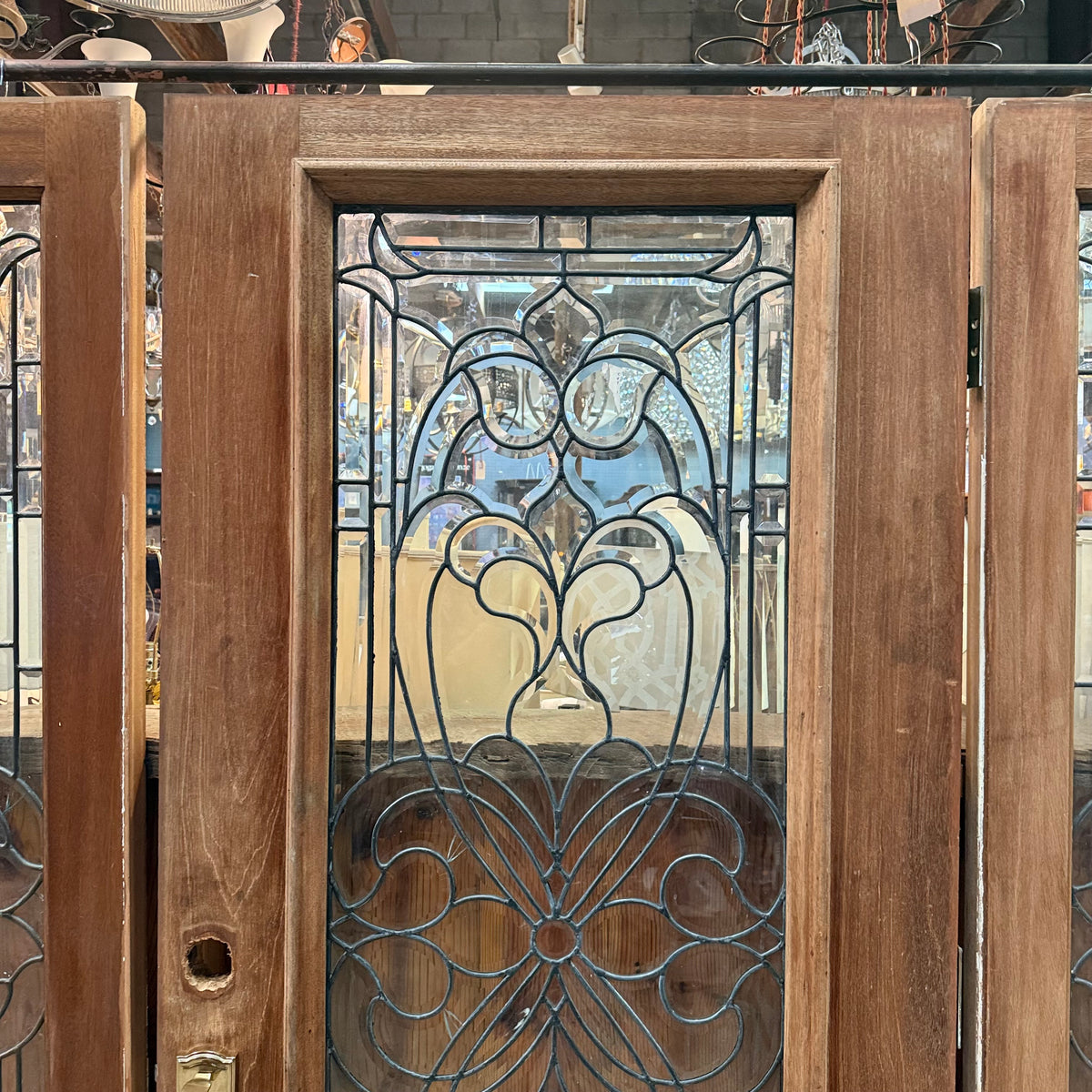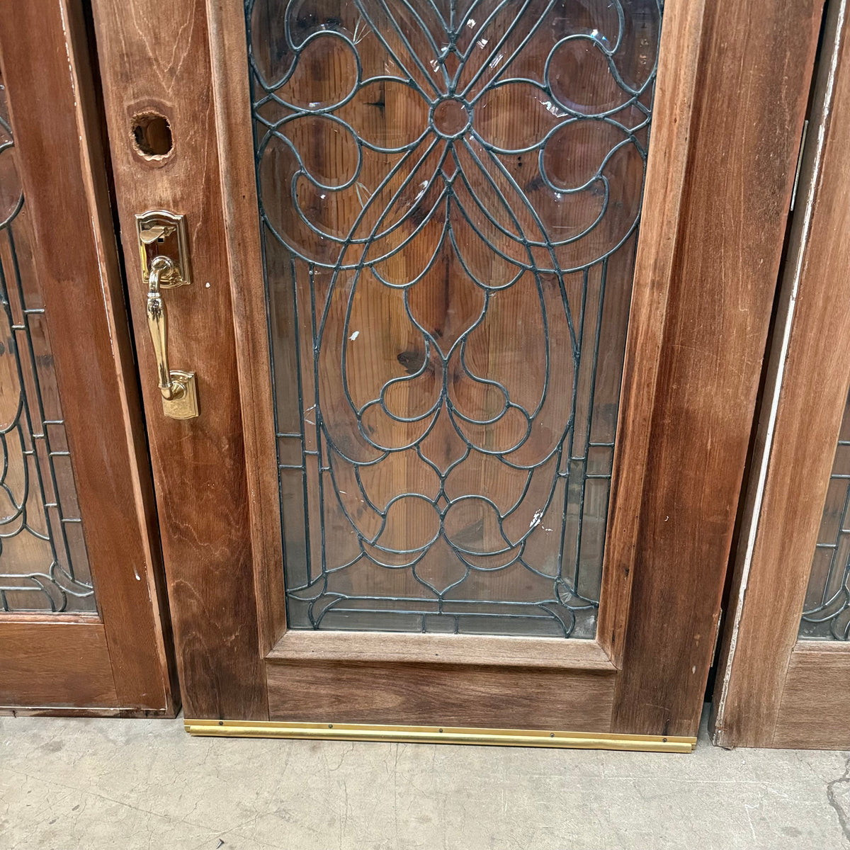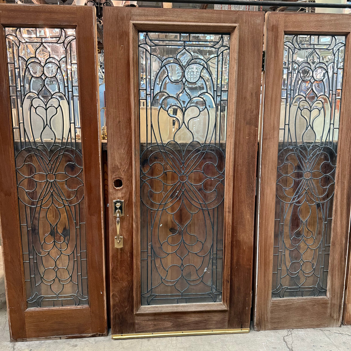 This is a previously-owned, solid wood front entry door comes with matching sidelites and a transom window, all with decorative leaded glass. The door is a right hand inswing exterior door and comes with handle hardware. Lock hardware and key are not included. The door hinges are still attached.