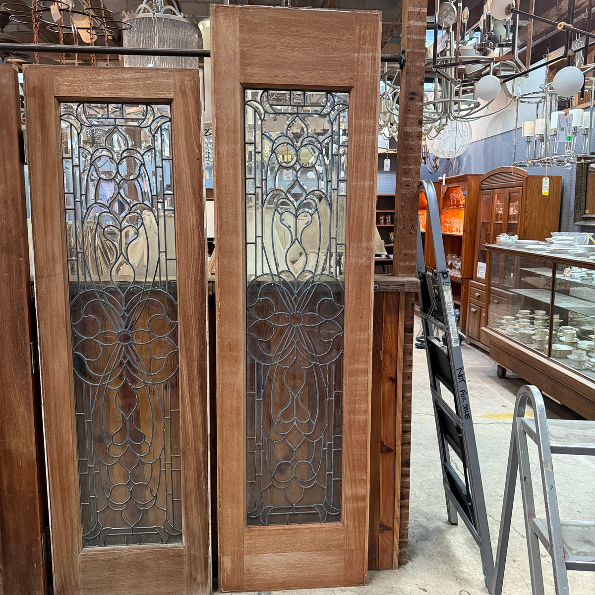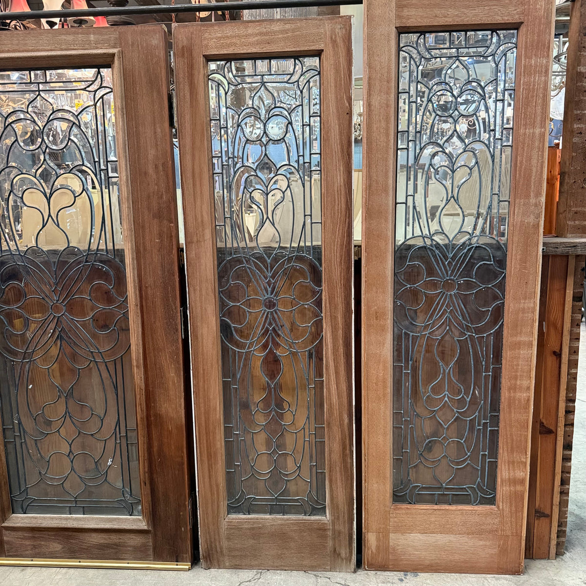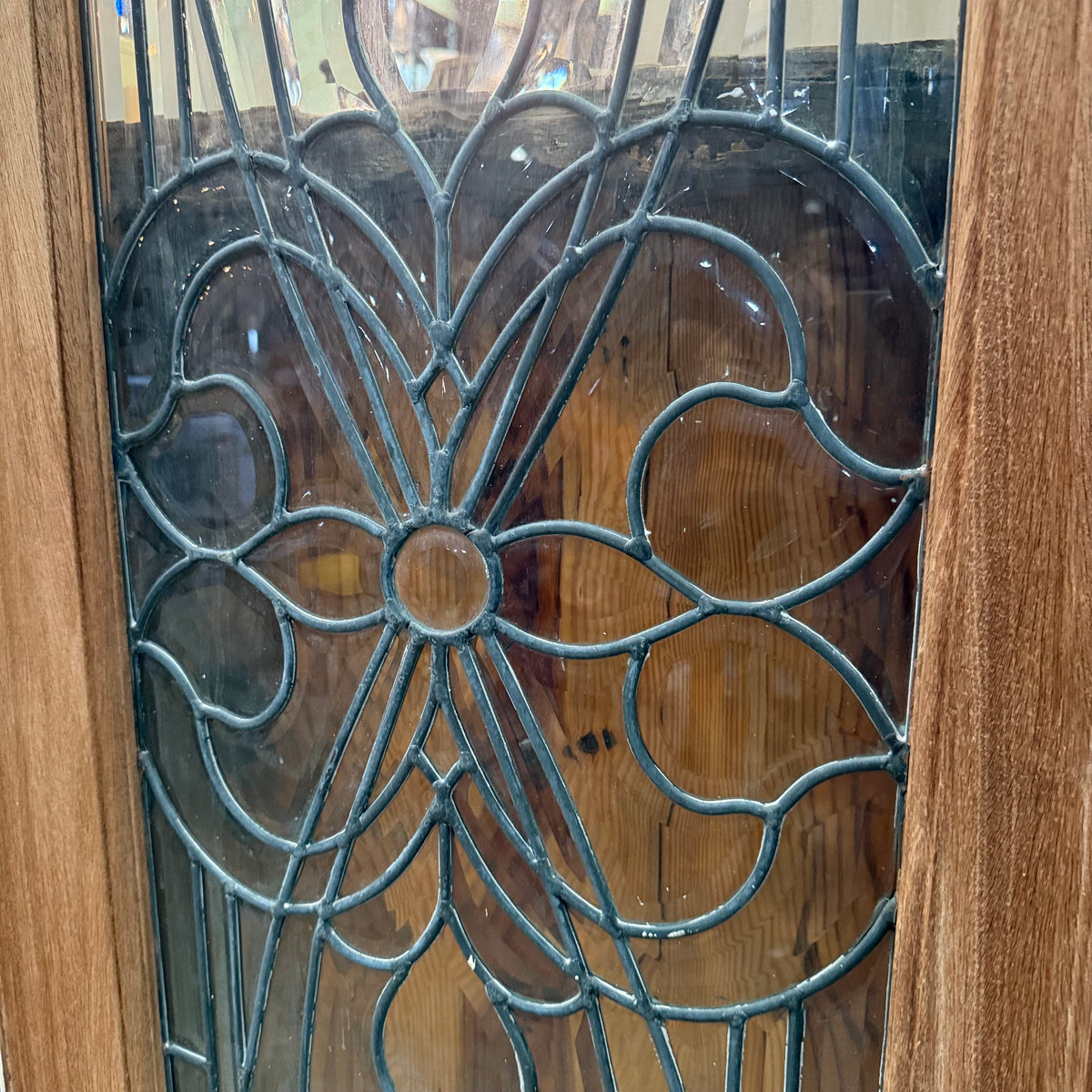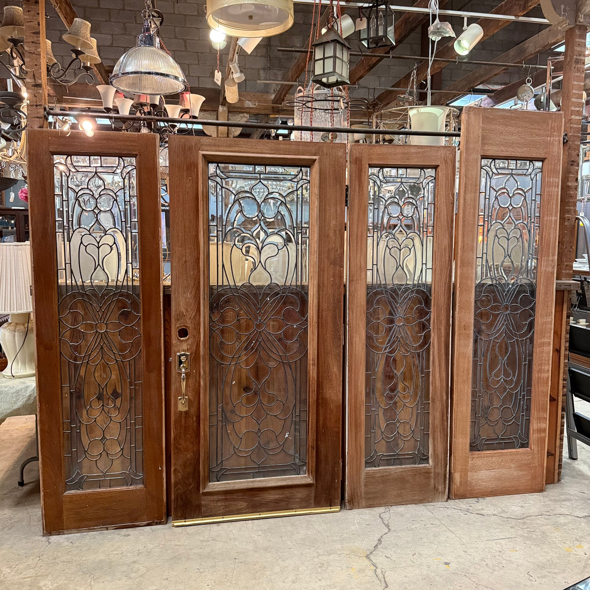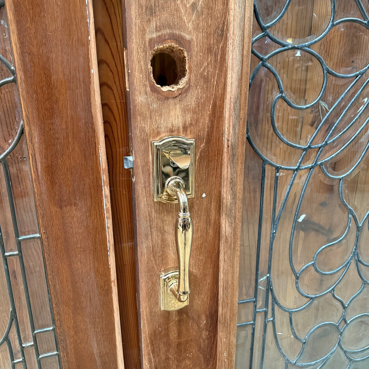This is a previously-owned, solid wood front entry door comes with matching sidelites and a transom window, all with decorative leaded glass. The door is a right hand inswing exterior door and comes with handle hardware. Lock hardware and key are not included. The door hinges are still attached.