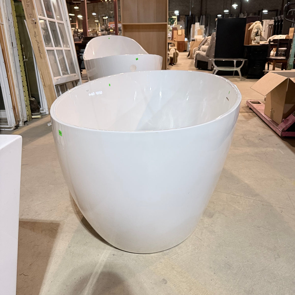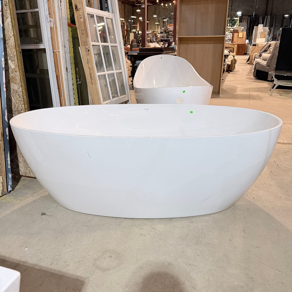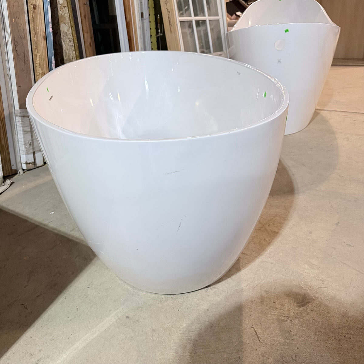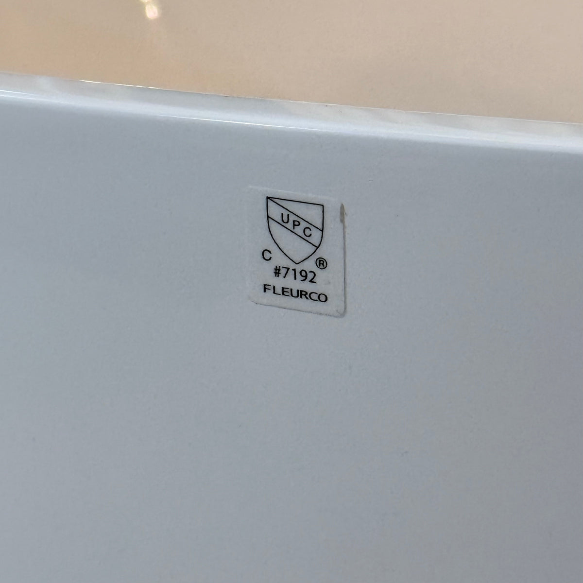 This is a previously owned Fleurco 'Aria Voce Grande' collection oval soaker bath tub. The bath tub is designed for use with a floor-mounted or wall-mounted faucet. It is made from acrylic and finished in an easy-to-clean high-gloss cast acrylic sheet. It has a slotted overflow drain on the side and a push-button drain stopper installed. Faucet and additional drain hardware not included.