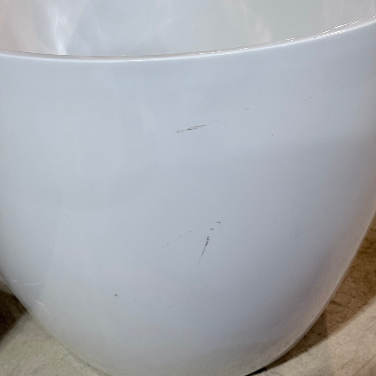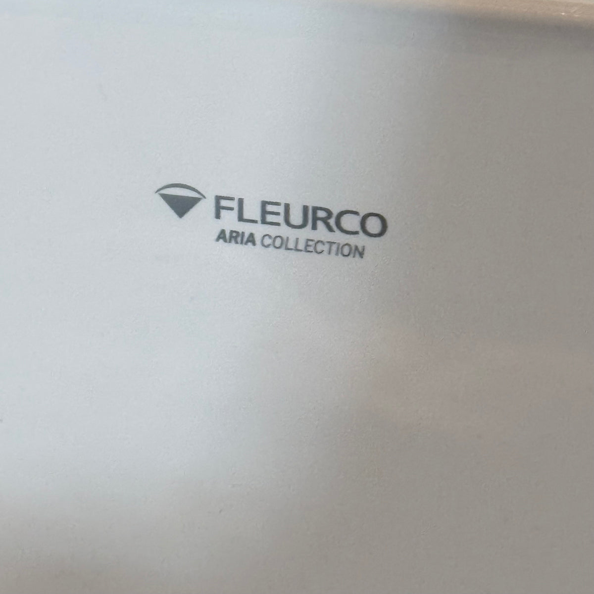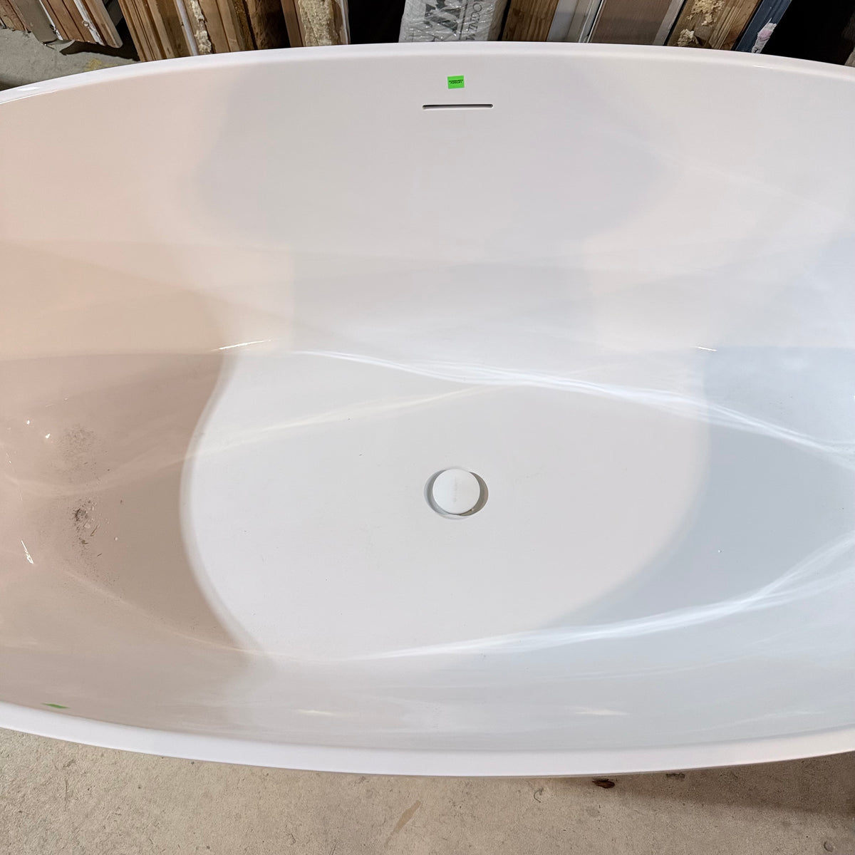 This is a previously owned Fleurco 'Aria Voce Grande' collection oval soaker bath tub. The bath tub is designed for use with a floor-mounted or wall-mounted faucet. It is made from acrylic and finished in an easy-to-clean high-gloss cast acrylic sheet. It has a slotted overflow drain on the side and a push-button drain stopper installed. Faucet and additional drain hardware not included.