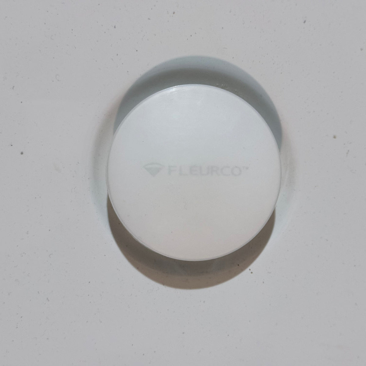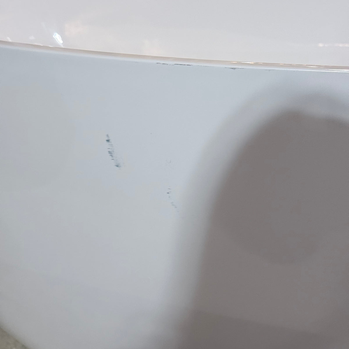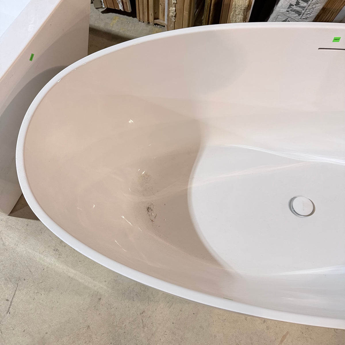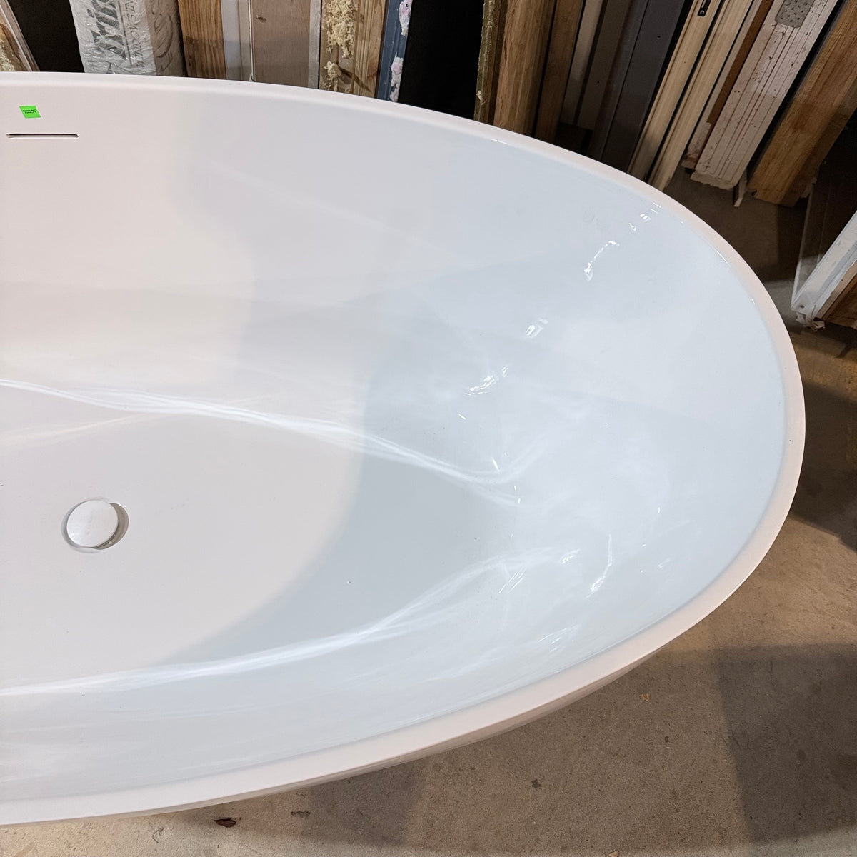 This is a previously owned Fleurco 'Aria Voce Grande' collection oval soaker bath tub. The bath tub is designed for use with a floor-mounted or wall-mounted faucet. It is made from acrylic and finished in an easy-to-clean high-gloss cast acrylic sheet. It has a slotted overflow drain on the side and a push-button drain stopper installed. Faucet and additional drain hardware not included.