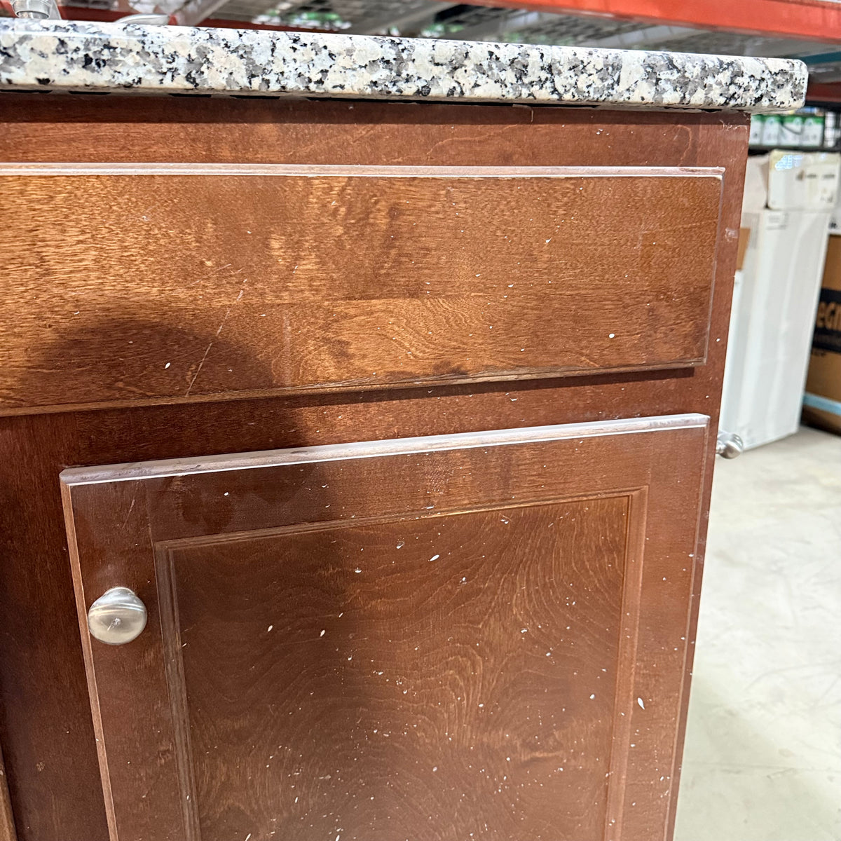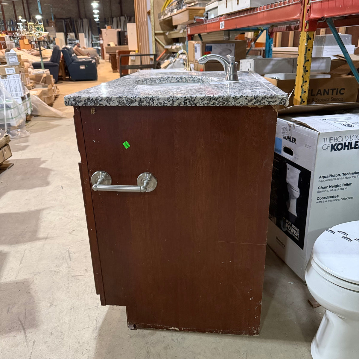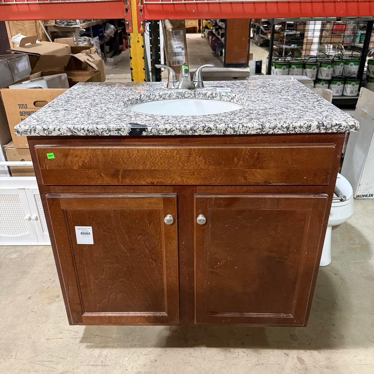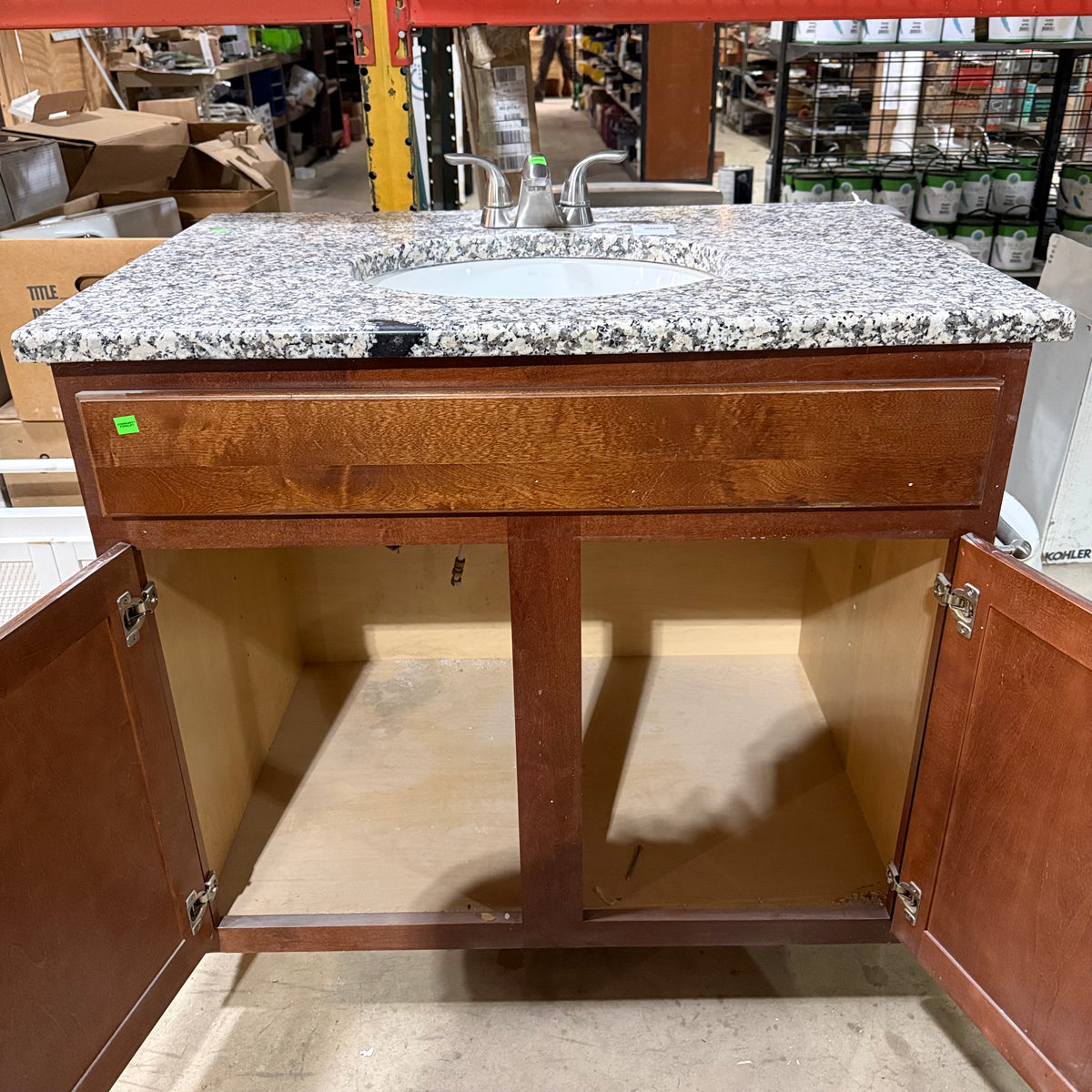 This product is a previously owned single bathroom vanity. It features a granite countertop with a white undermount Kohler sink that comes with nickel brushed faucet and draining hardware installed. It sits on a stained cabinet base with ample storage space behind the double doors. Both sides of the vanity are finished. There is also a toilet paper roll holder attached on the right.