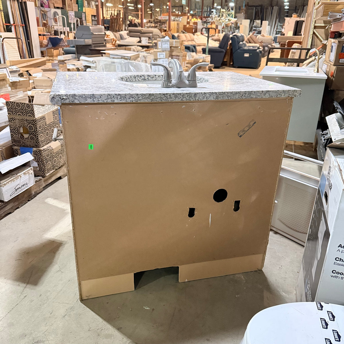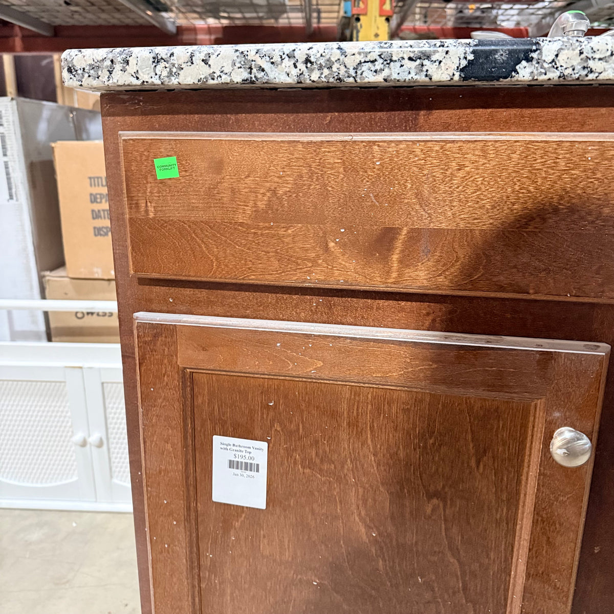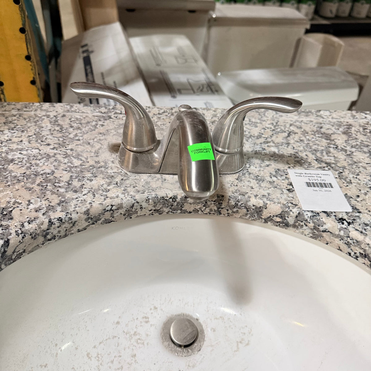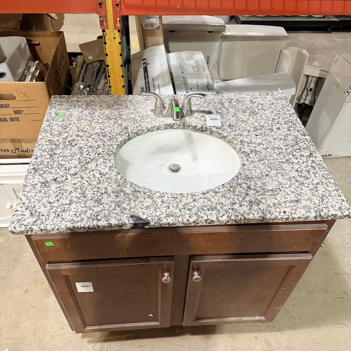 This product is a previously owned single bathroom vanity. It features a granite countertop with a white undermount Kohler sink that comes with nickel brushed faucet and draining hardware installed. It sits on a stained cabinet base with ample storage space behind the double doors. Both sides of the vanity are finished. There is also a toilet paper roll holder attached on the right.