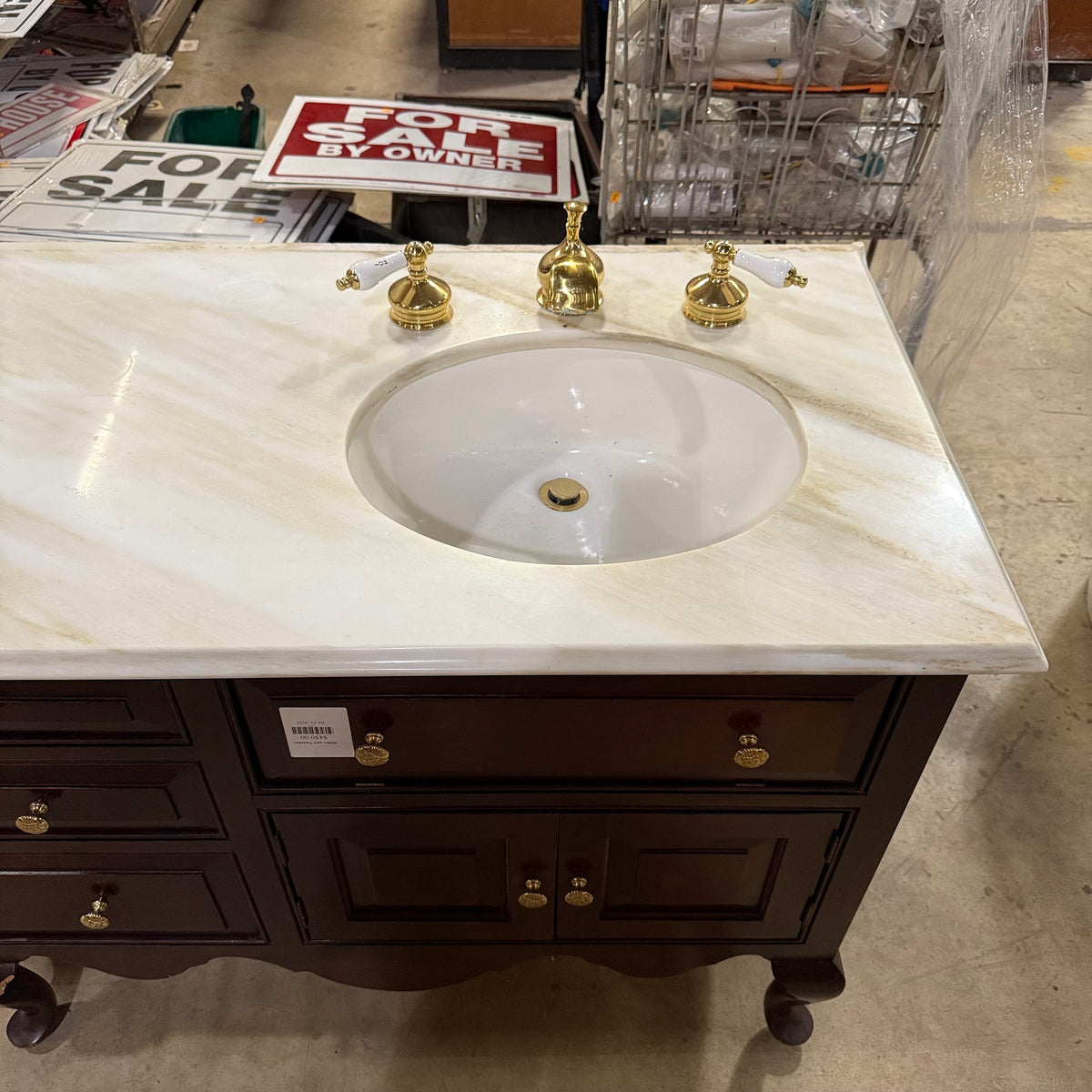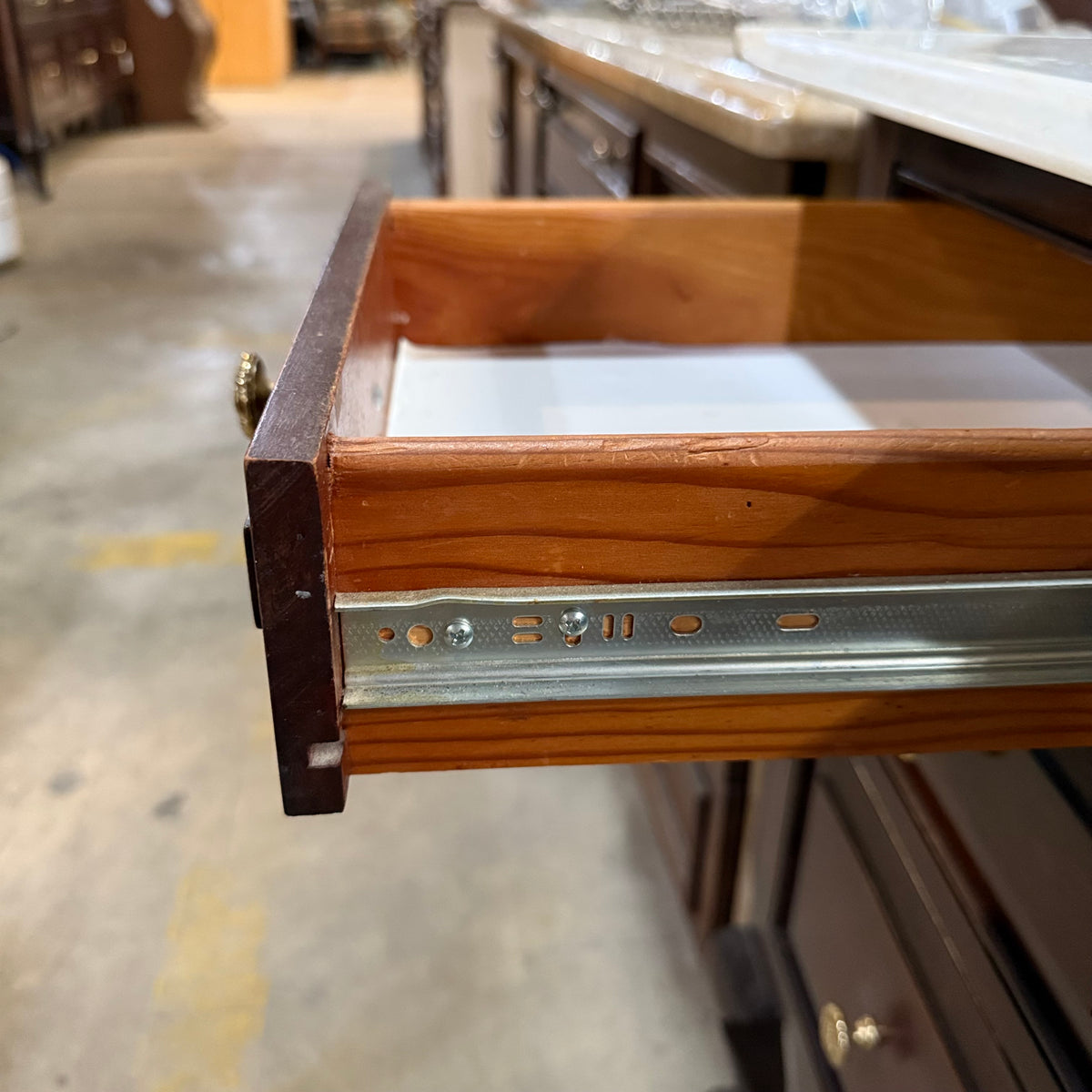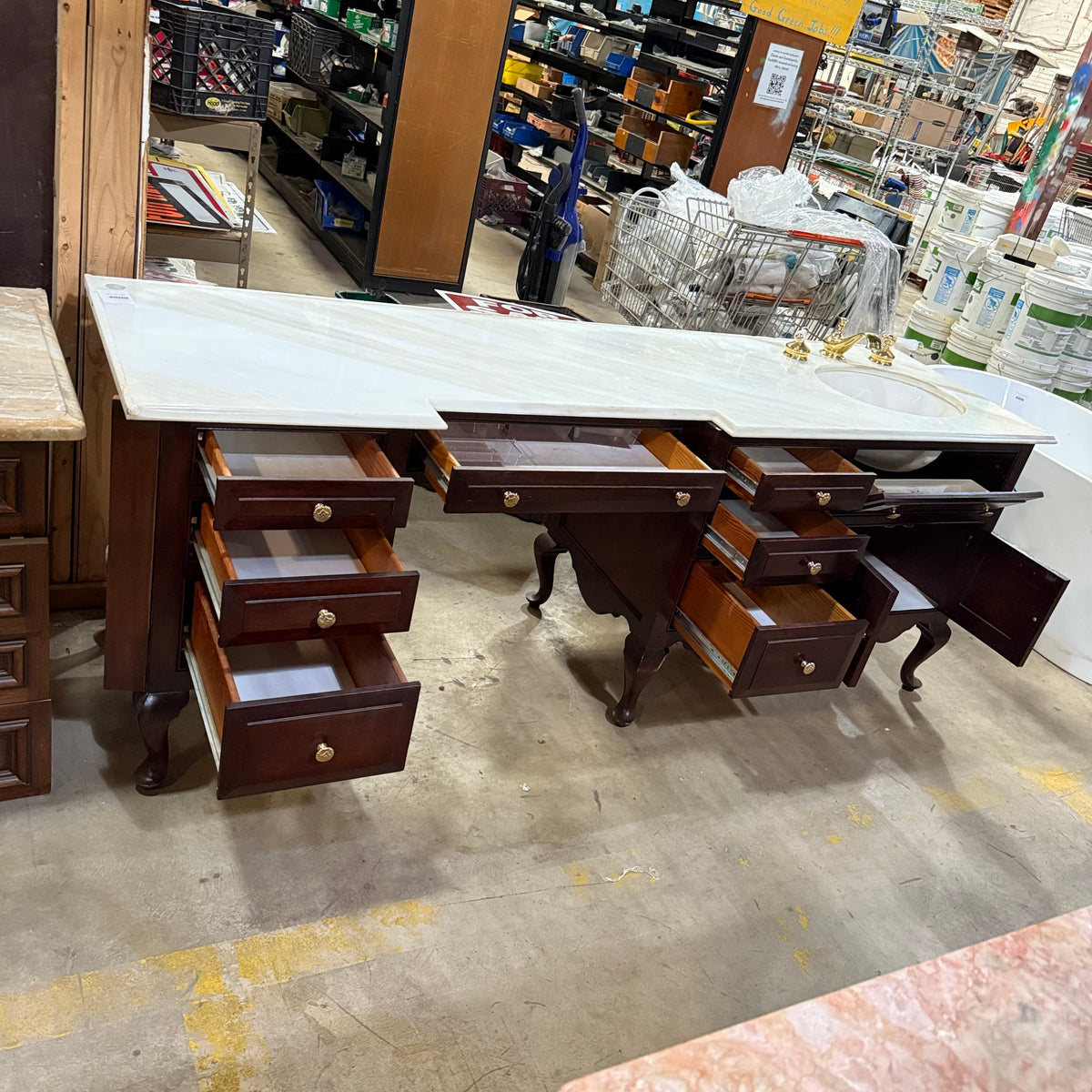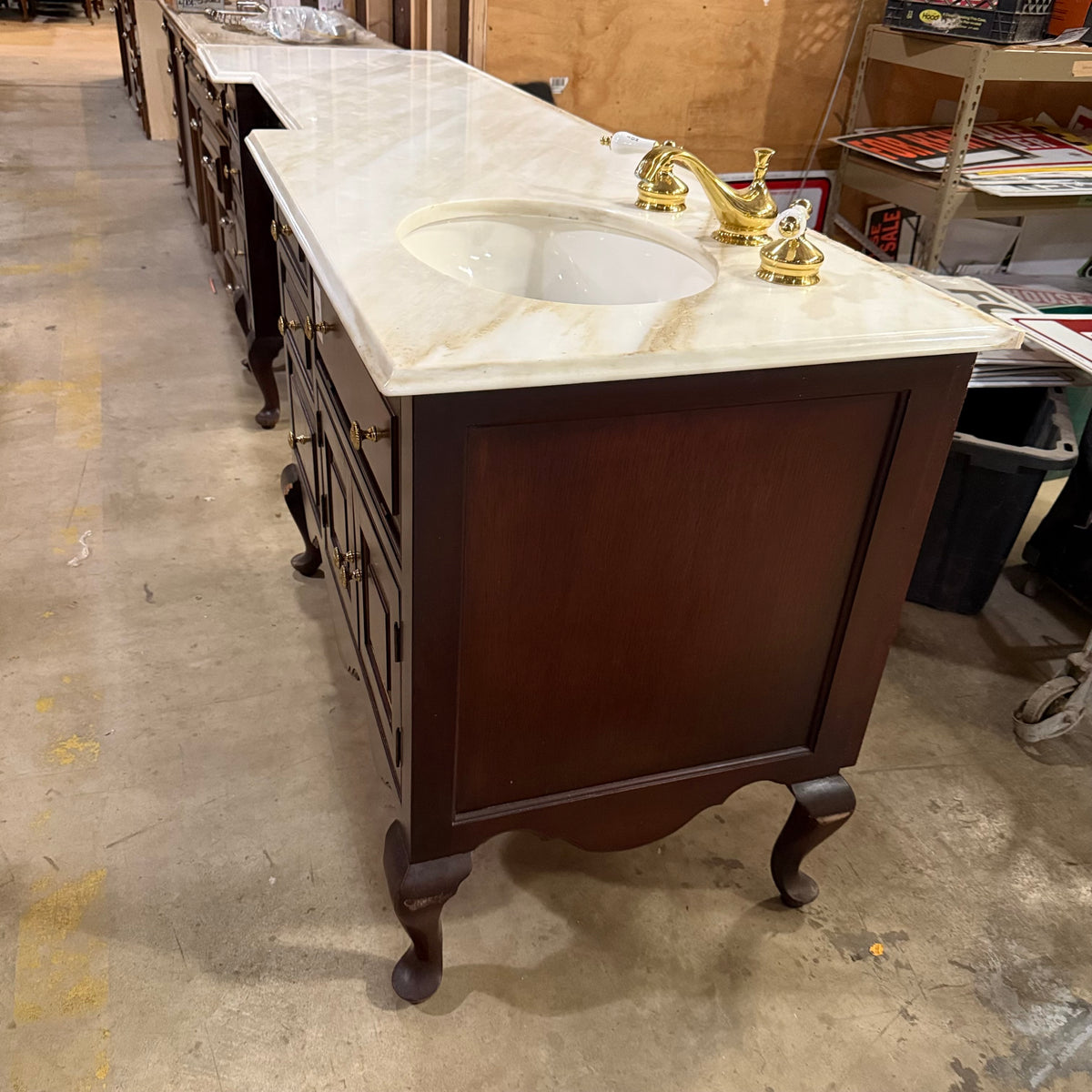 This freestanding single bathroom vanity features a stone countertop with a white, undermount sink installed to the far right, and brass faucet and draining hardware included. The handles are marked with handles marked 'Hot' and 'Cold'. The base consists of a cherry stained cabinet base with a total of seven drawers and a storage cabinet to the far right underneath the tip-out drawer. Both sides of the base are finished.