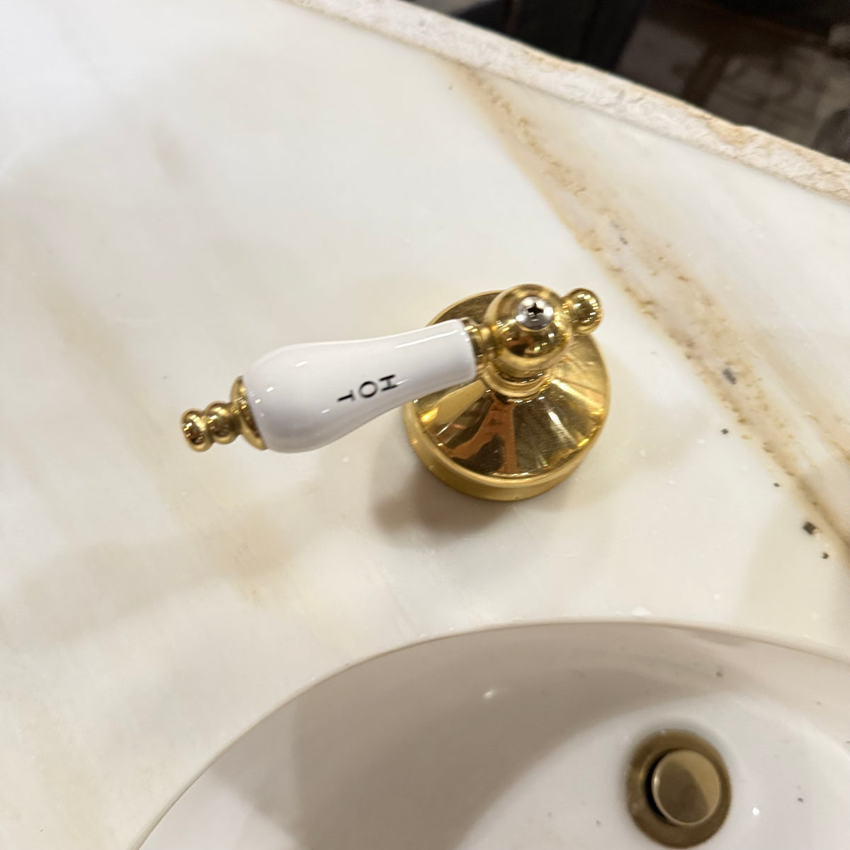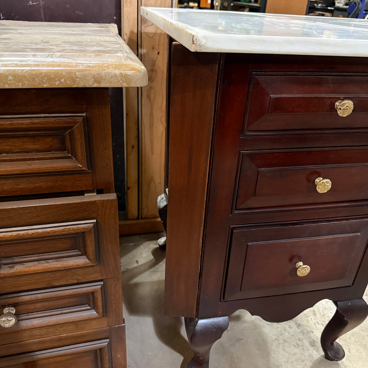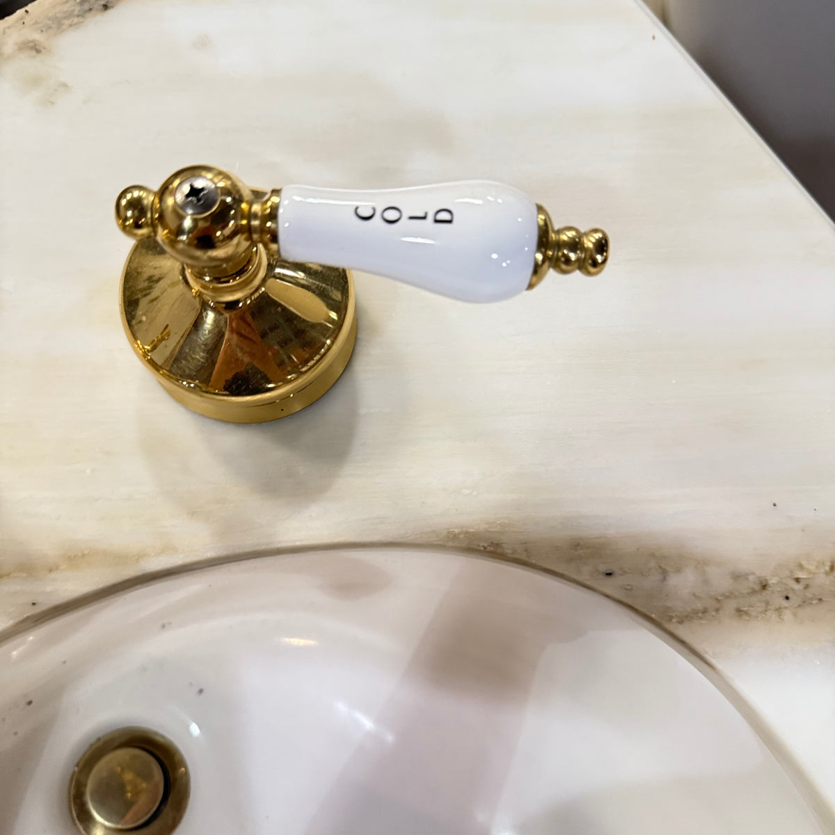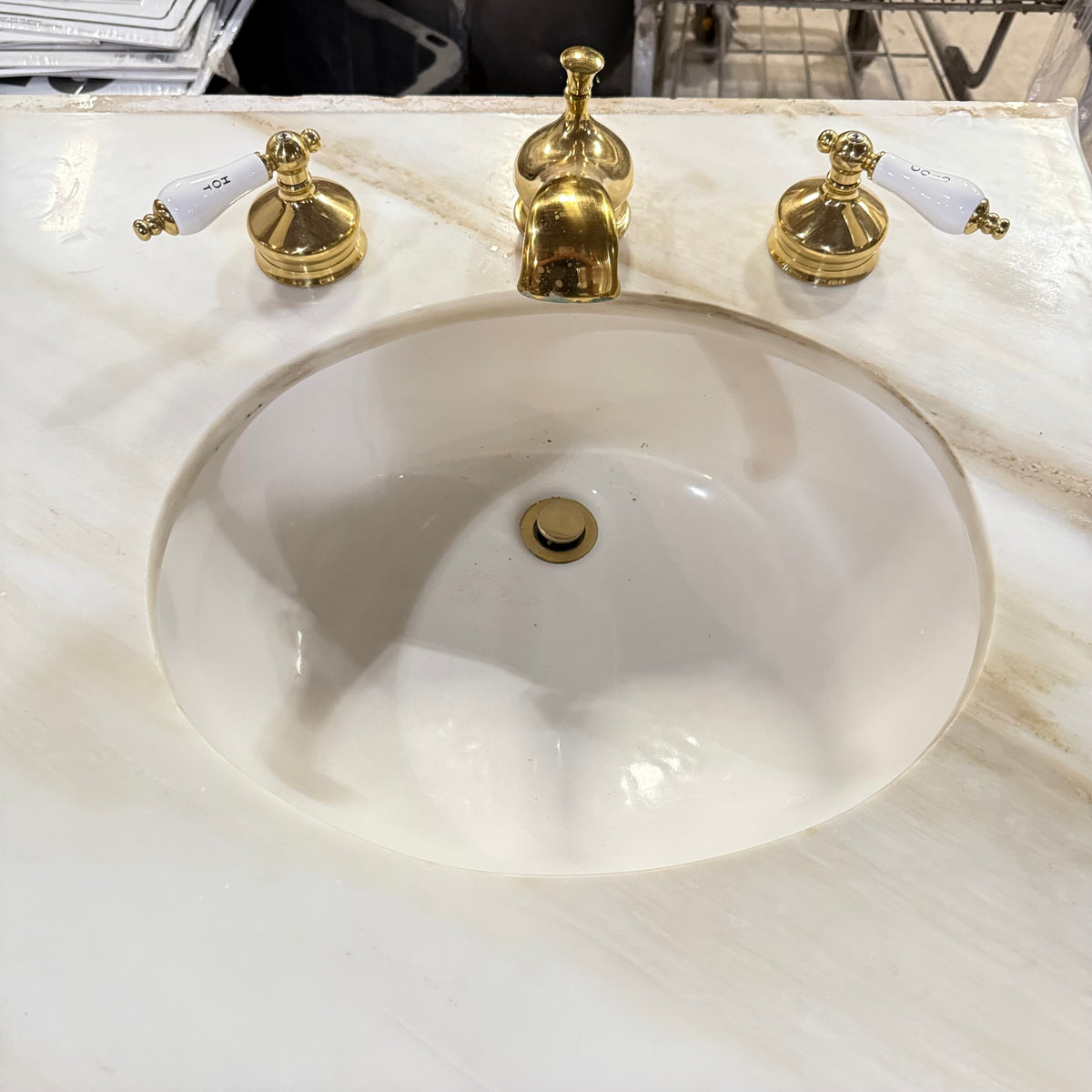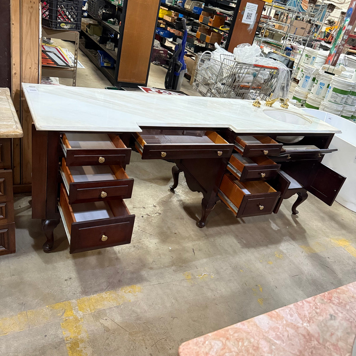 This freestanding single bathroom vanity features a stone countertop with a white, undermount sink installed to the far right, and brass faucet and draining hardware included. The handles are marked with handles marked 'Hot' and 'Cold'. The base consists of a cherry stained cabinet base with a total of seven drawers and a storage cabinet to the far right underneath the tip-out drawer. Both sides of the base are finished.