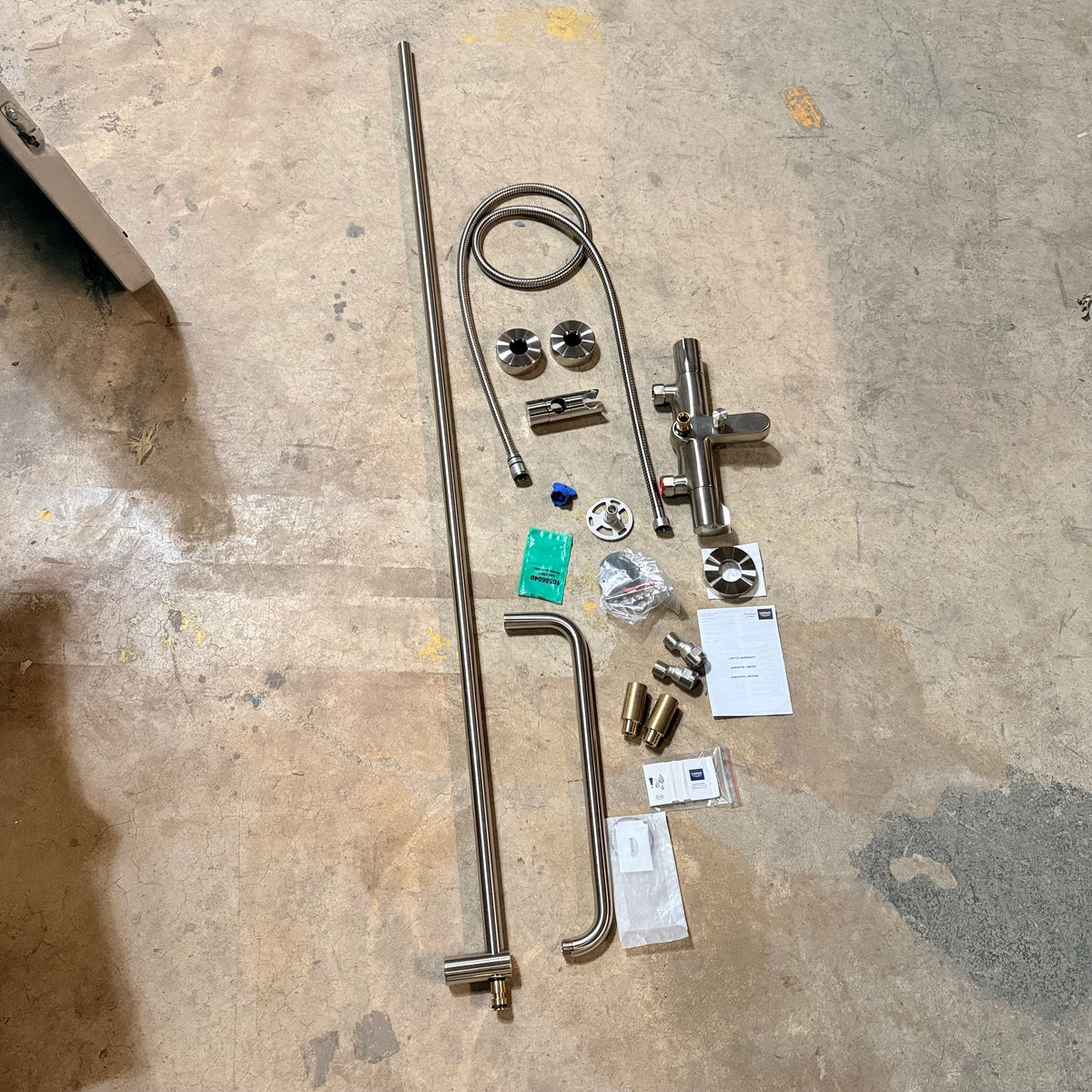 This product is a never-installed, Grohe Euphoria® thermostatic tub/shower system in brushed nickel. Features: