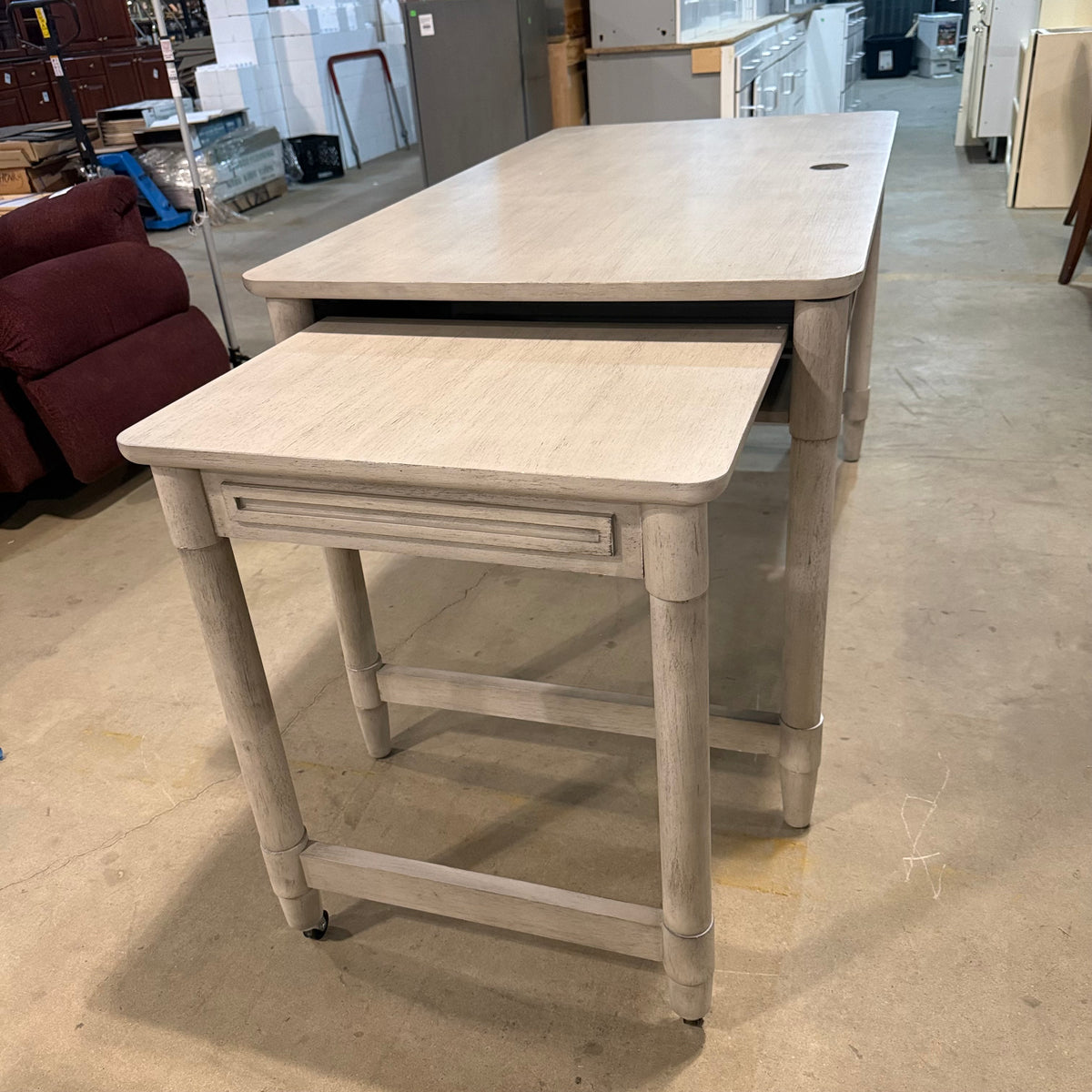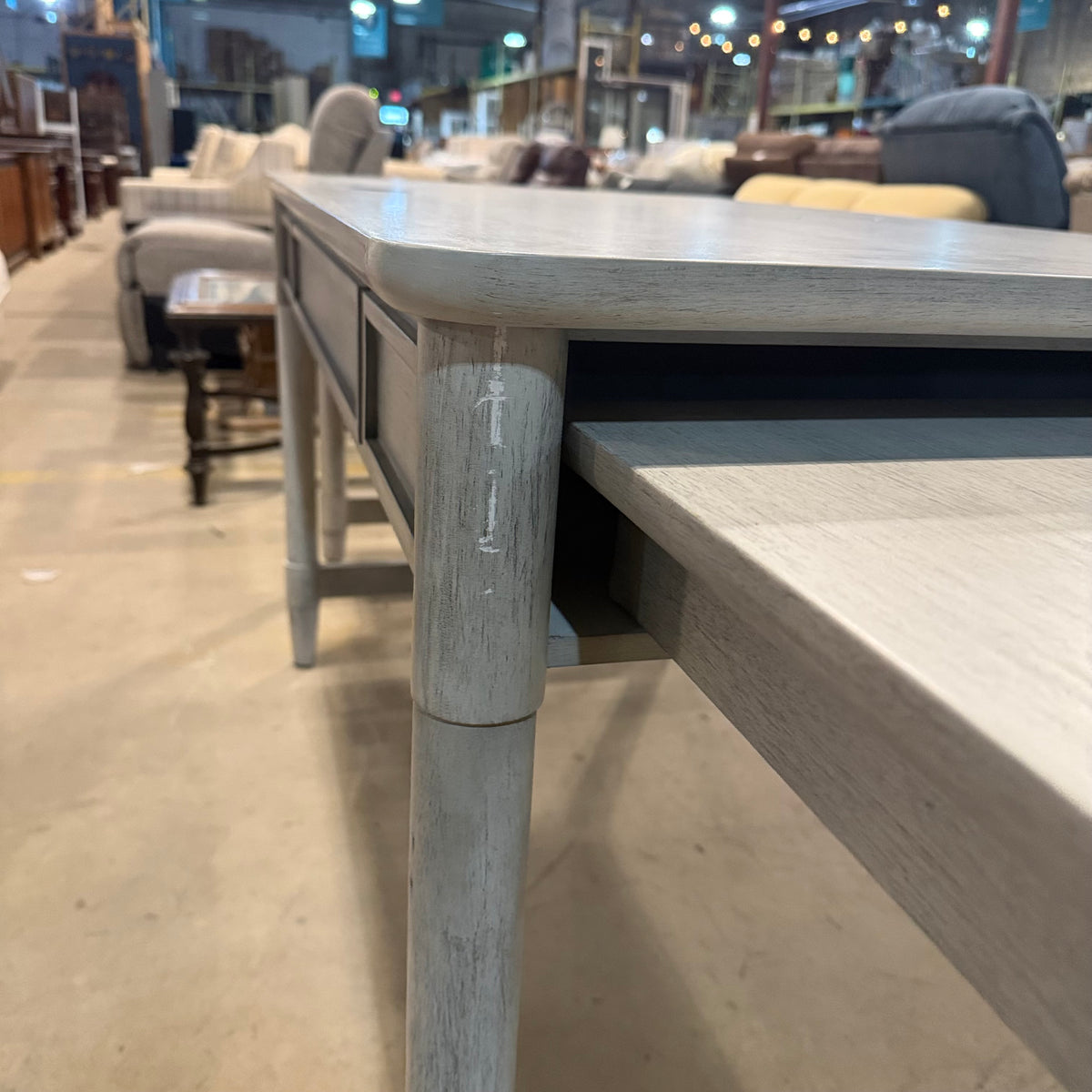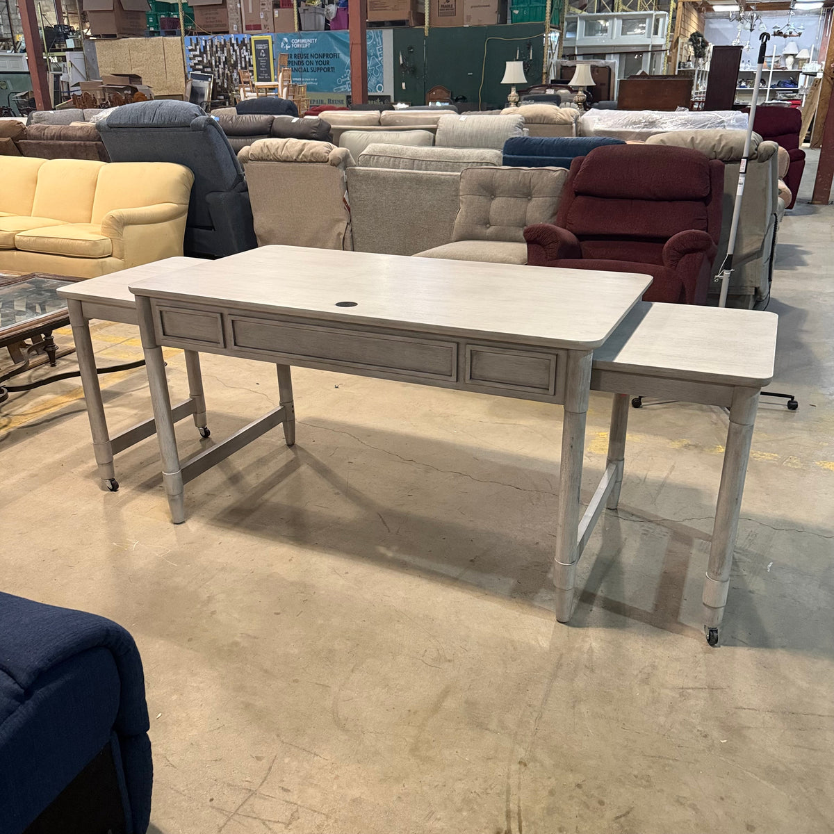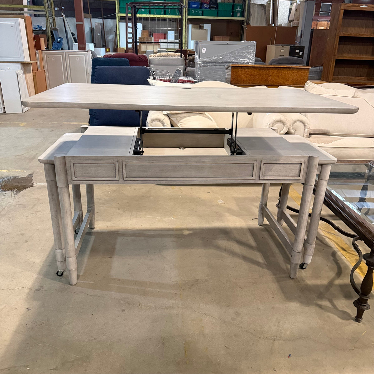 This product is a previously owned drafting desk with a lift-top by Hammary Furniture from their 'Domaine' collection. It sits on a straight feet and is constructed with mahogany veneers in a taupe patina finish. This desk has a leaf at either side that rolls out easily making multifunctional use of this desk. It can be used in many different ways, whether its to be used as a standing desk with the lift-top raised up or with with both leaves fully extended out for maximum workspace and functionality.