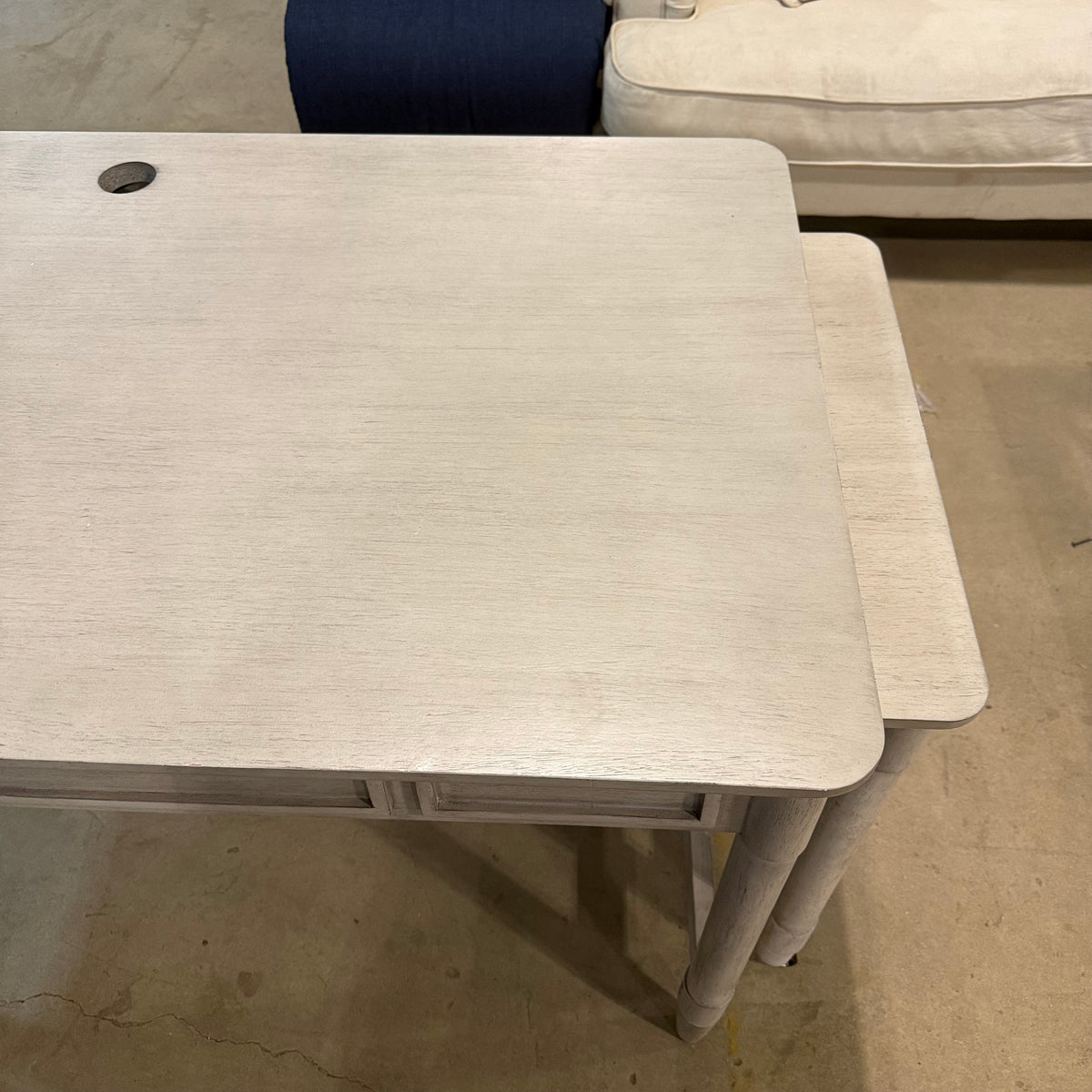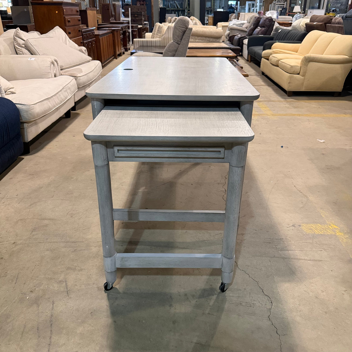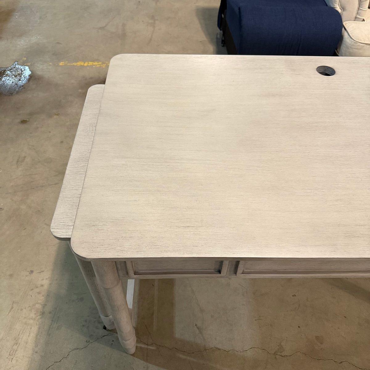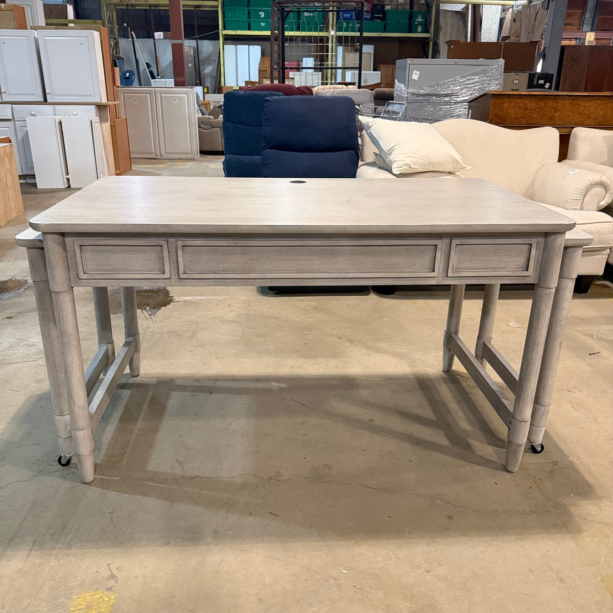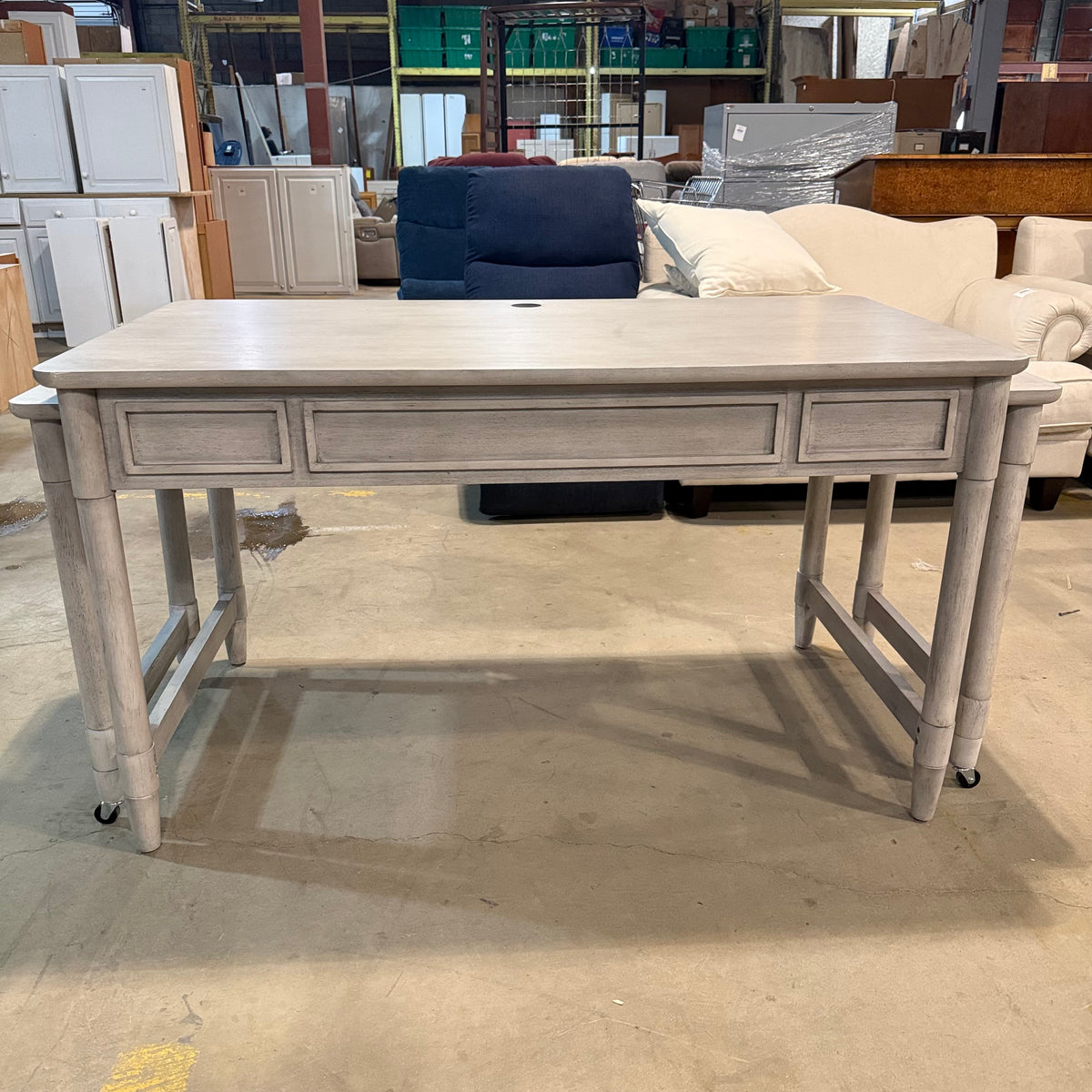 This product is a previously owned drafting desk with a lift-top by Hammary Furniture from their 'Domaine' collection. It sits on a straight feet and is constructed with mahogany veneers in a taupe patina finish. This desk has a leaf at either side that rolls out easily making multifunctional use of this desk. It can be used in many different ways, whether its to be used as a standing desk with the lift-top raised up or with with both leaves fully extended out for maximum workspace and functionality.