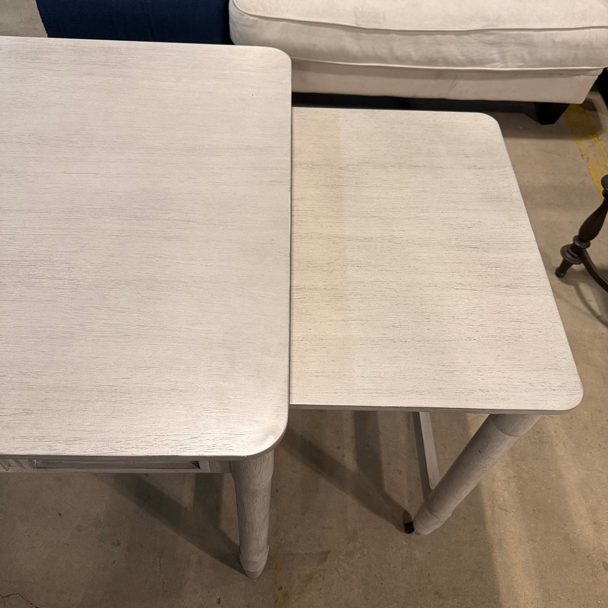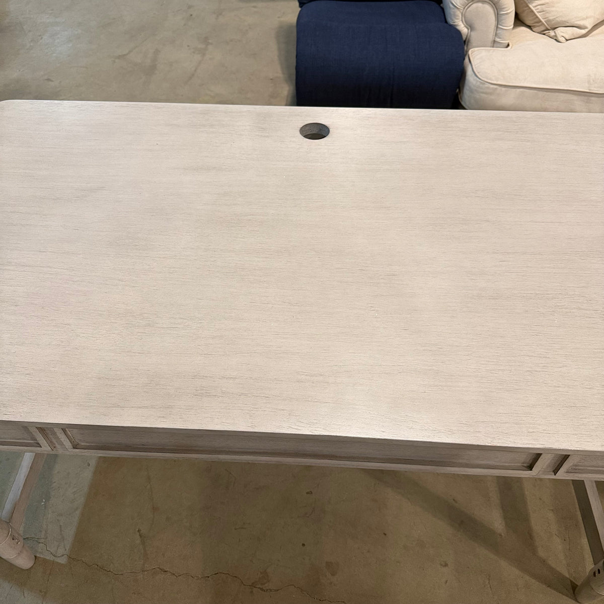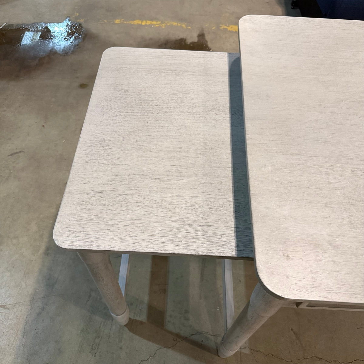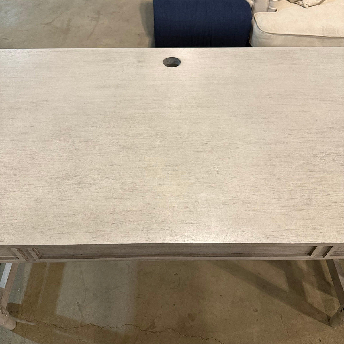 This product is a previously owned drafting desk with a lift-top by Hammary Furniture from their 'Domaine' collection. It sits on a straight feet and is constructed with mahogany veneers in a taupe patina finish. This desk has a leaf at either side that rolls out easily making multifunctional use of this desk. It can be used in many different ways, whether its to be used as a standing desk with the lift-top raised up or with with both leaves fully extended out for maximum workspace and functionality.