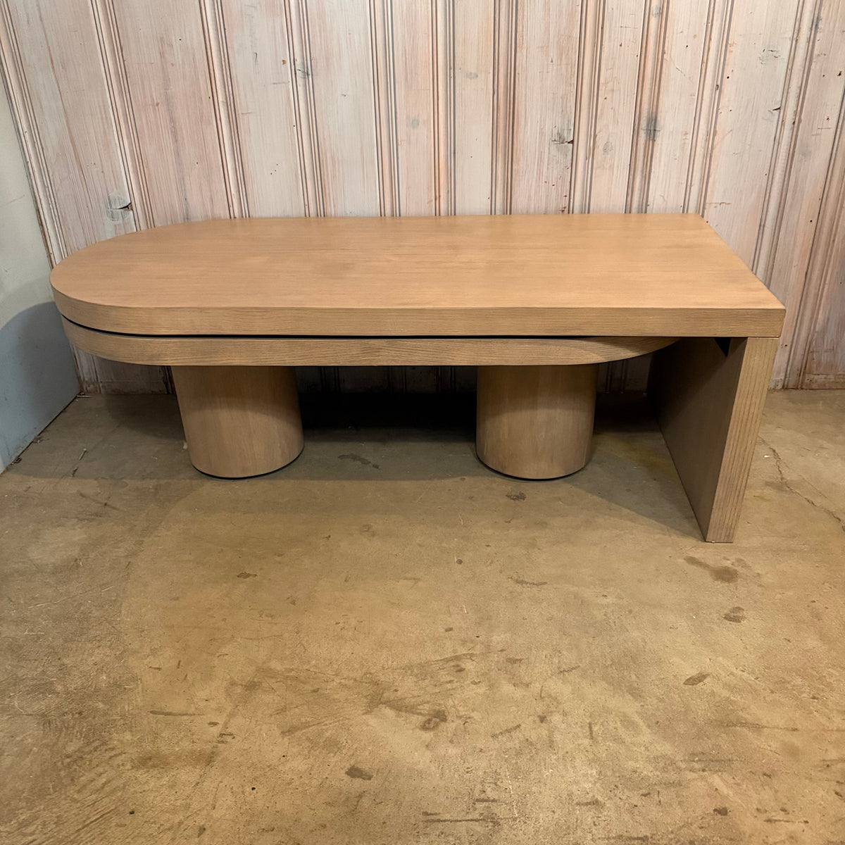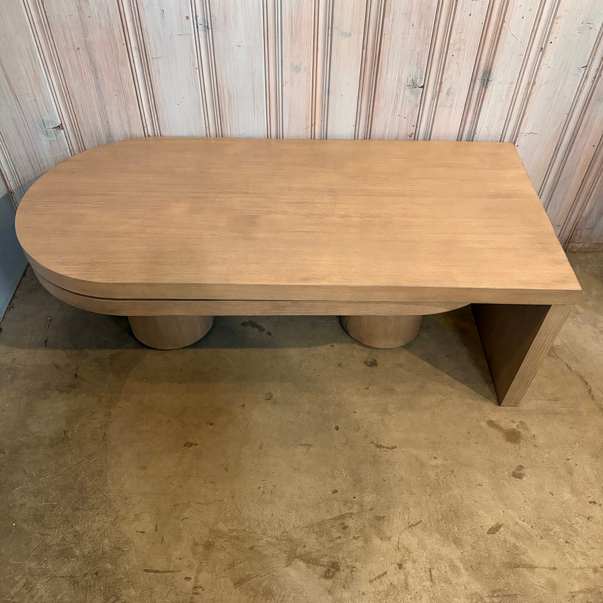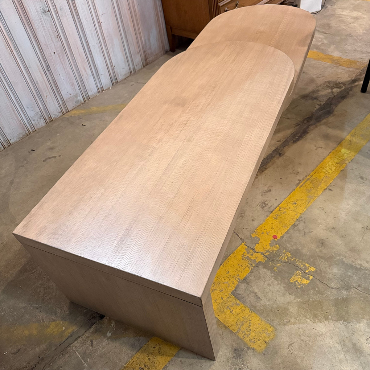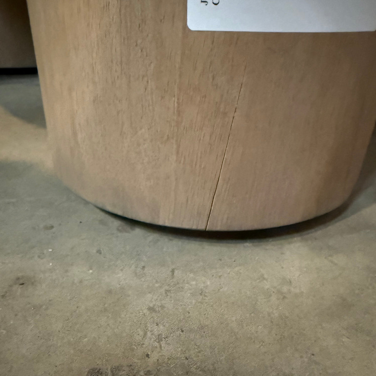 Please note, there is some fading and wear to the rounded edge portion of this coffee table along the edge. There is also a hairline crack to the wood on one of the round, hefty feet (see photos).