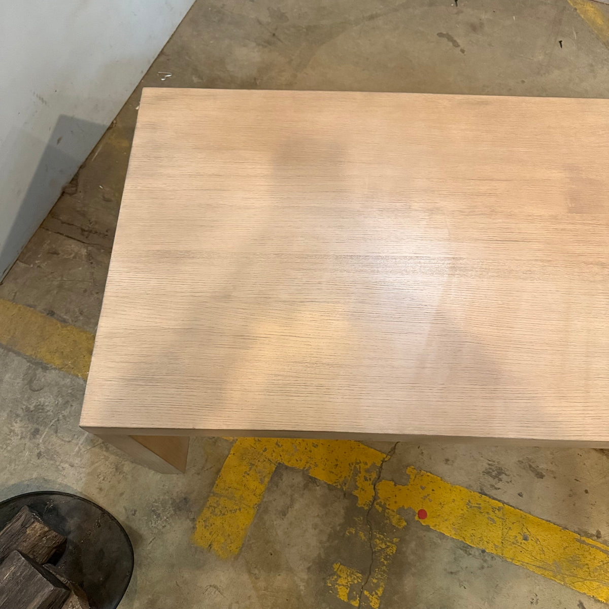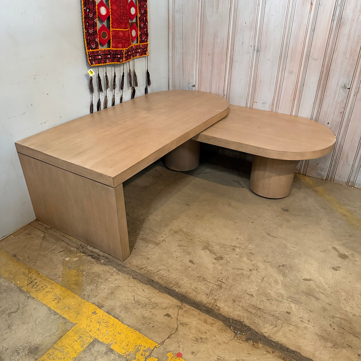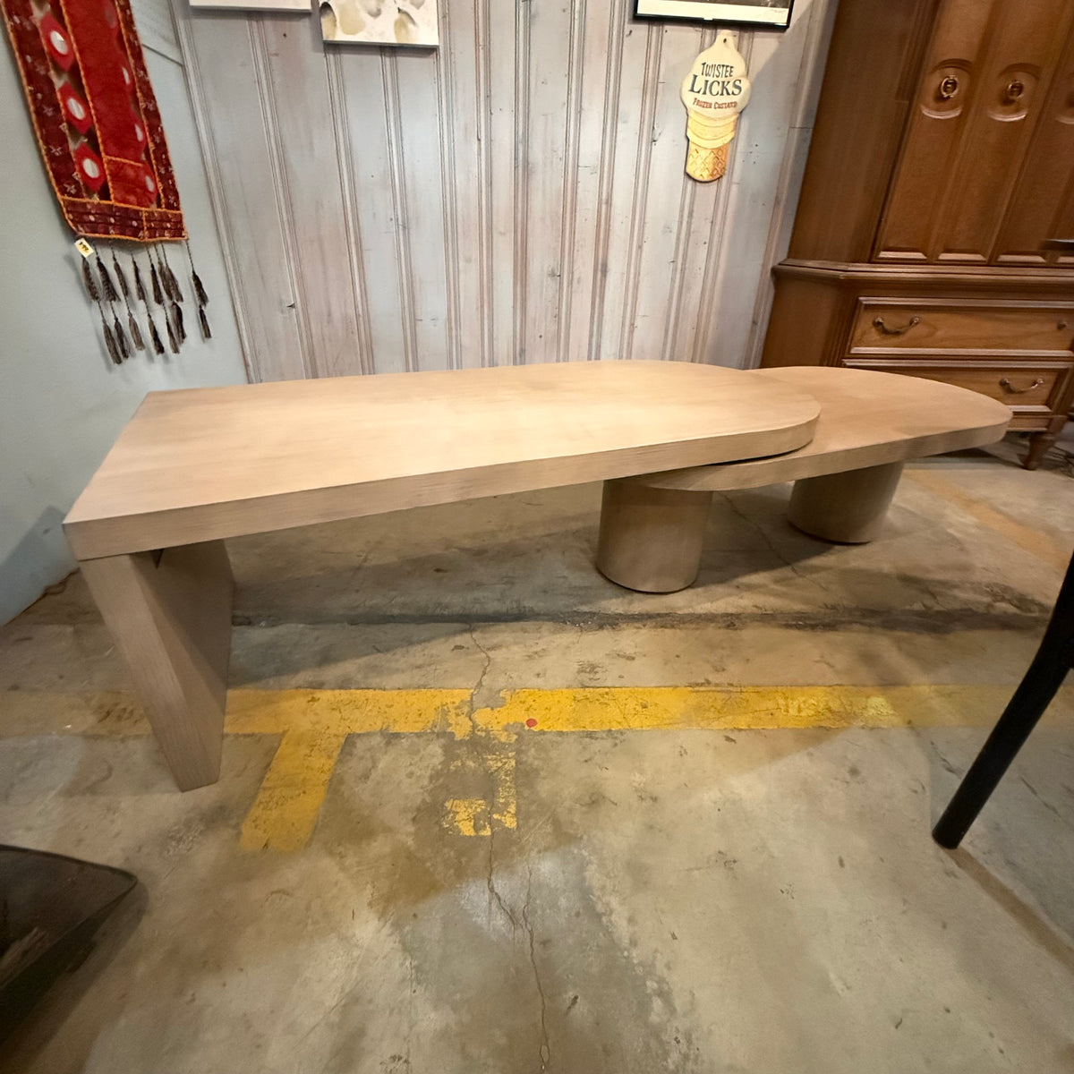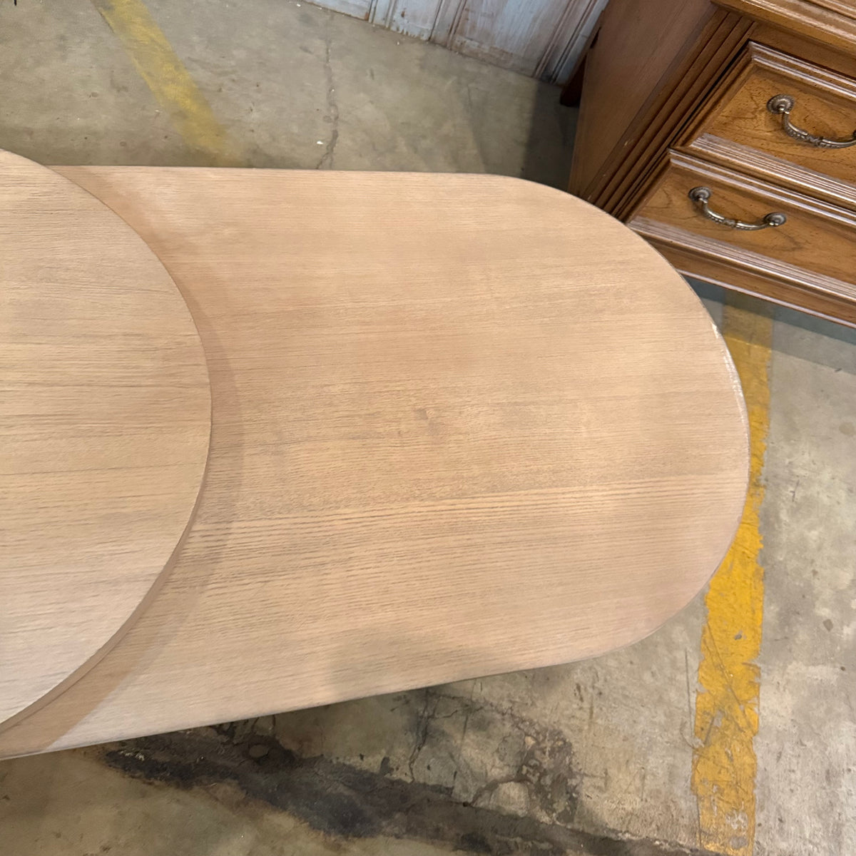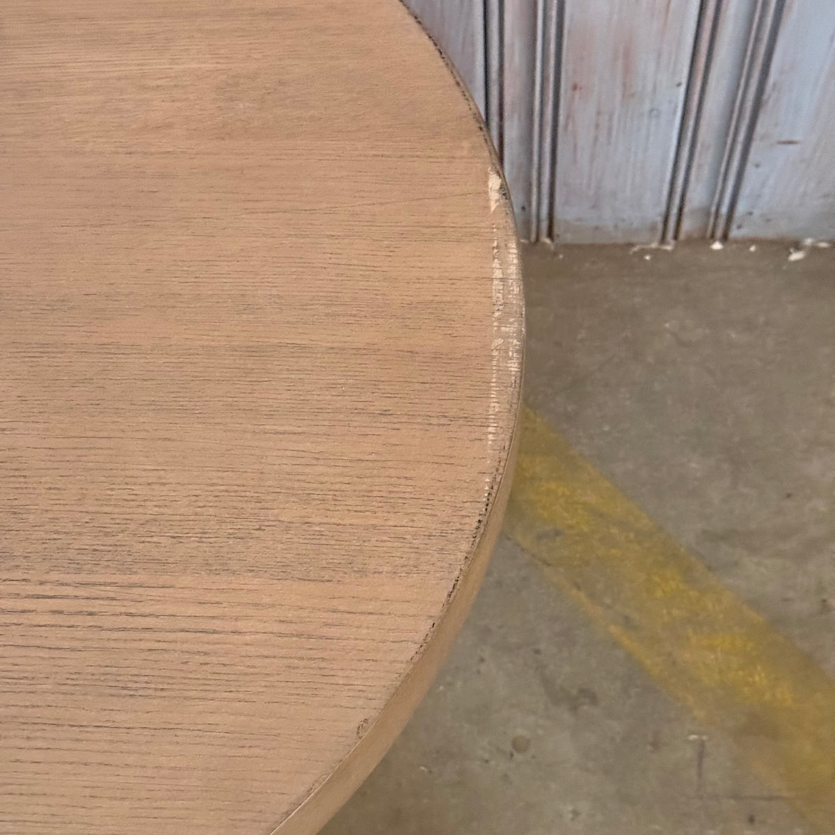 Please note, there is some fading and wear to the rounded edge portion of this coffee table along the edge. There is also a hairline crack to the wood on one of the round, hefty feet (see photos).