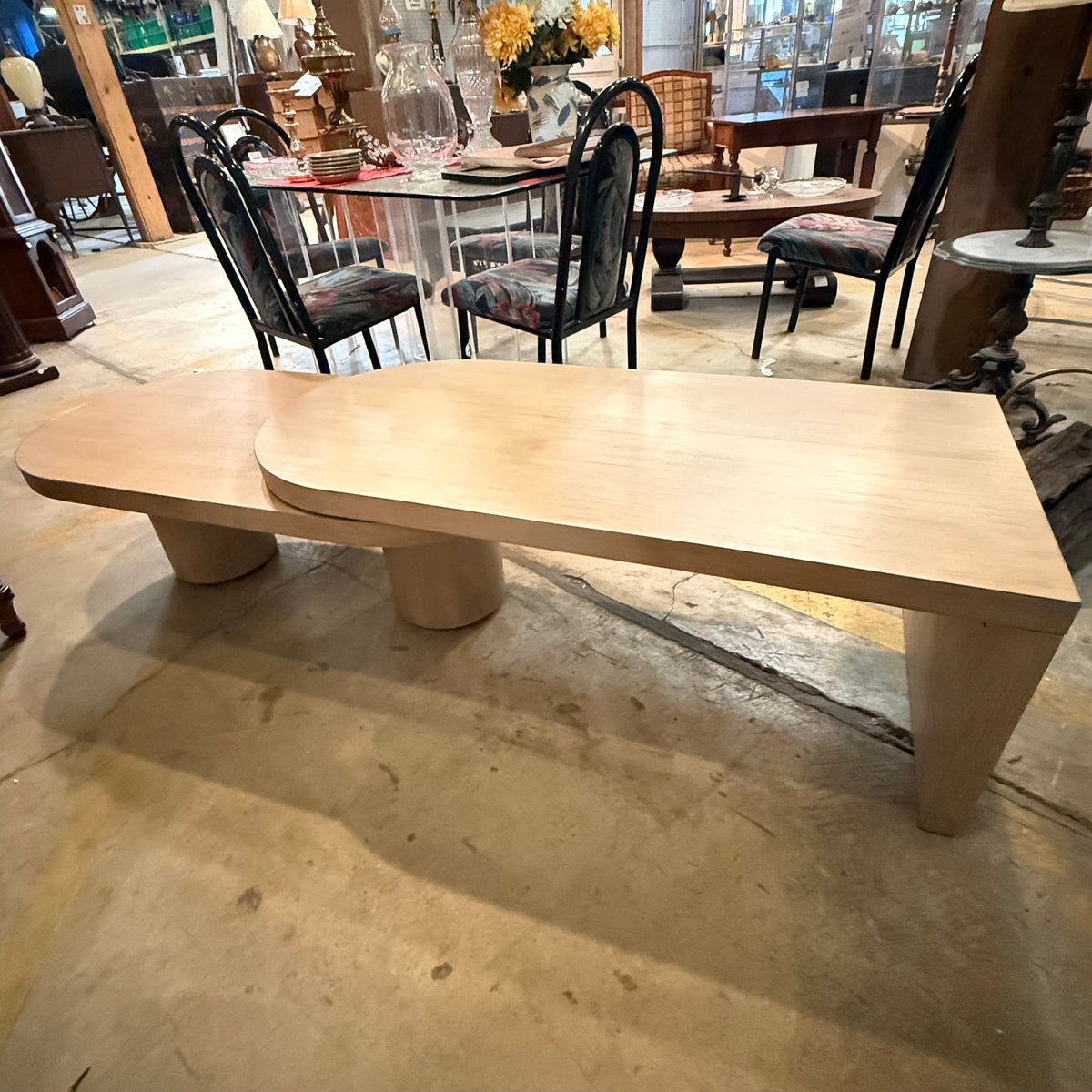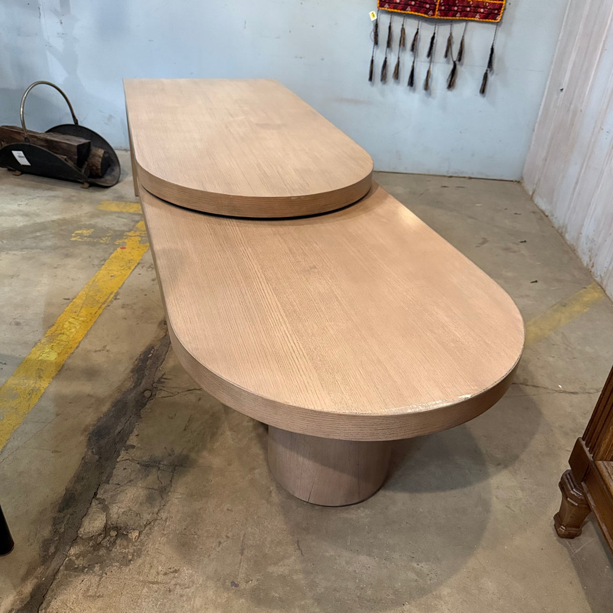 This product is a previously owned swivel coffee table by Hammary Furniture from their 'Indiya' collection. It sits on a hefty pedestal base and is finished with quartered ash veneers. This coffee table can be configured in many different ways whether its stowed away and compact, for use as a corner table, or fully extended.