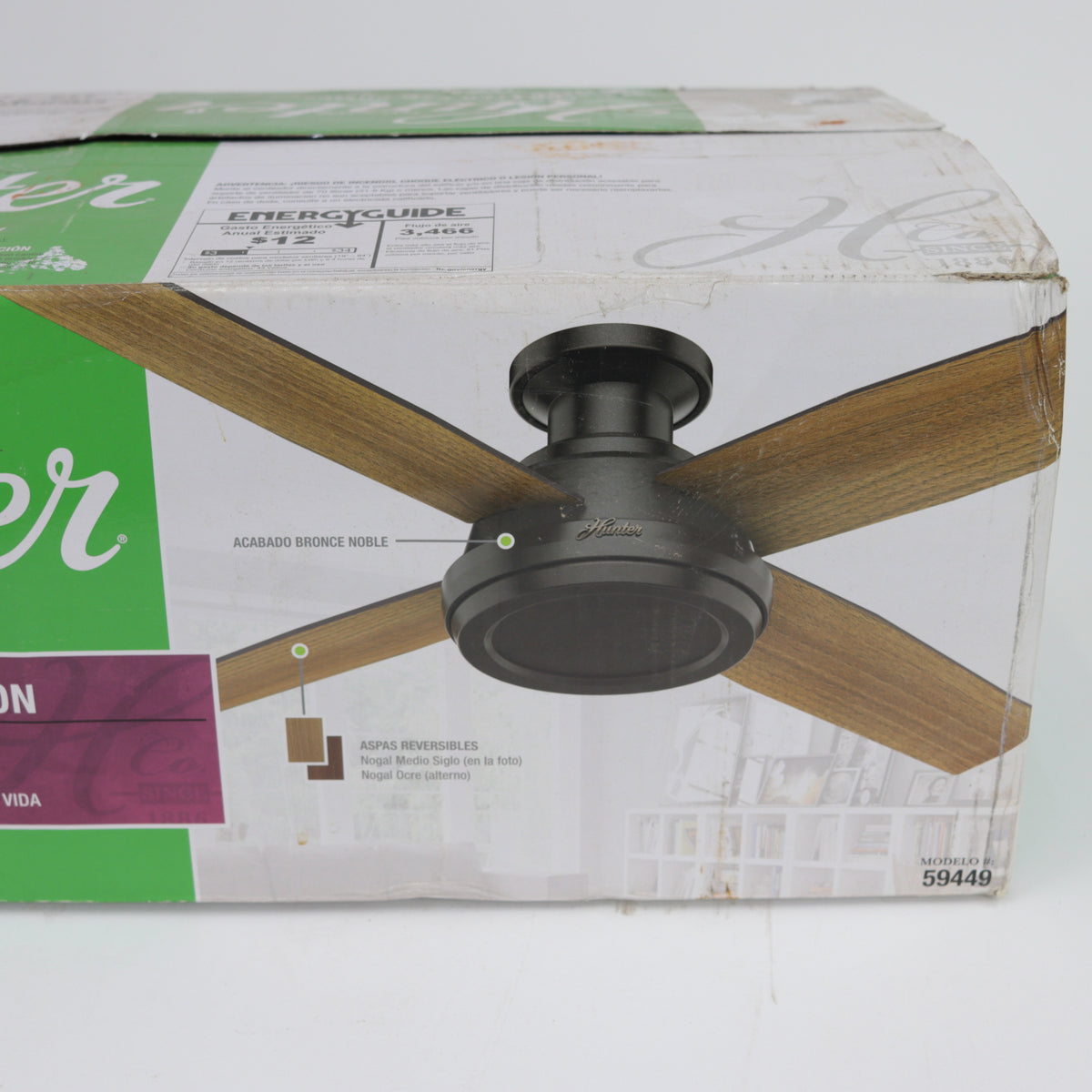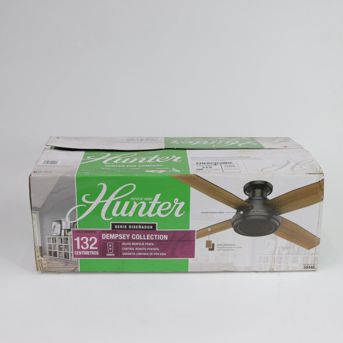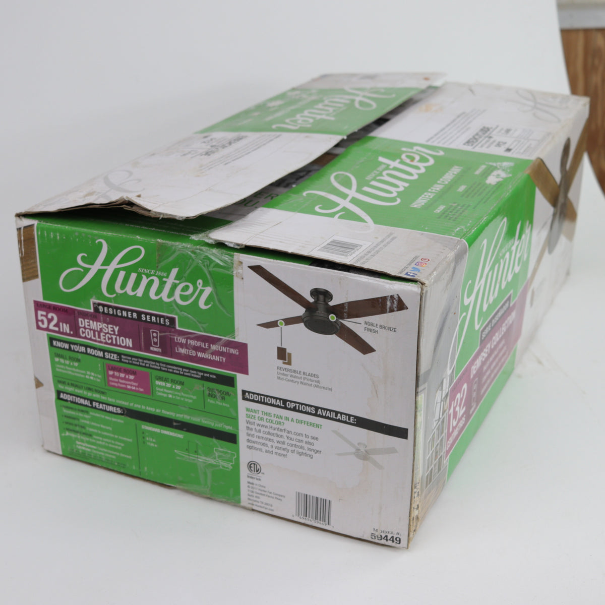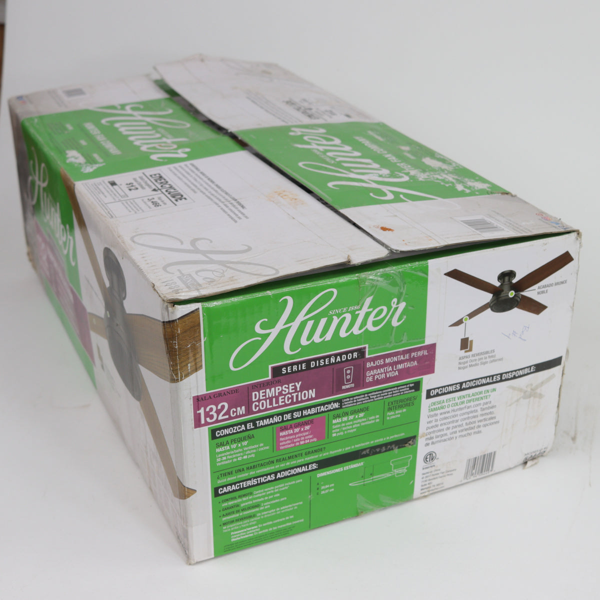 This is a new, in open-box Hunter 'Dempsey' 52" ceiling fan. Its box has been opened to inspect the contents.
