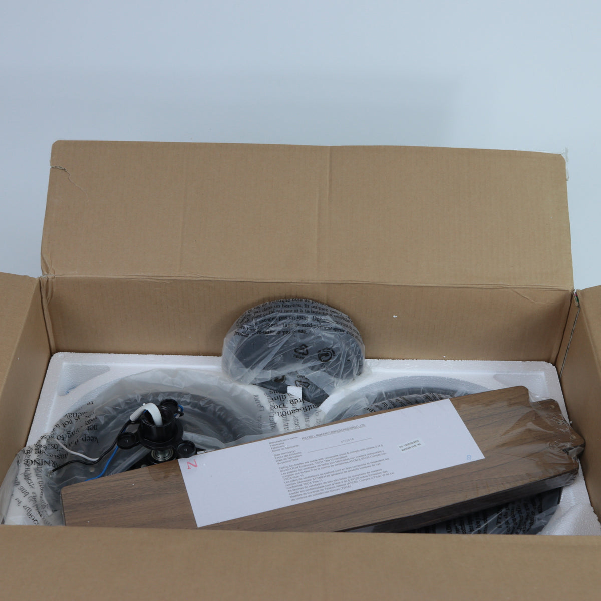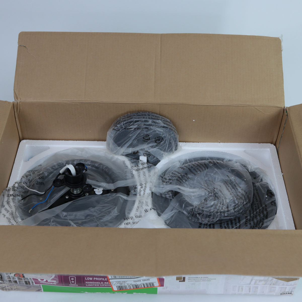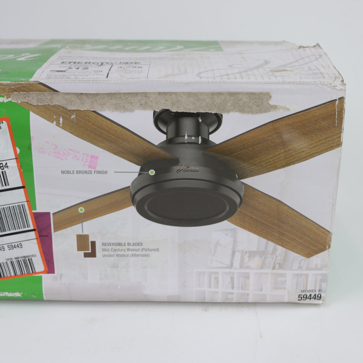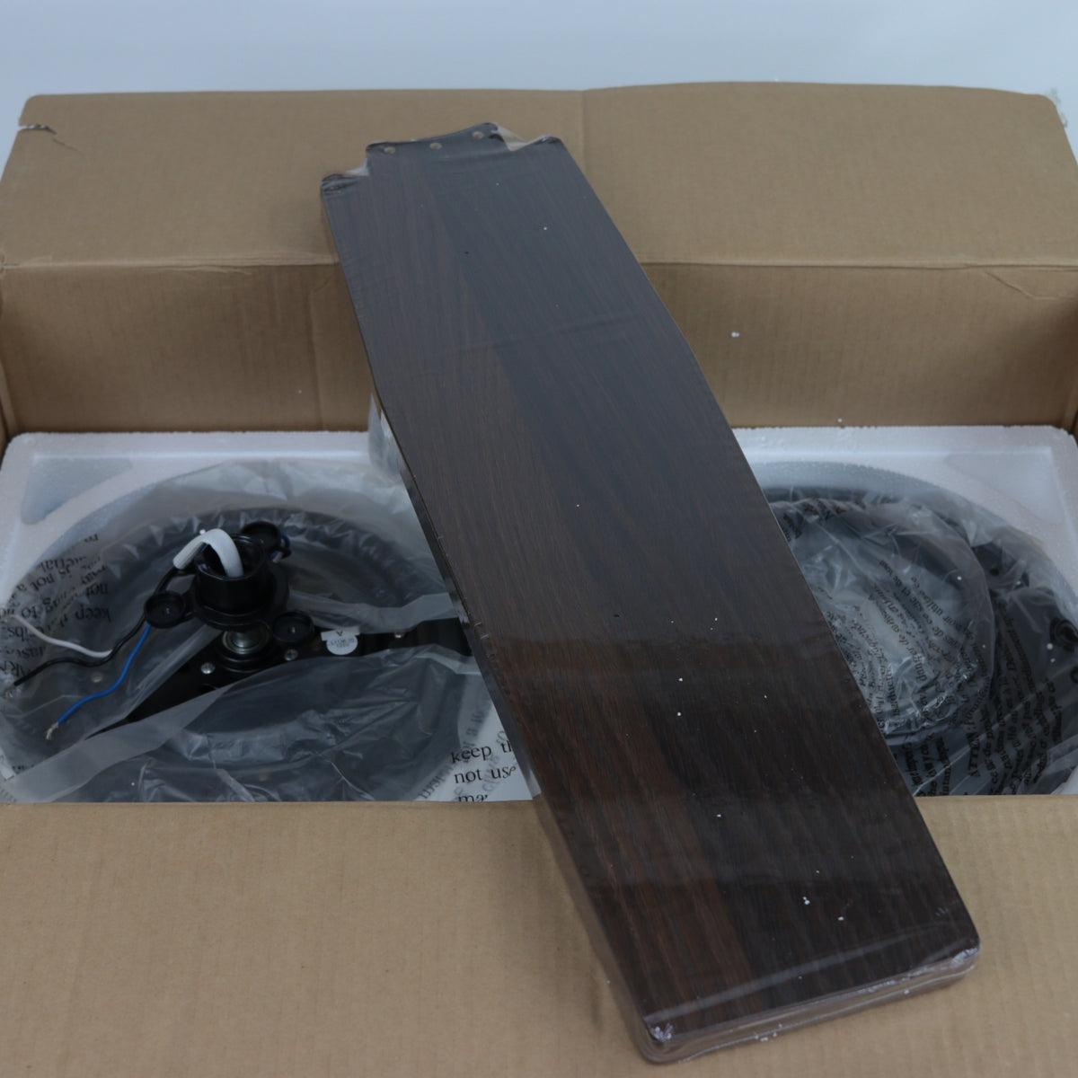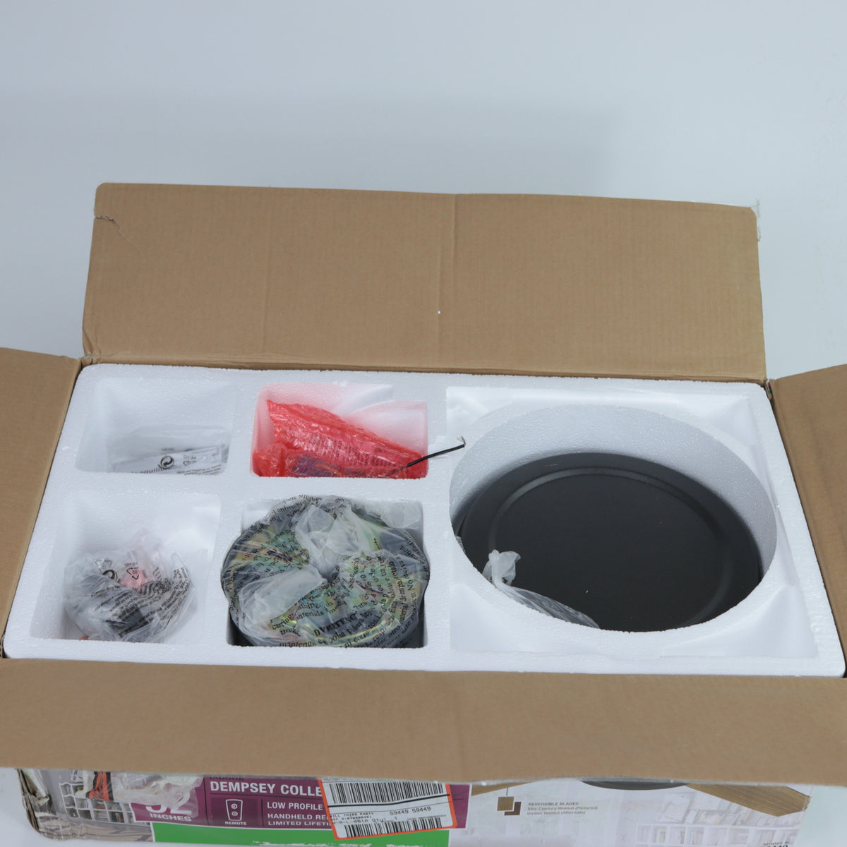 This is a new, in open-box Hunter 'Dempsey' 52" ceiling fan. Its box has been opened to inspect the contents.