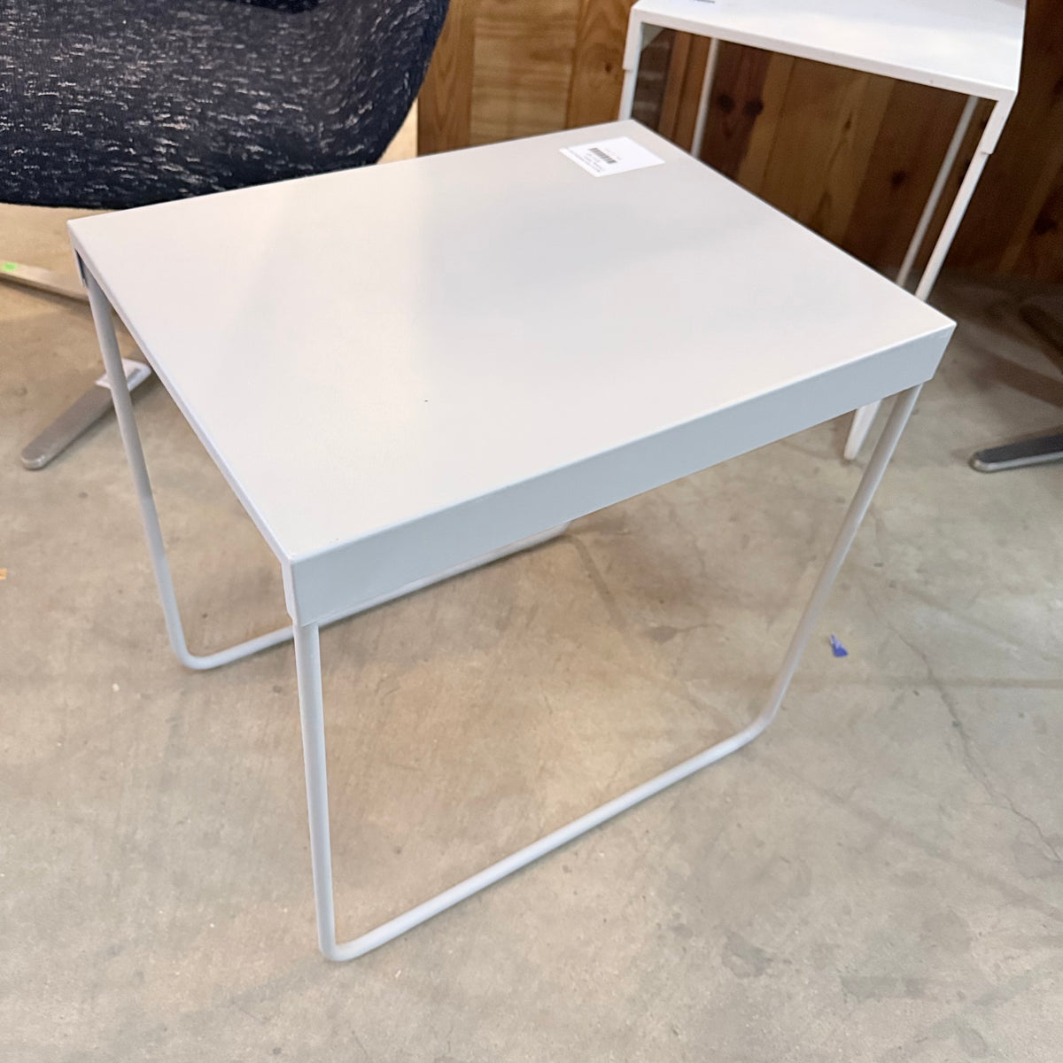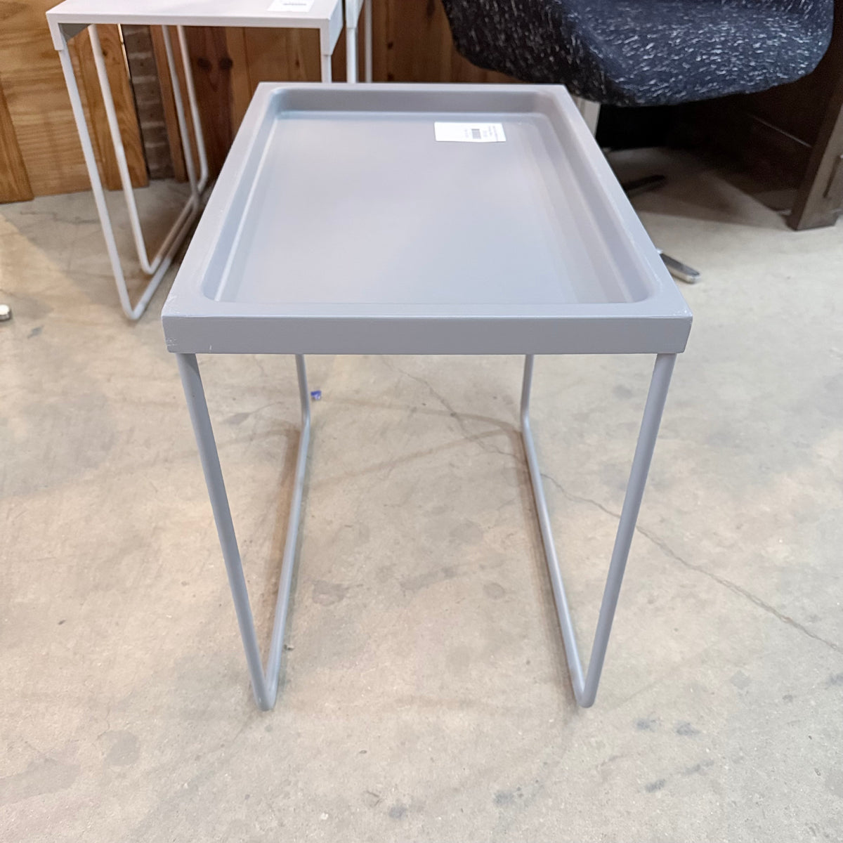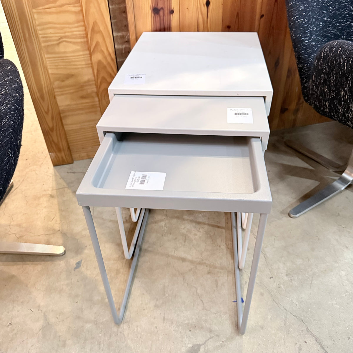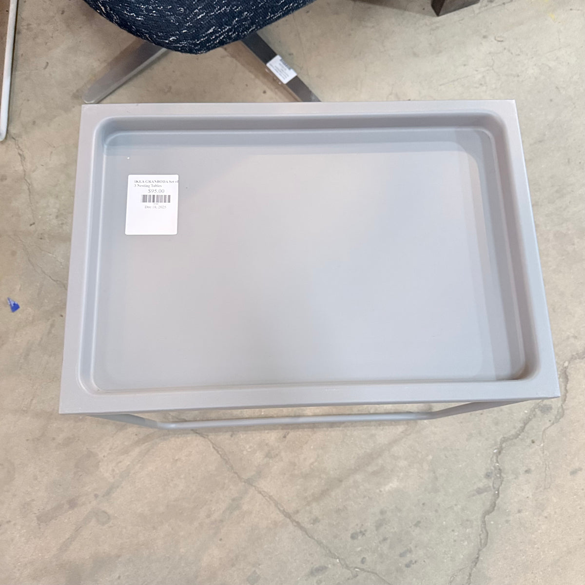 This is a set of 3 IKEA GRANBODA nesting tables. The tables sit on slim, metal bases with rubber caps on the bottom and have durable, powder-coated steel surface tops. The smallest table has raised edges, serving as a tray to keep items from sliding off.