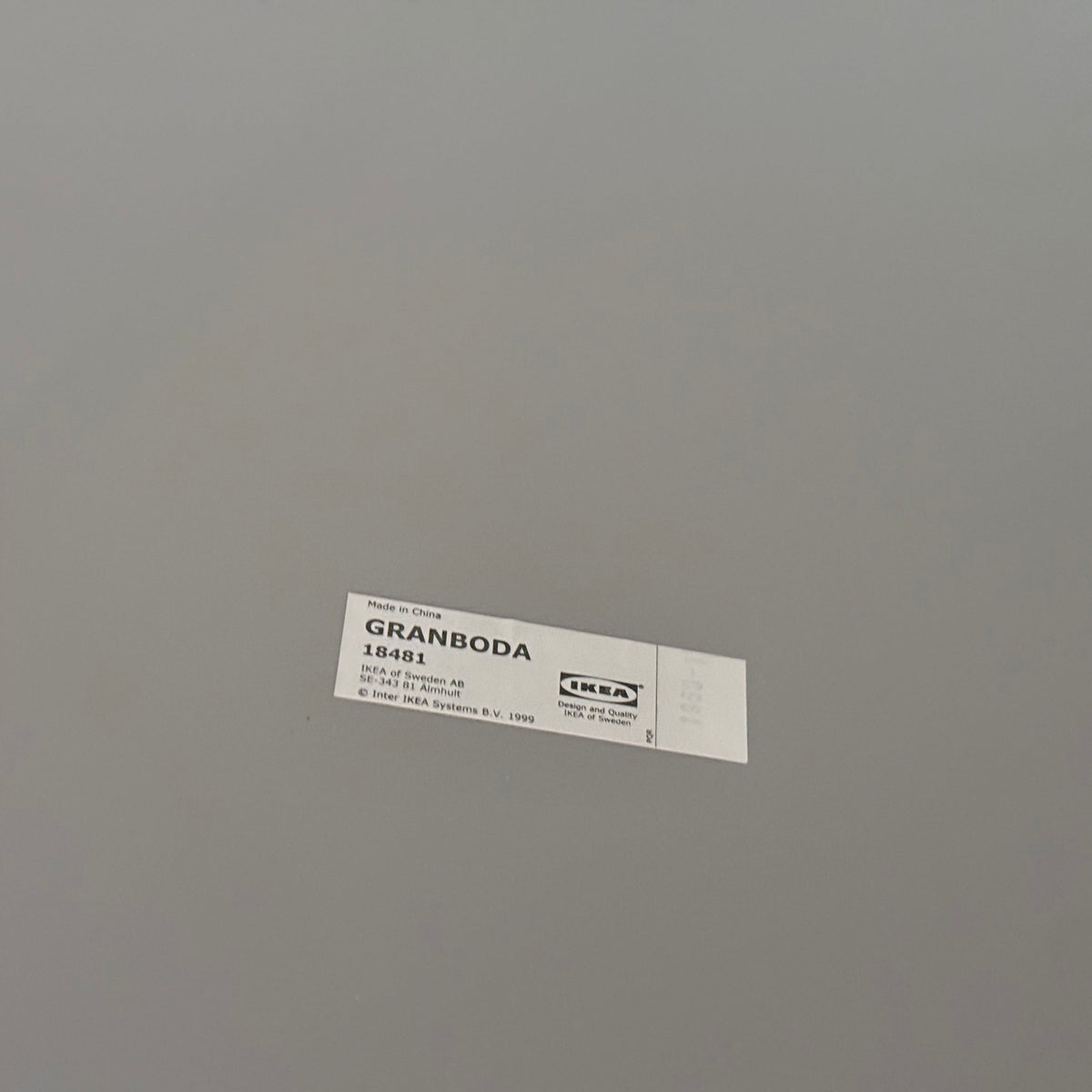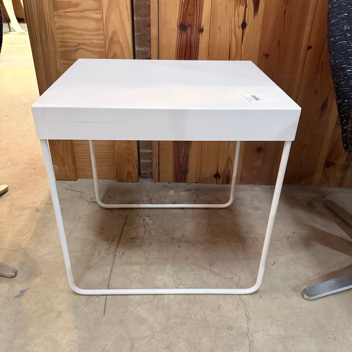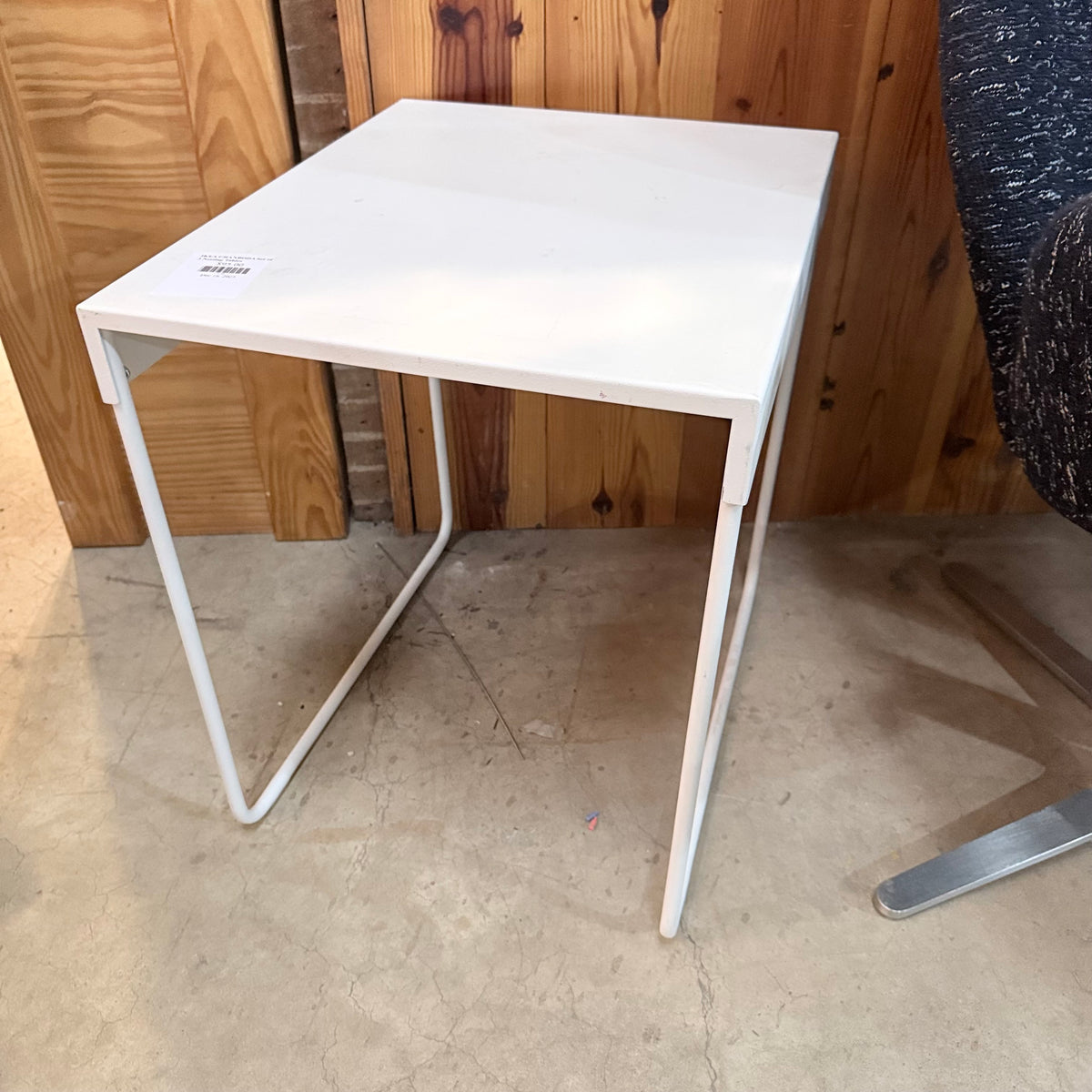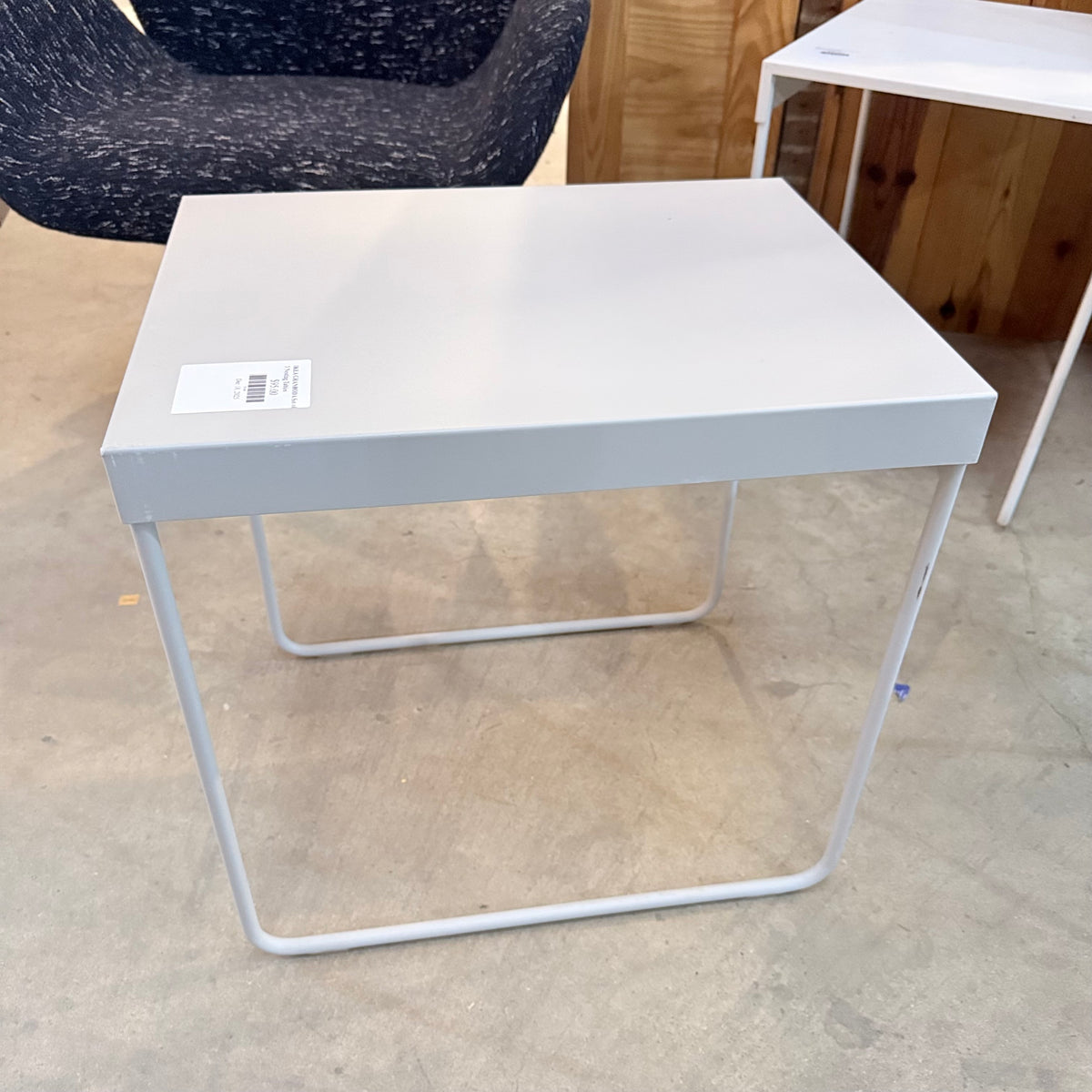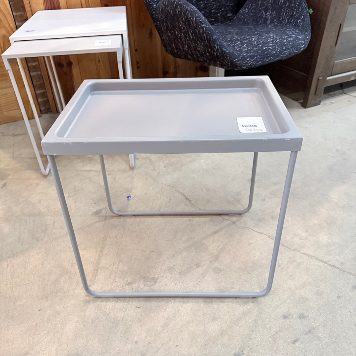This is a set of 3 IKEA GRANBODA nesting tables. The tables sit on slim, metal bases with rubber caps on the bottom and have durable, powder-coated steel surface tops. The smallest table has raised edges, serving as a tray to keep items from sliding off.