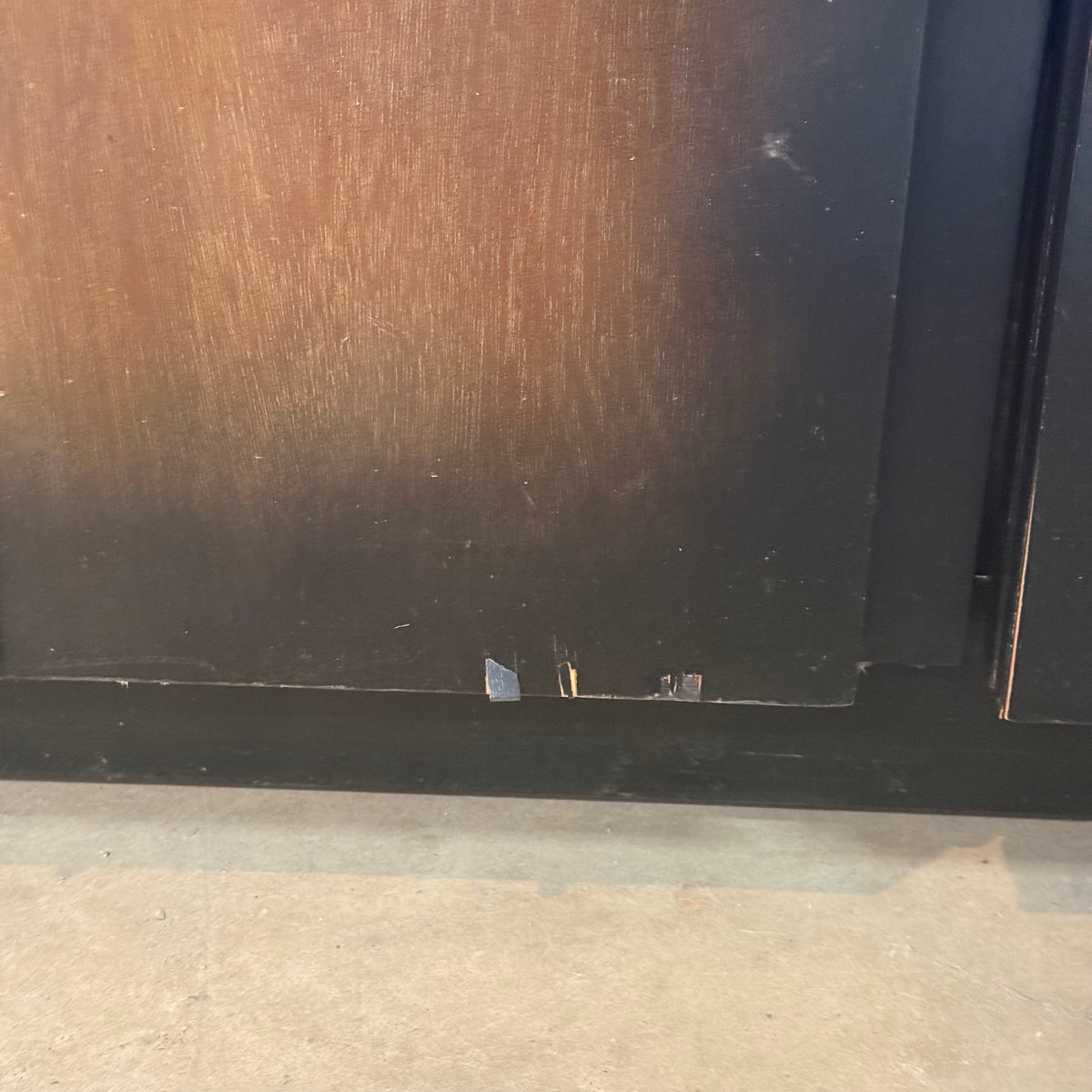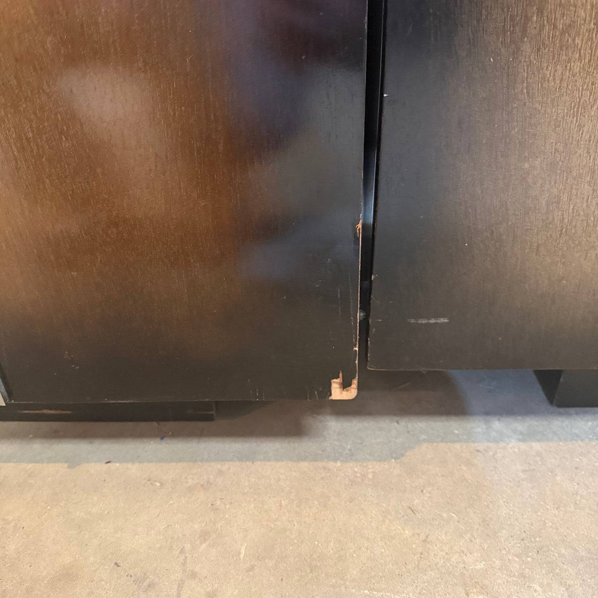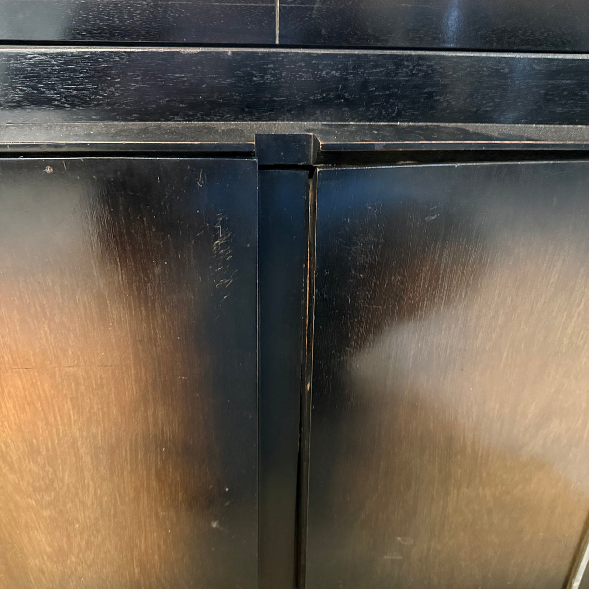 Please note, this dresser has an extensive amount of scuffing, scratches and overall wear to the finish in several places especially along the edges, corners, along the surface top and a few chips towards the base. There is also some chipping to the veneer along the top left towards the back corner. Please also note, the door on the right side doesn't fully close all the way on its own and has to be lifted about a quarter-inch to close shut (see photos).