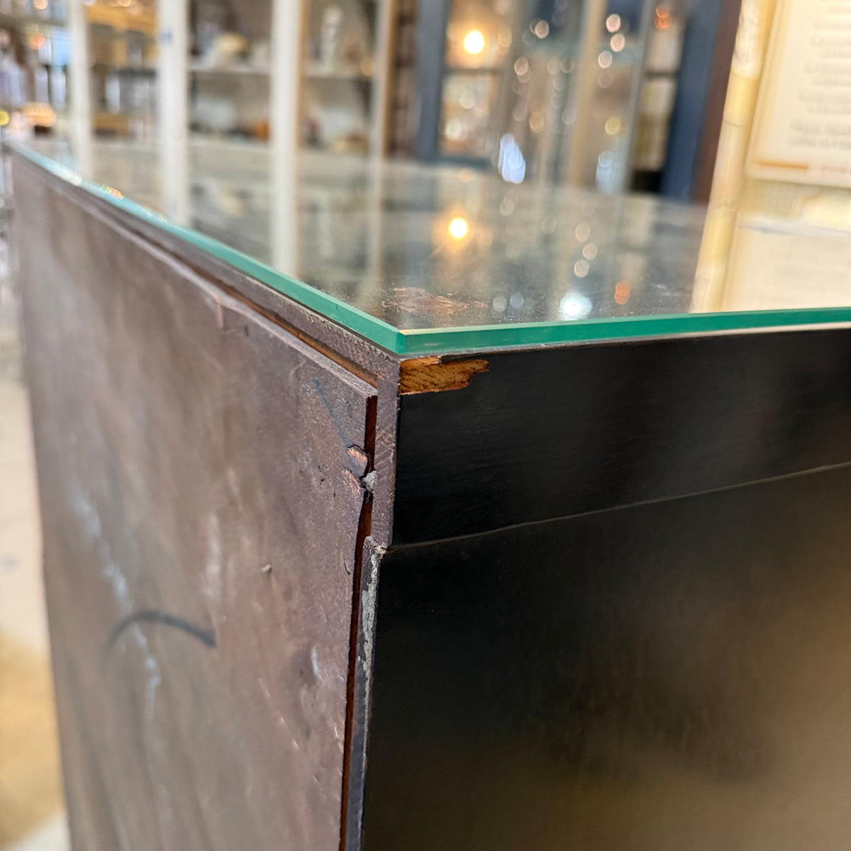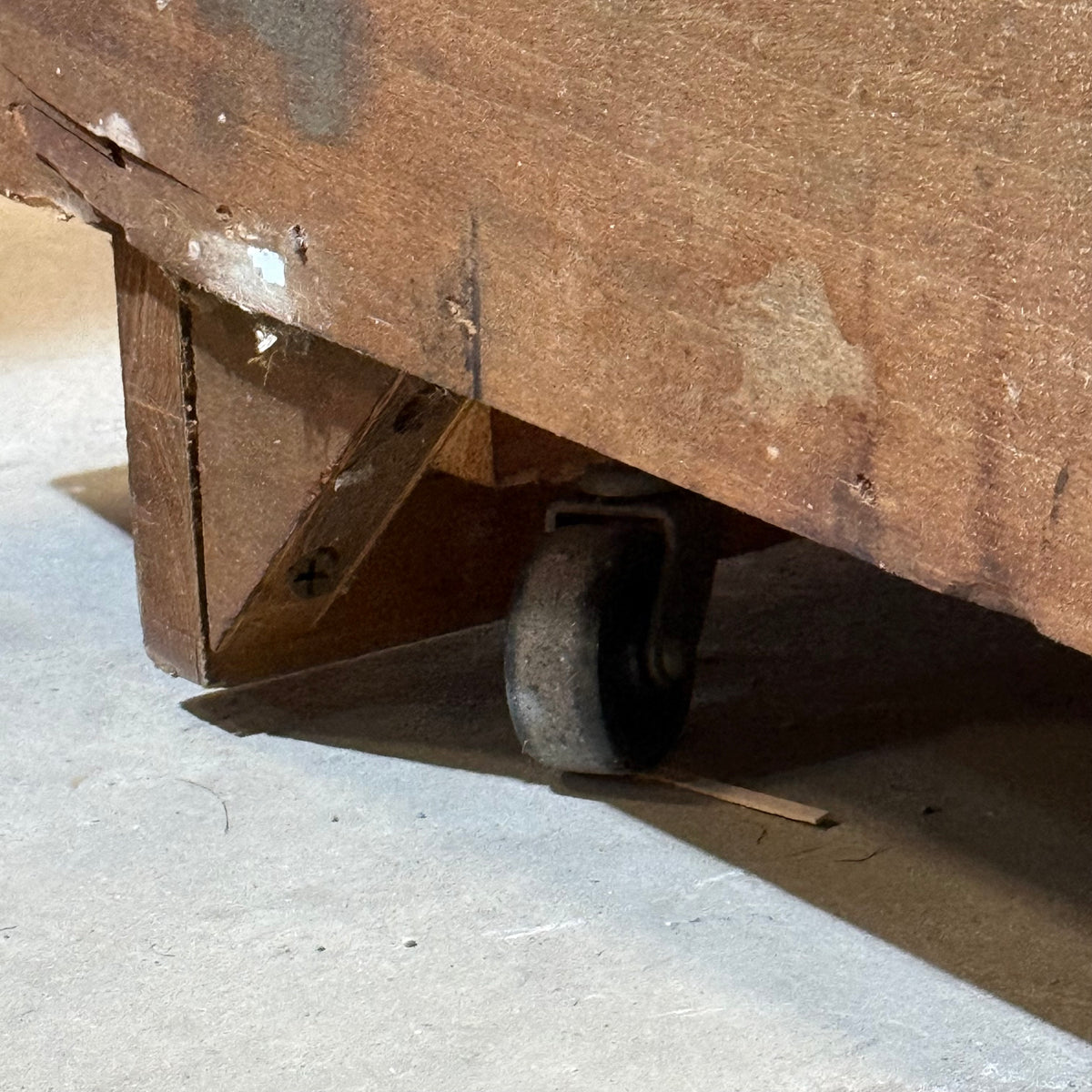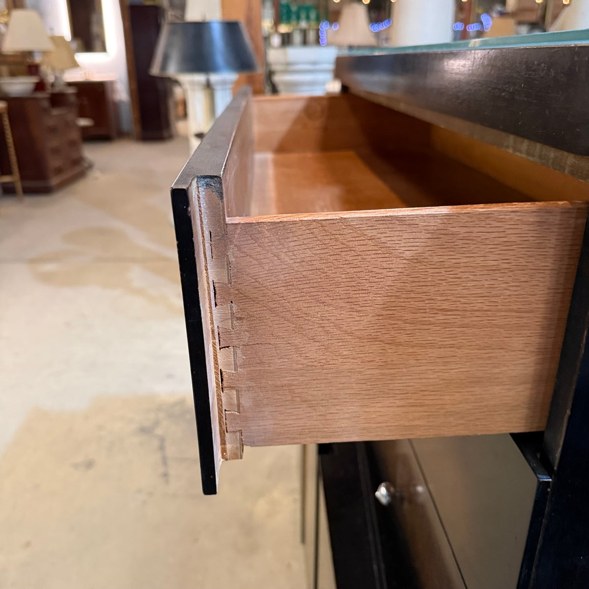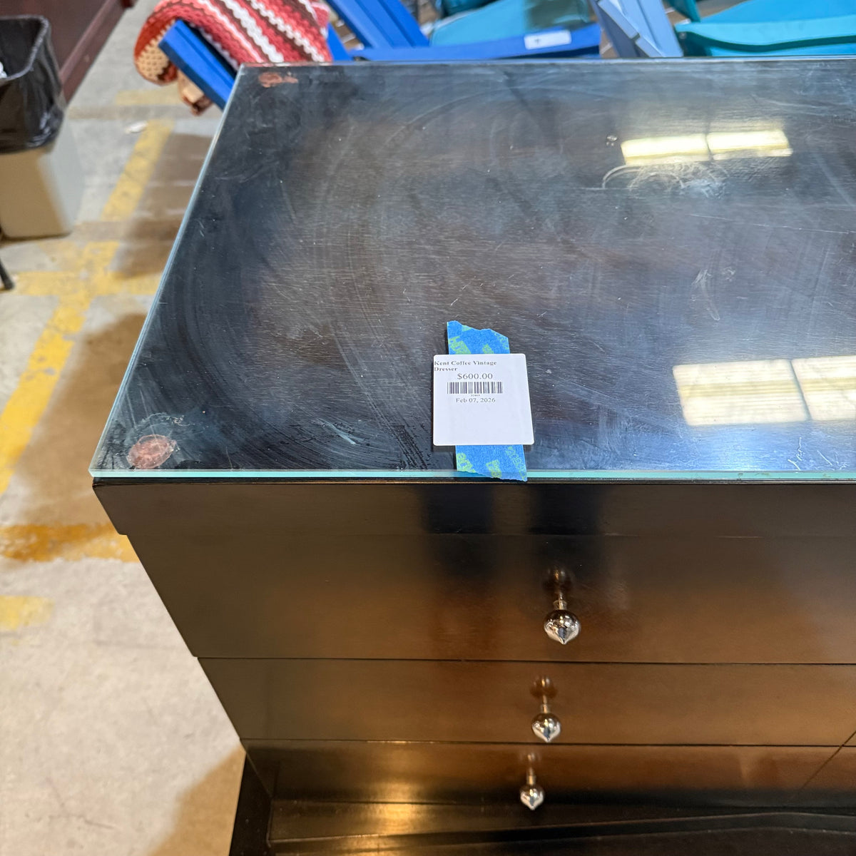 Please note, this dresser has an extensive amount of scuffing, scratches and overall wear to the finish in several places especially along the edges, corners, along the surface top and a few chips towards the base. There is also some chipping to the veneer along the top left towards the back corner. Please also note, the door on the right side doesn't fully close all the way on its own and has to be lifted about a quarter-inch to close shut (see photos).