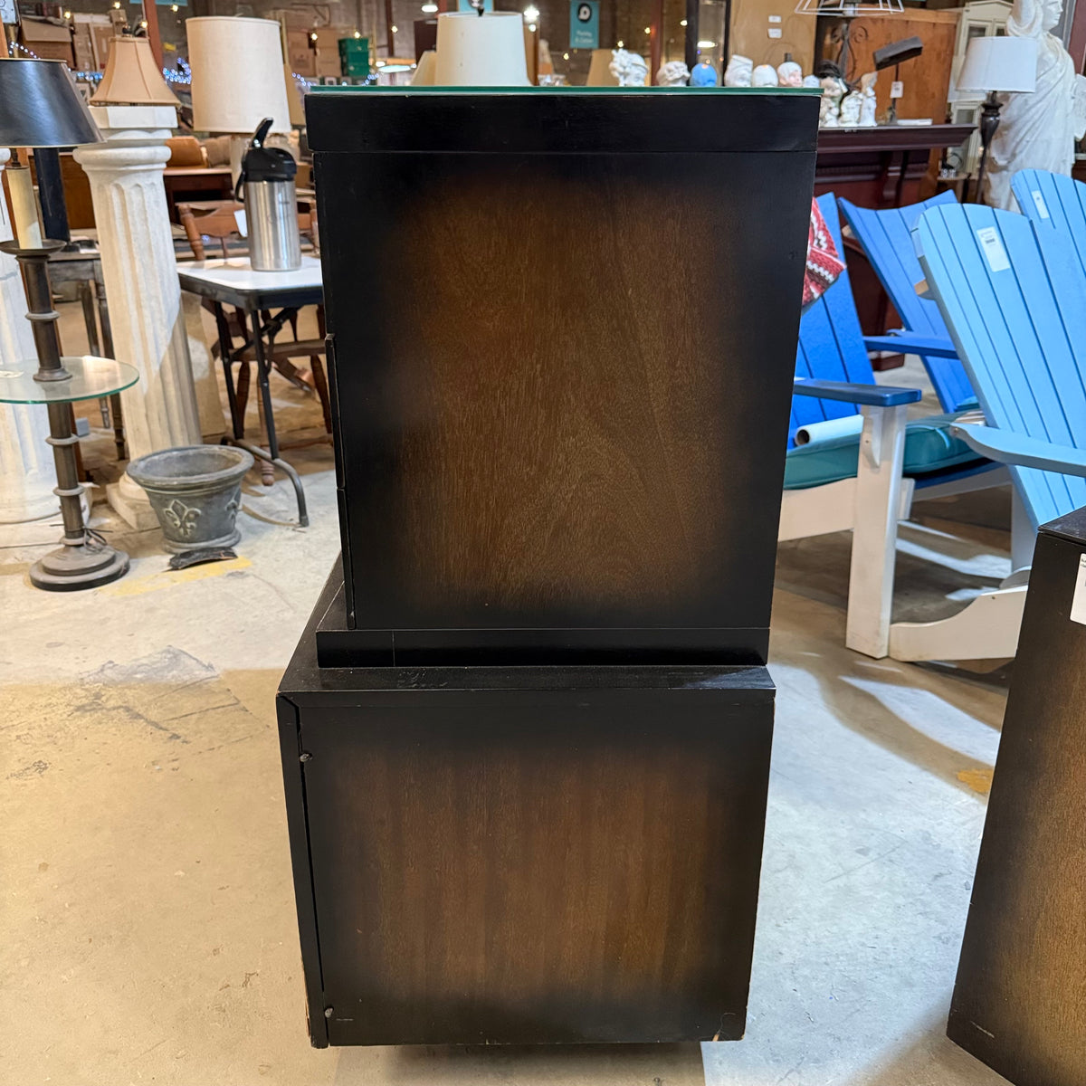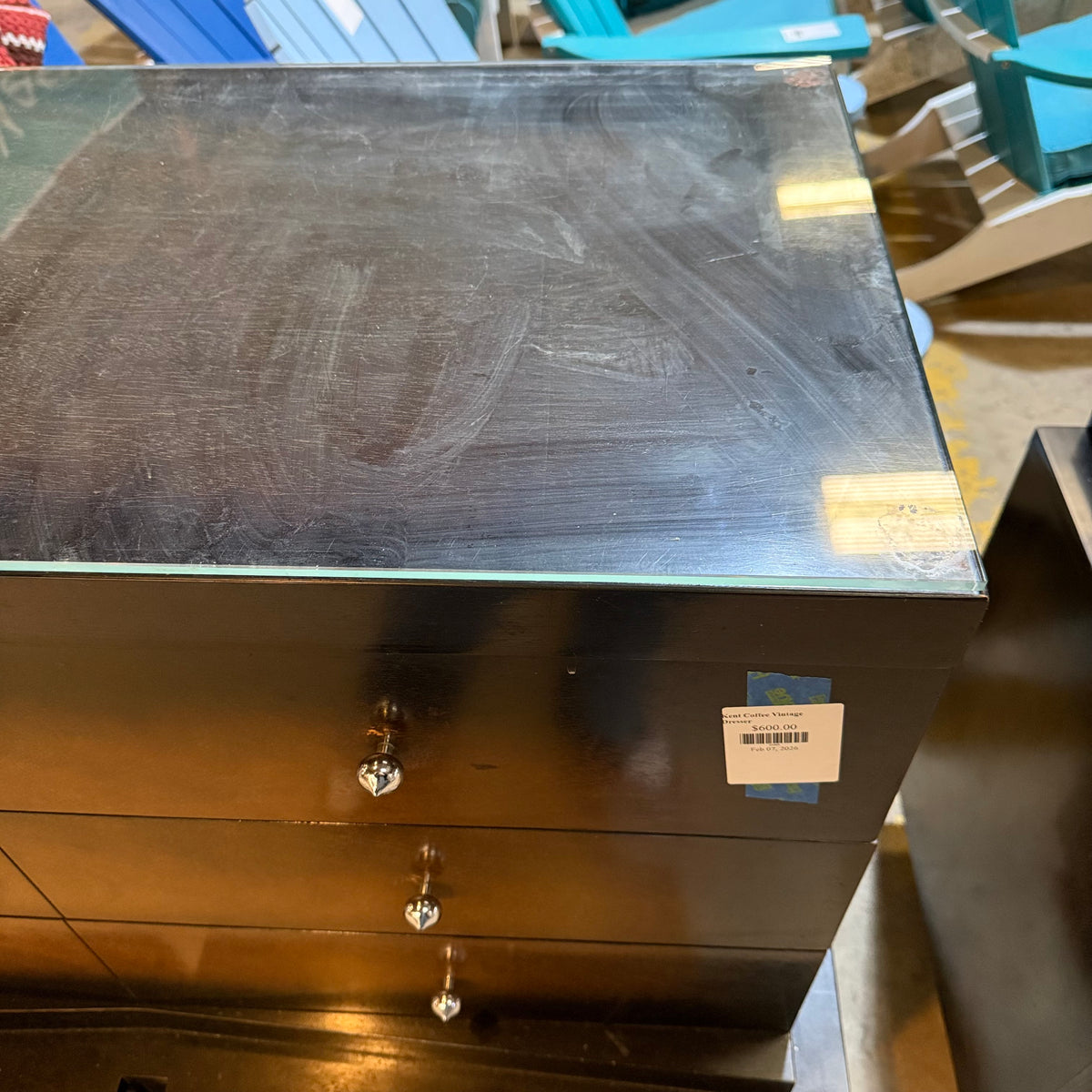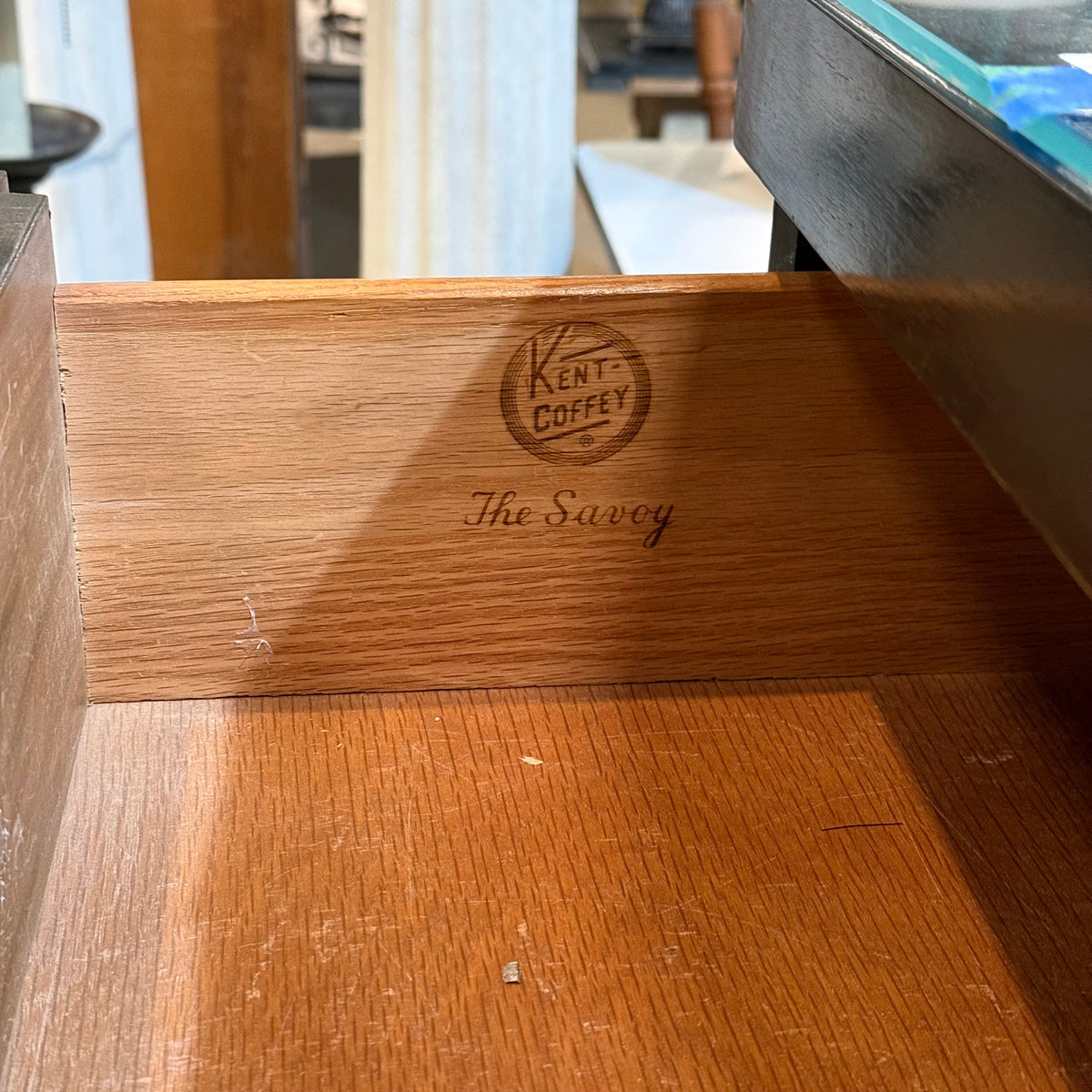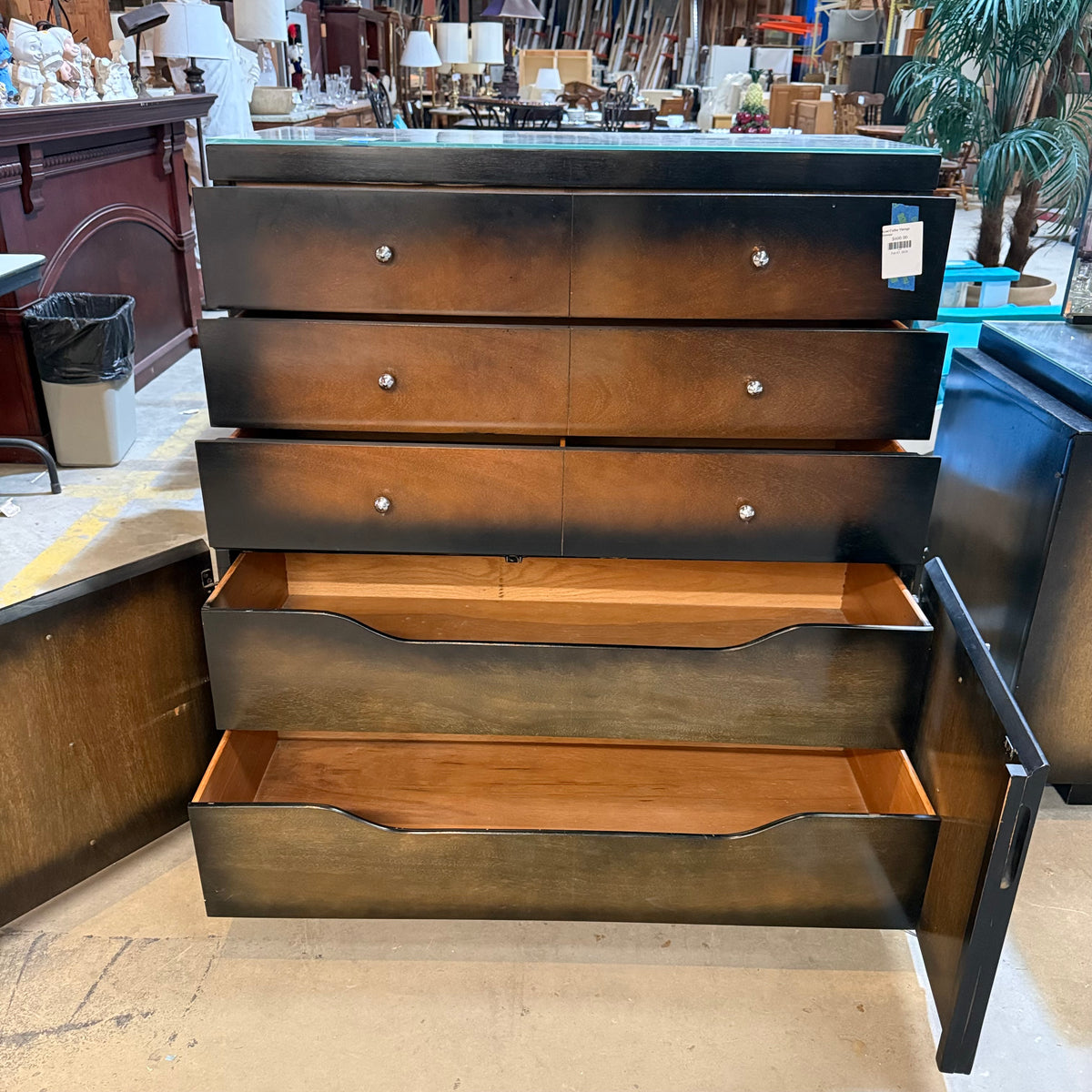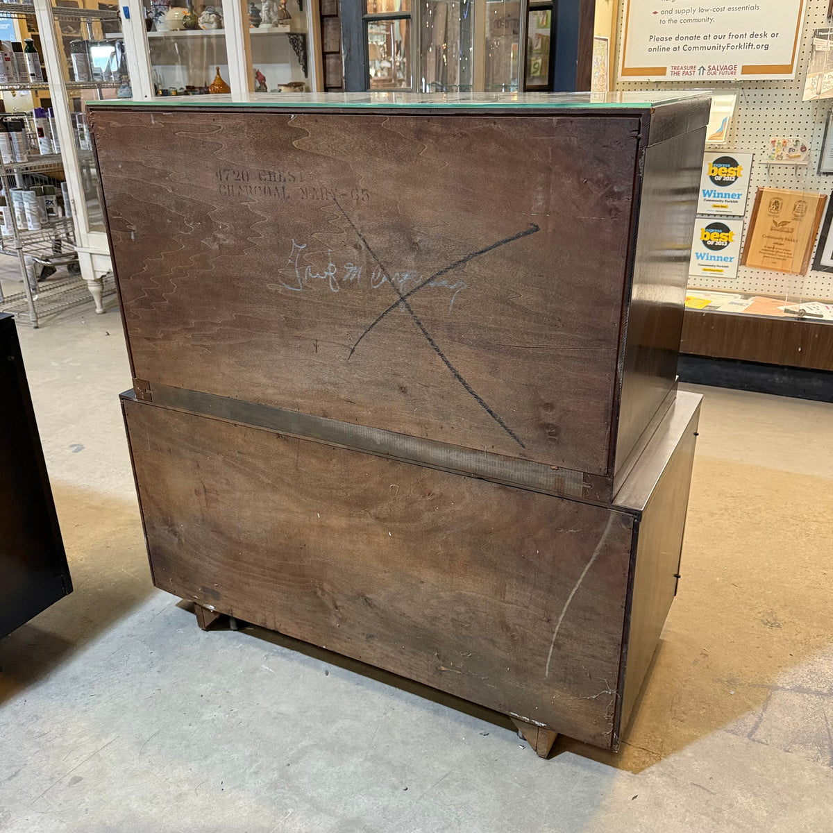 This vintage, Kent Coffey mid-century modern tall bedroom dresser comes with a custom-cut, glass top and is finished with mahogany, book matched, veneers in an ombré or shaded finish. It features three spacious drawers in the top compartment and two additional spacious drawers hidden behind the cabinet doors on the bottom compartment. The drawers at the top are finished with rounded knobs, while the doors and drawers on the bottom compartment have hidden, built-in recessed pulls on the sides. It sits on a sturdy base and has hidden caster wheels underneath for easy moving.
