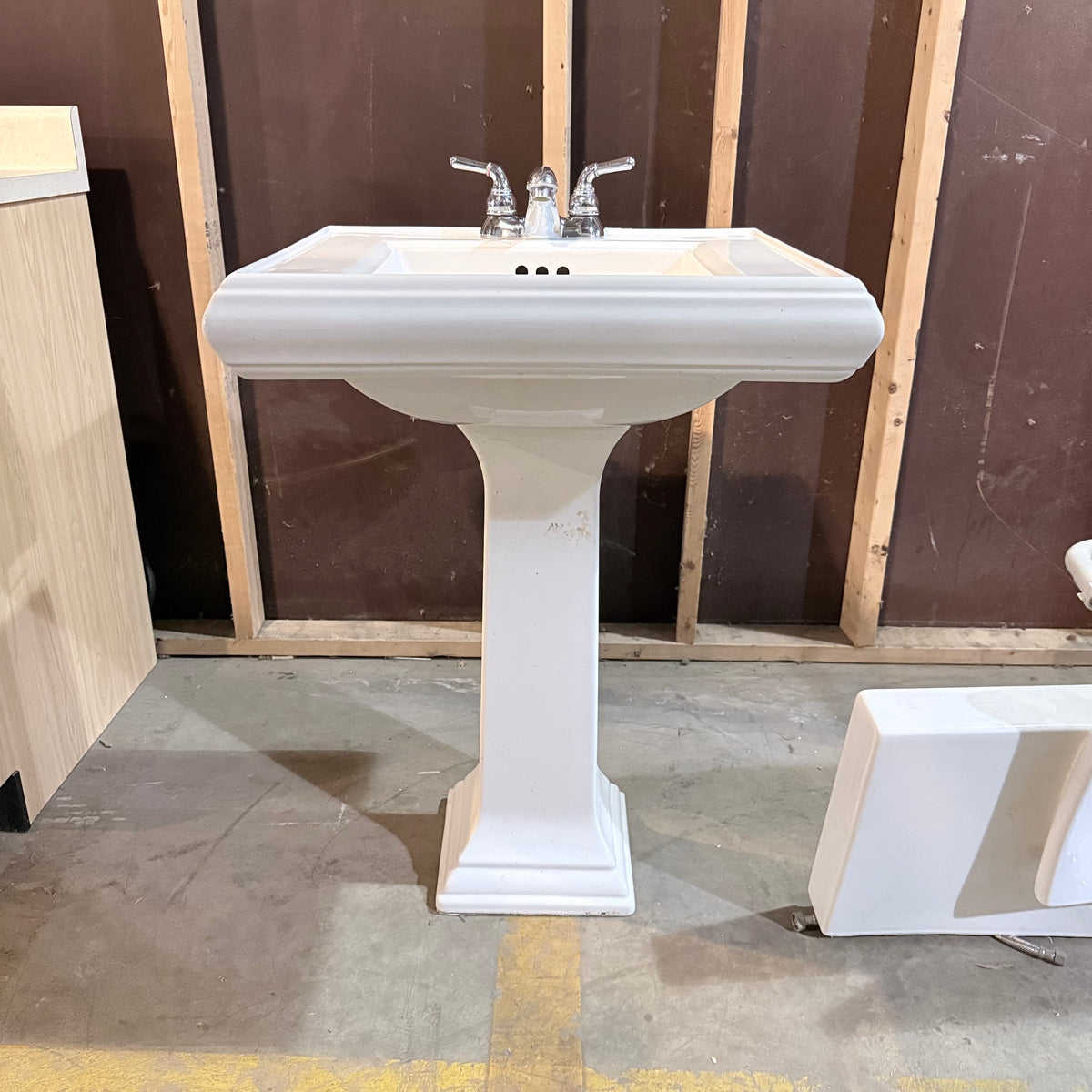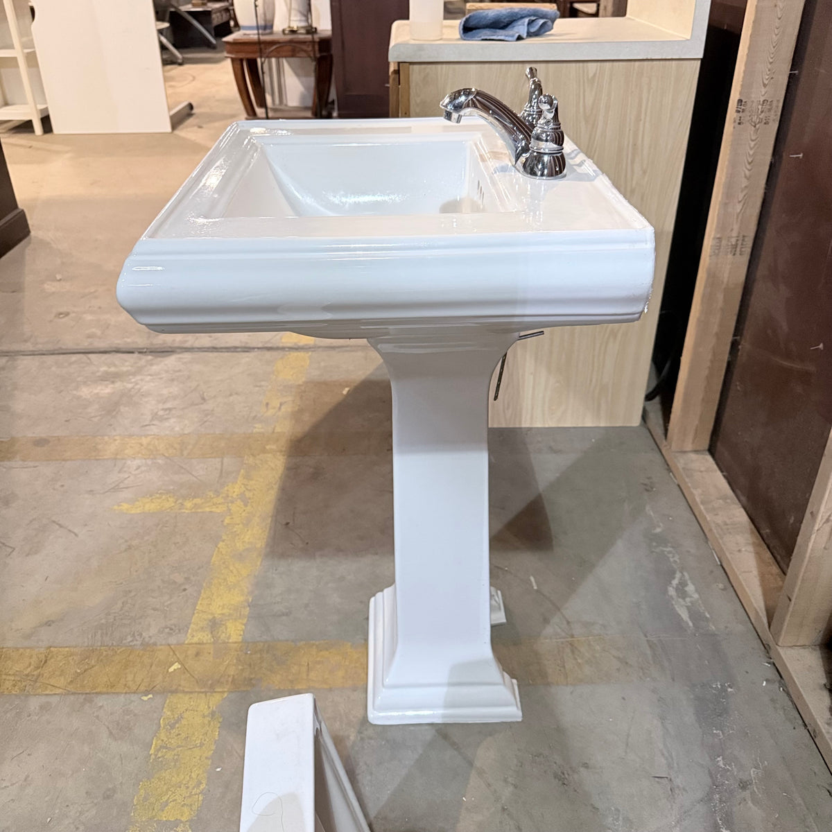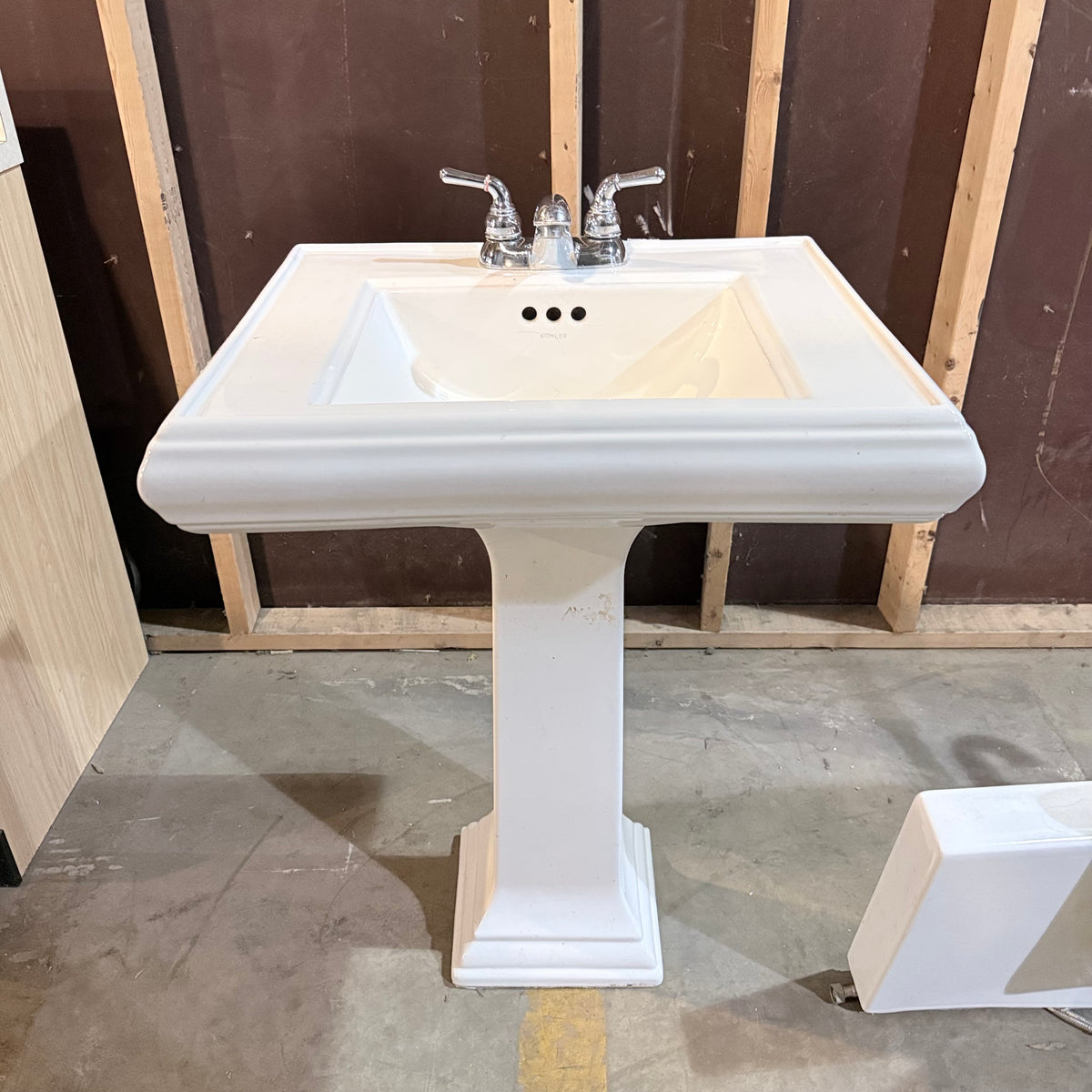 This is a previously owned, white Kohler 'Memoirs' classic pedestal sink made of fireclay with a rectangular shape and detailing inspired by crown molding, an overflow drain, a squared pedestal, and a chrome faucet set and drain installed.