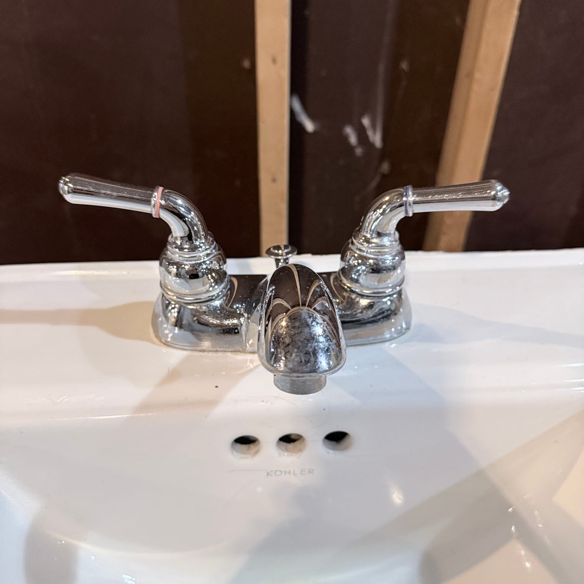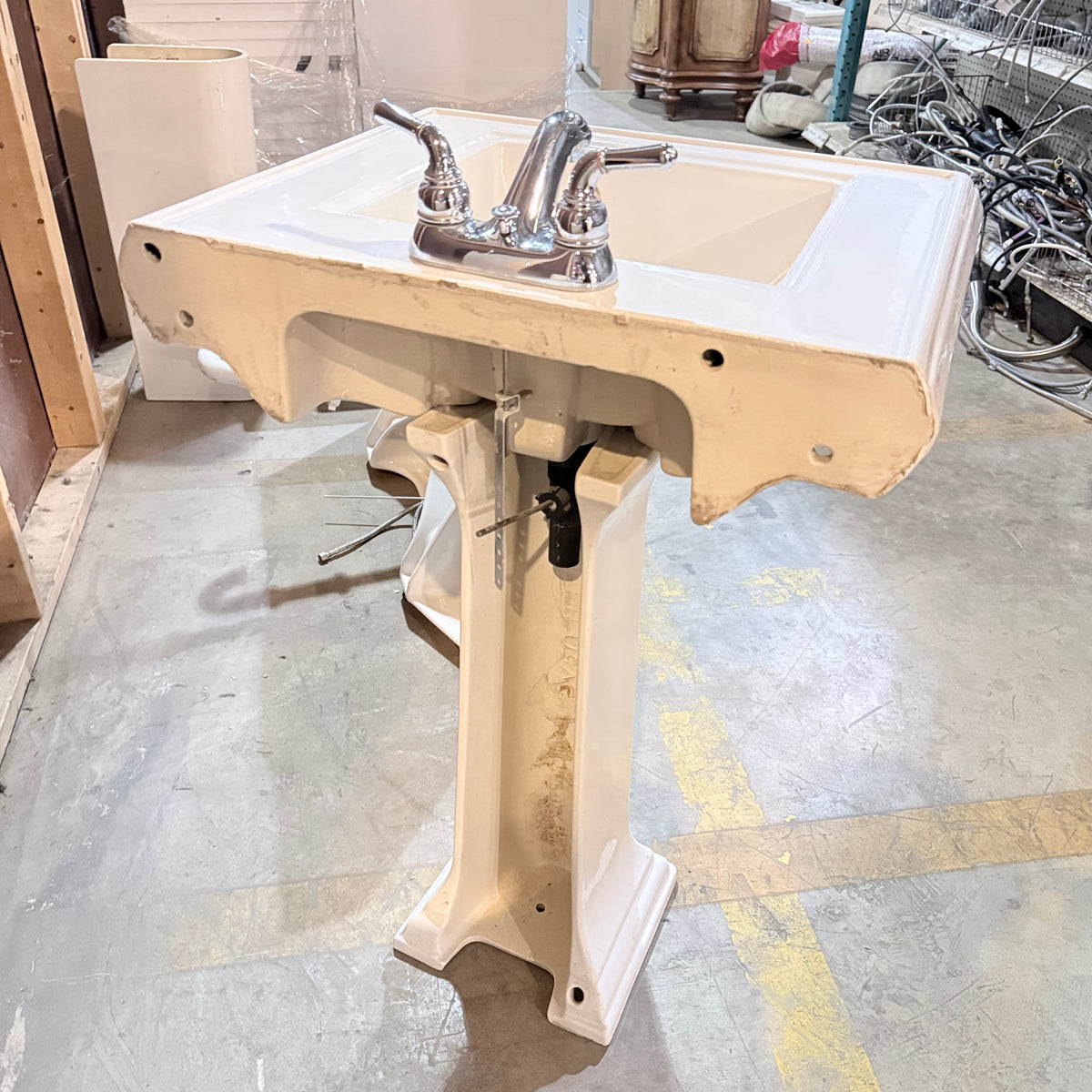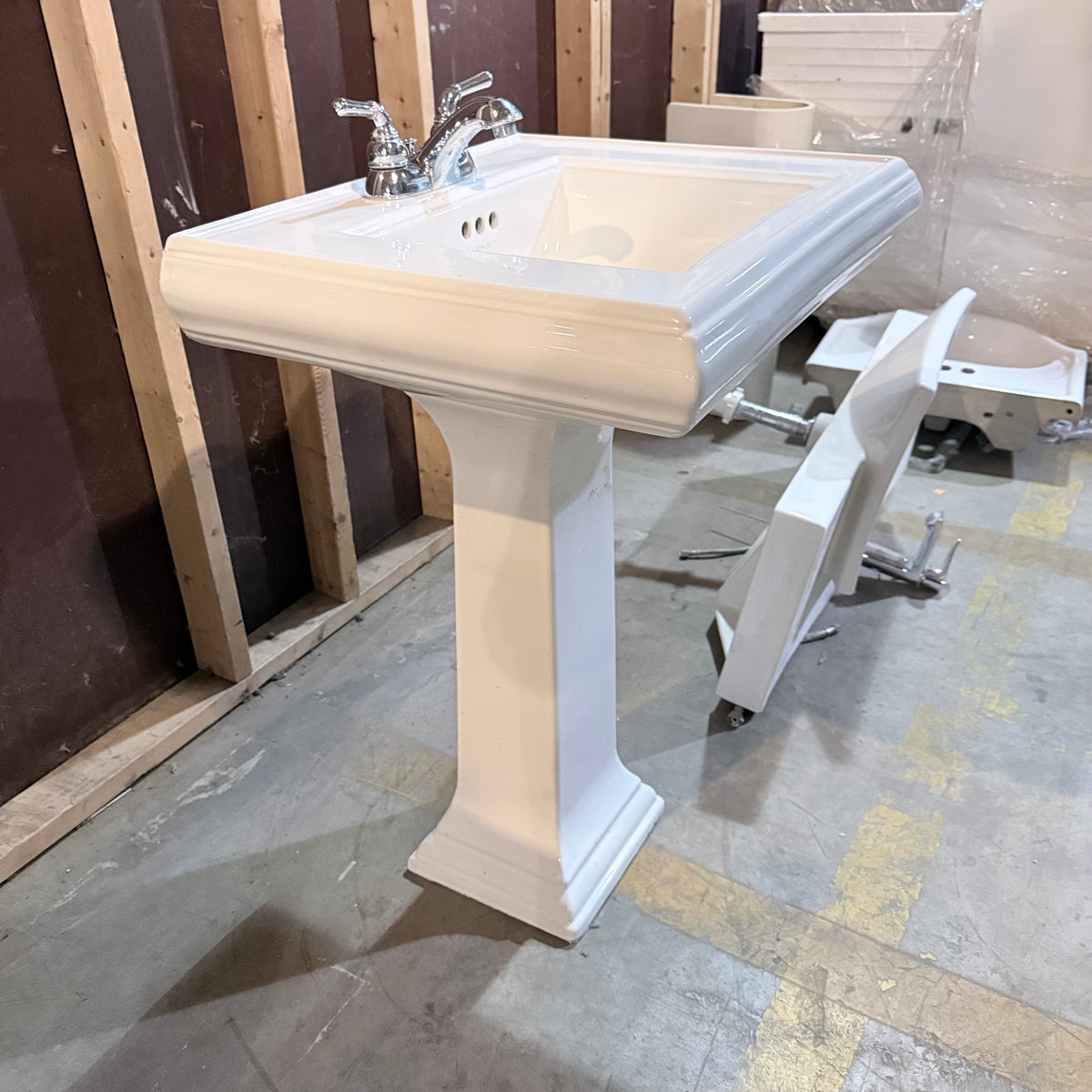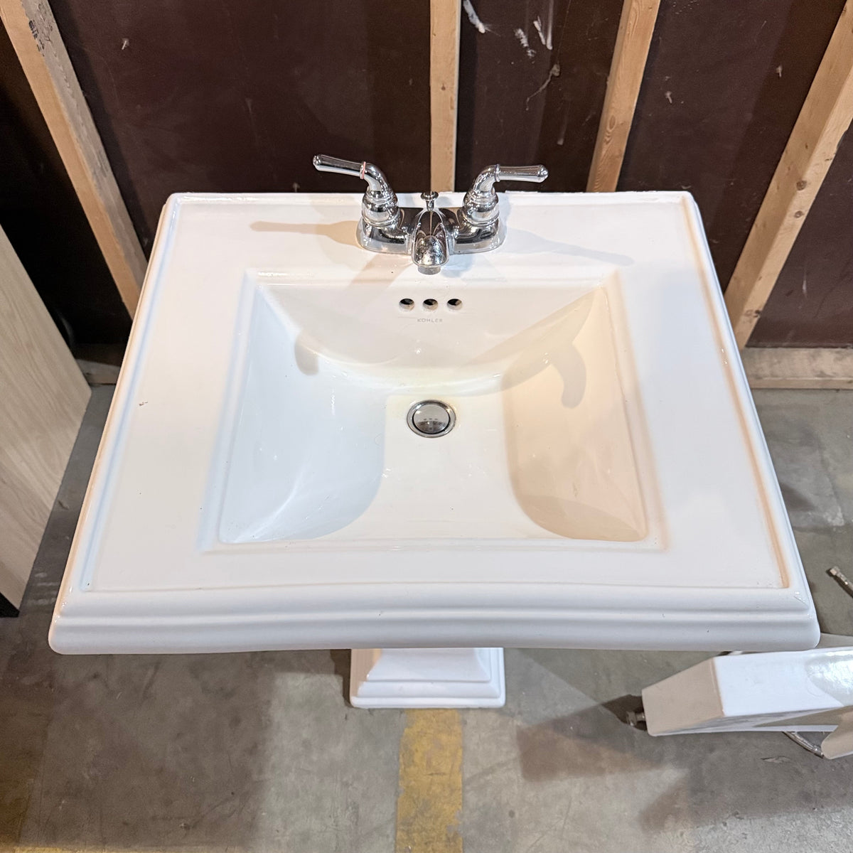 This is a previously owned, white Kohler 'Memoirs' classic pedestal sink made of fireclay with a rectangular shape and detailing inspired by crown molding, an overflow drain, a squared pedestal, and a chrome faucet set and drain installed.