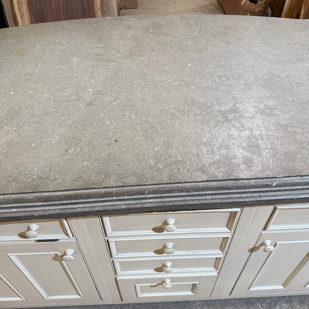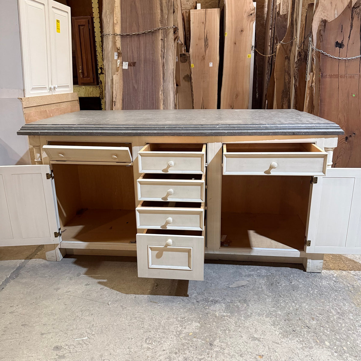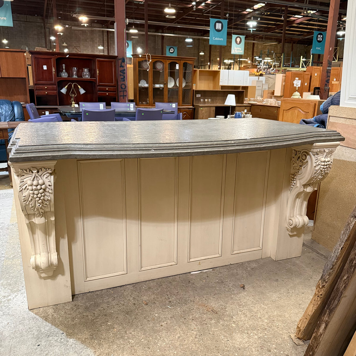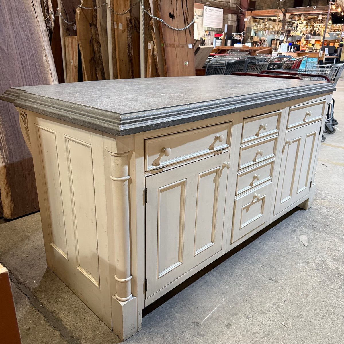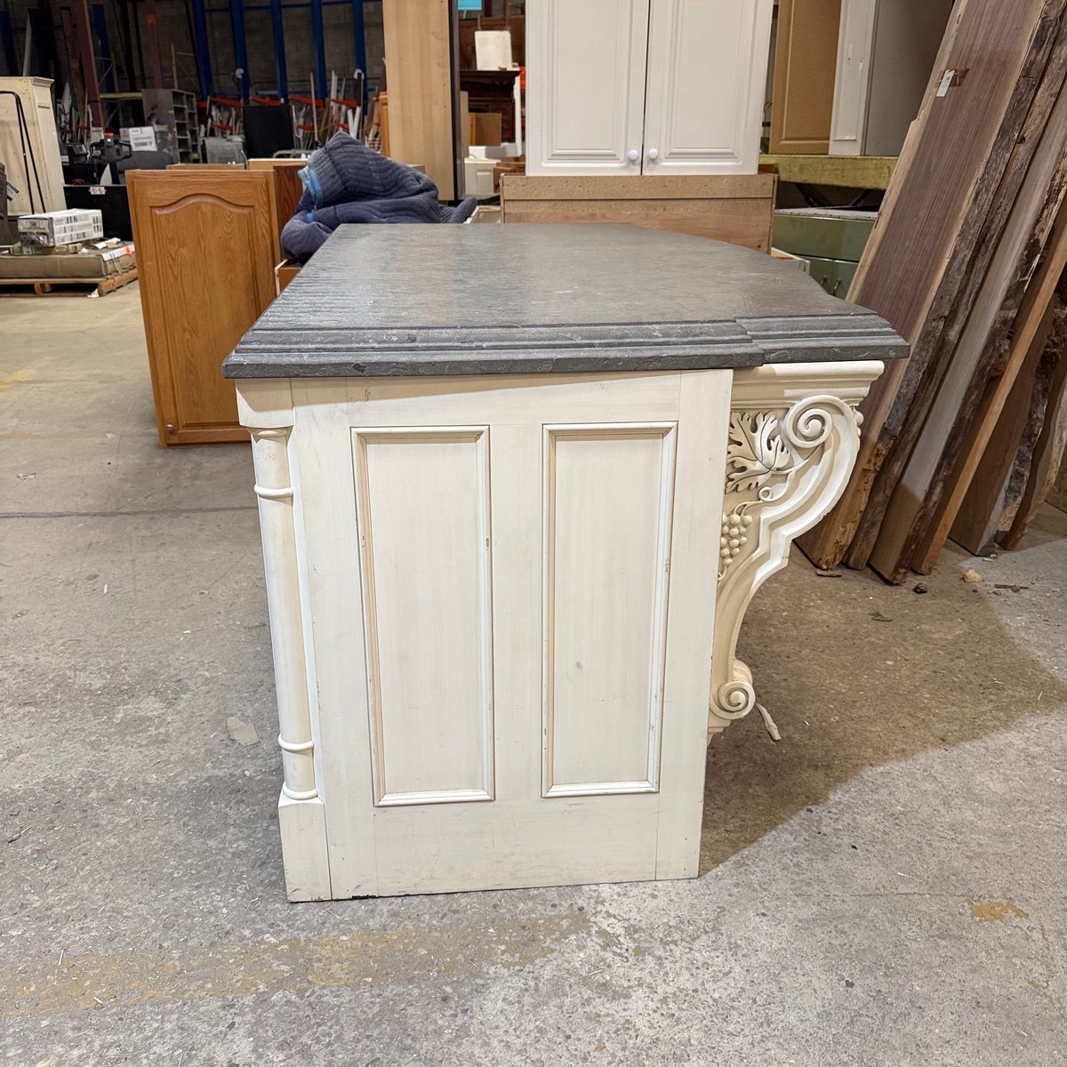 This product is a previously owned large kitchen island with a stone top, by Woodcraft Mode Cabinetry. One side features an individual storage cabinet at either side and 4 drawers down the center. The other side is finished with grape and Acanthus leaf hand carved countertop support brackets or large corbel pieces. It is constructed of thick plywood with solid wood drawer fronts finished with dovetail joints.