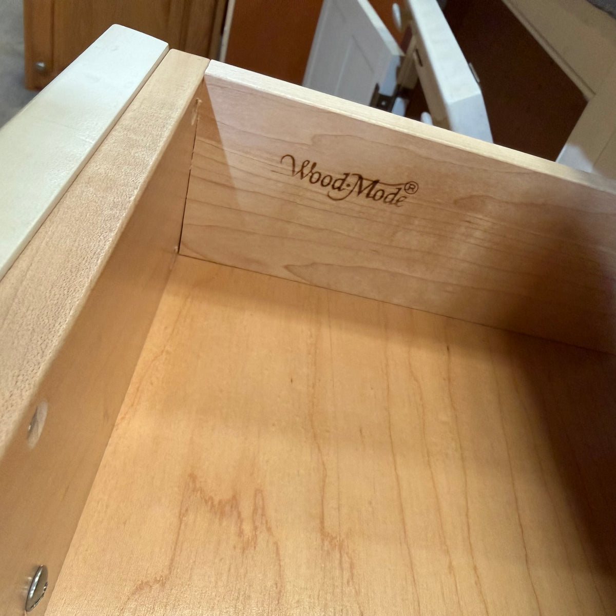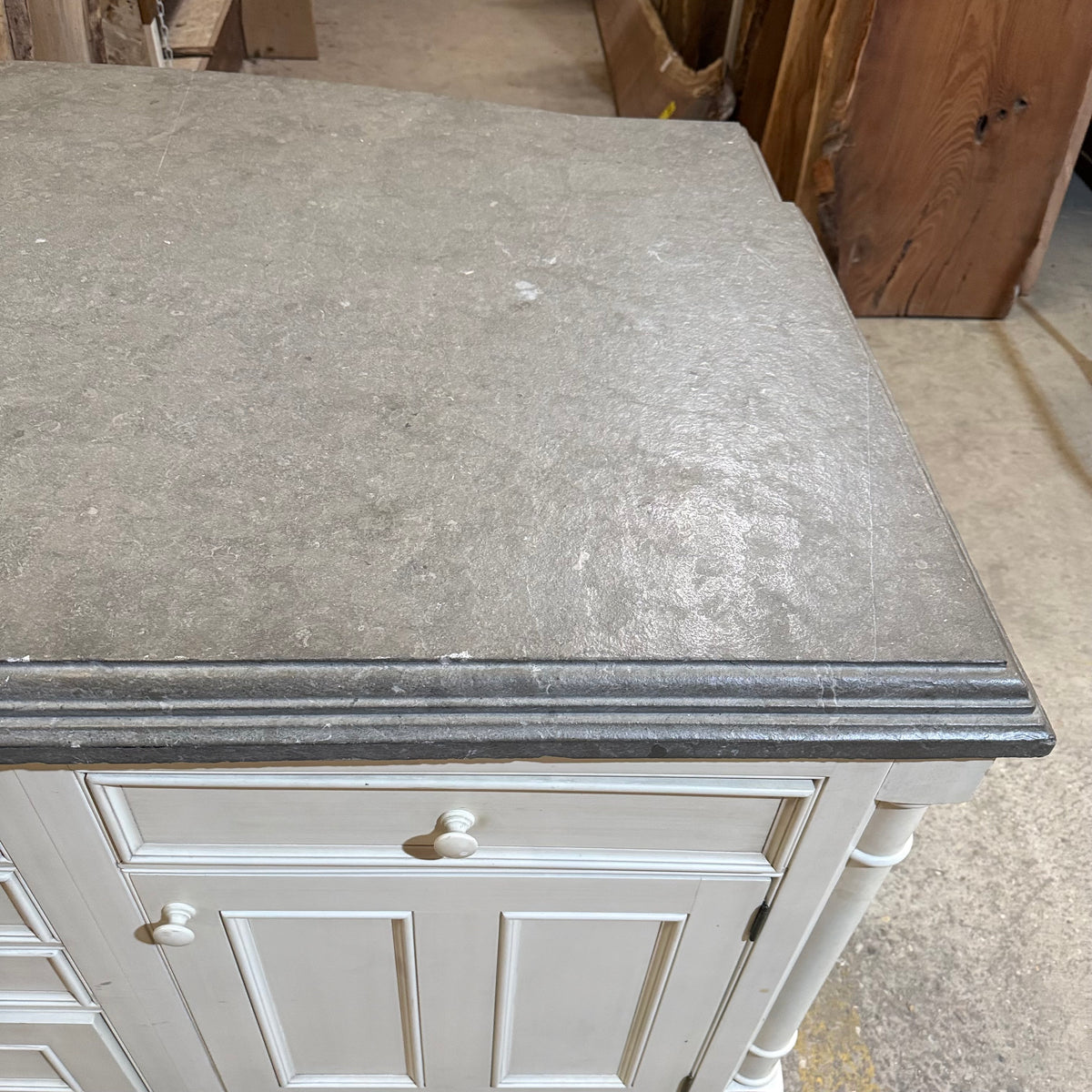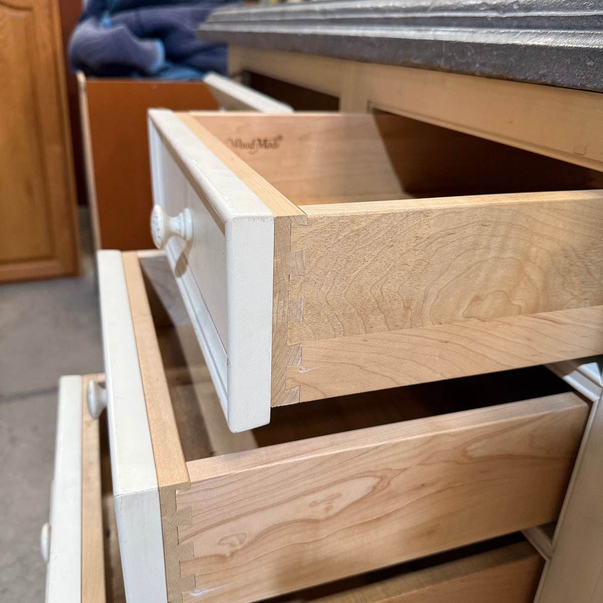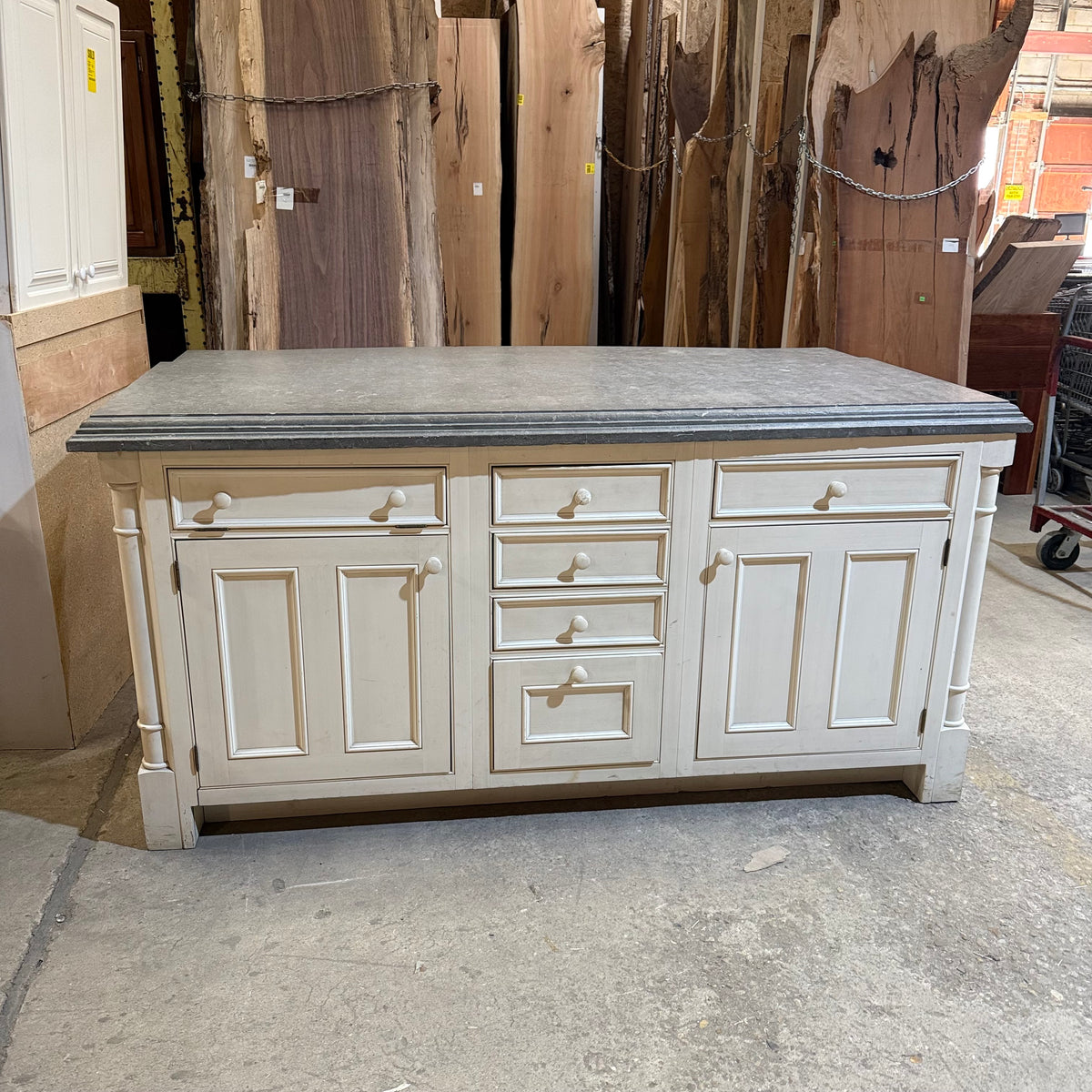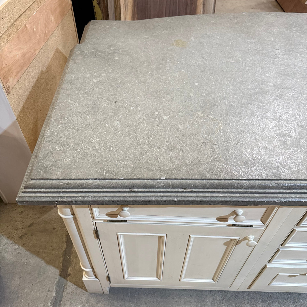 This product is a previously owned large kitchen island with a stone top, by Woodcraft Mode Cabinetry. One side features an individual storage cabinet at either side and 4 drawers down the center. The other side is finished with grape and Acanthus leaf hand carved countertop support brackets or large corbel pieces. It is constructed of thick plywood with solid wood drawer fronts finished with dovetail joints.