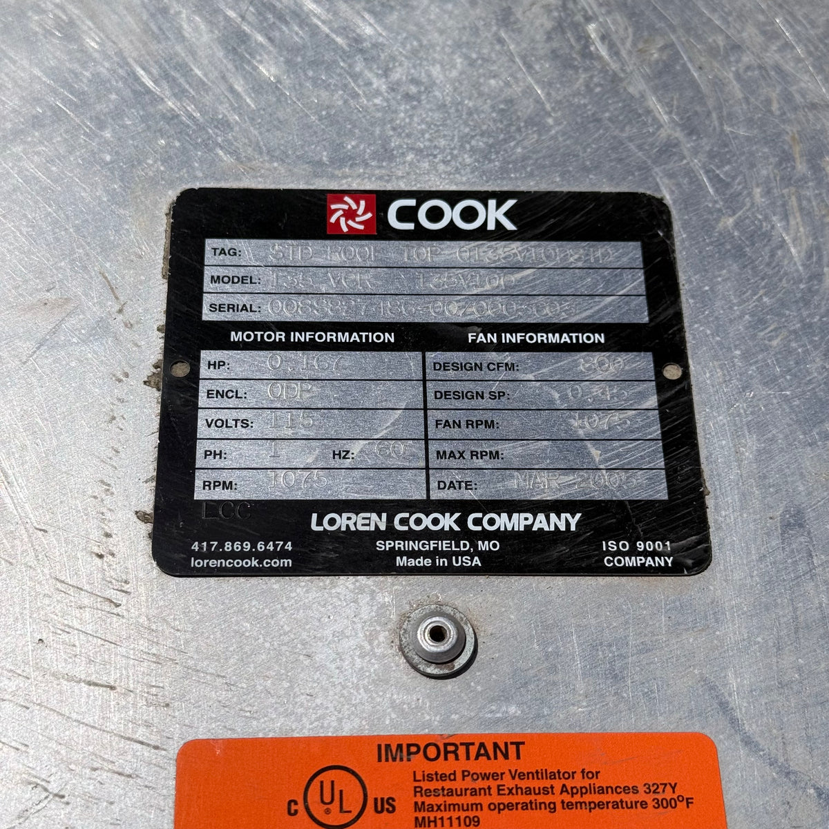 This product is a very clean, previously owned Loren Cook restaurant exhaust fan ventilator. Features: