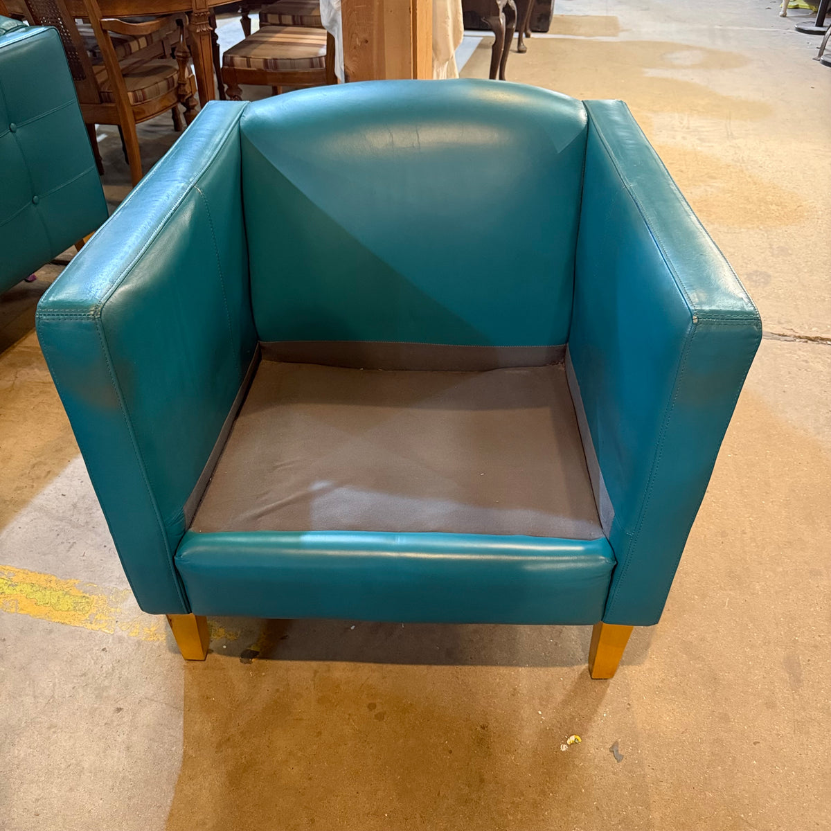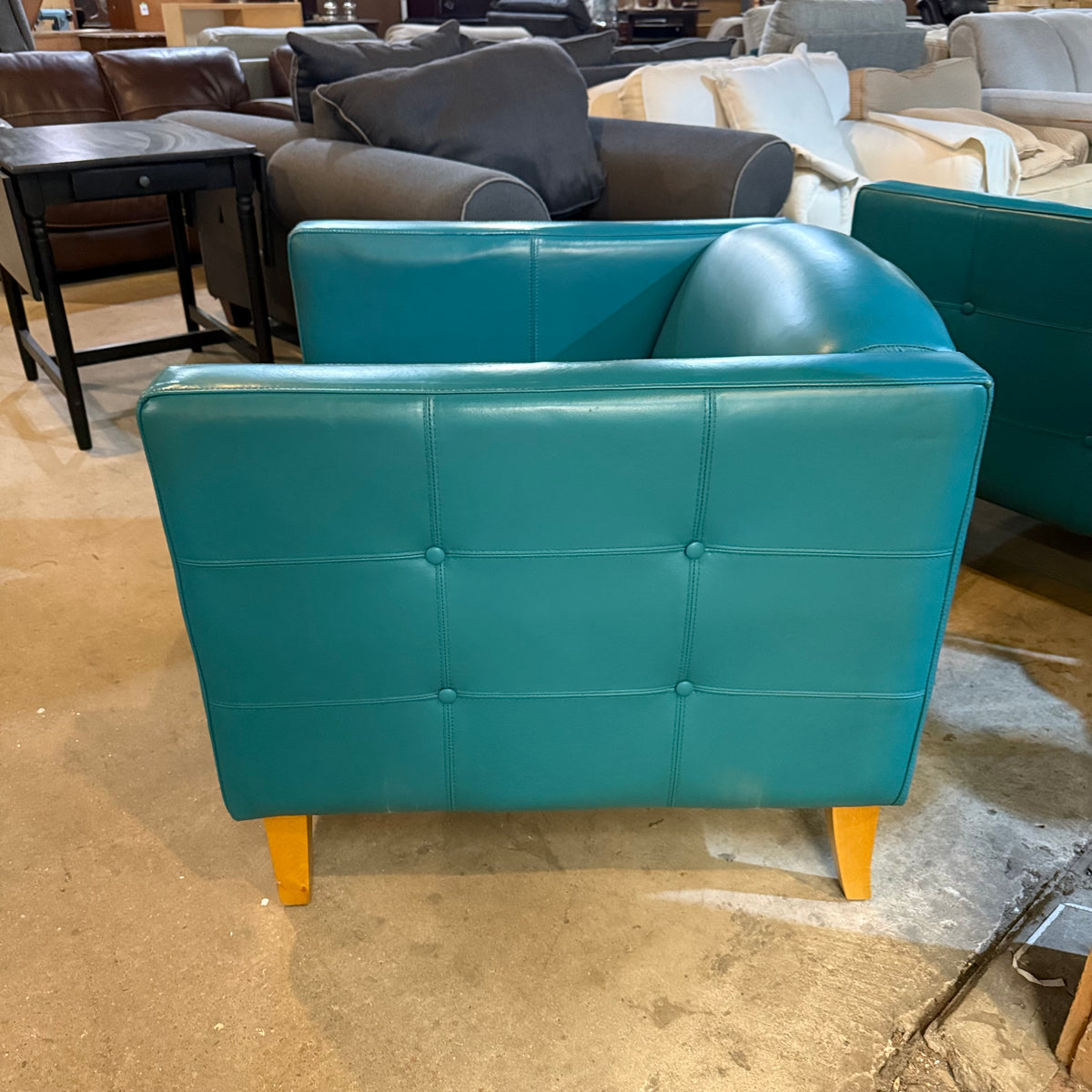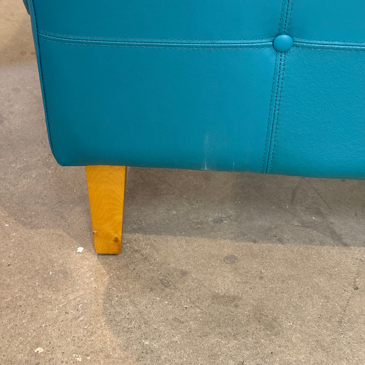 This mid-century modern style club chair is upholstered in a teal leather fabric with a wraparound frame and button-tufting design on the sides. The seat cushion is removable and secured in place with Velcro strips. The chair sits on square, tapered wooden legs and there is a zipper underneath to stow away the legs for moving purposes.