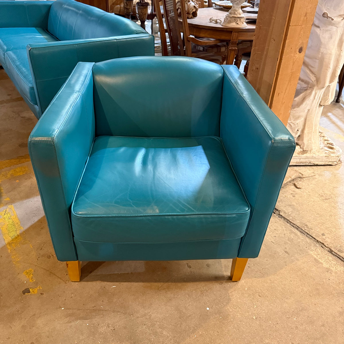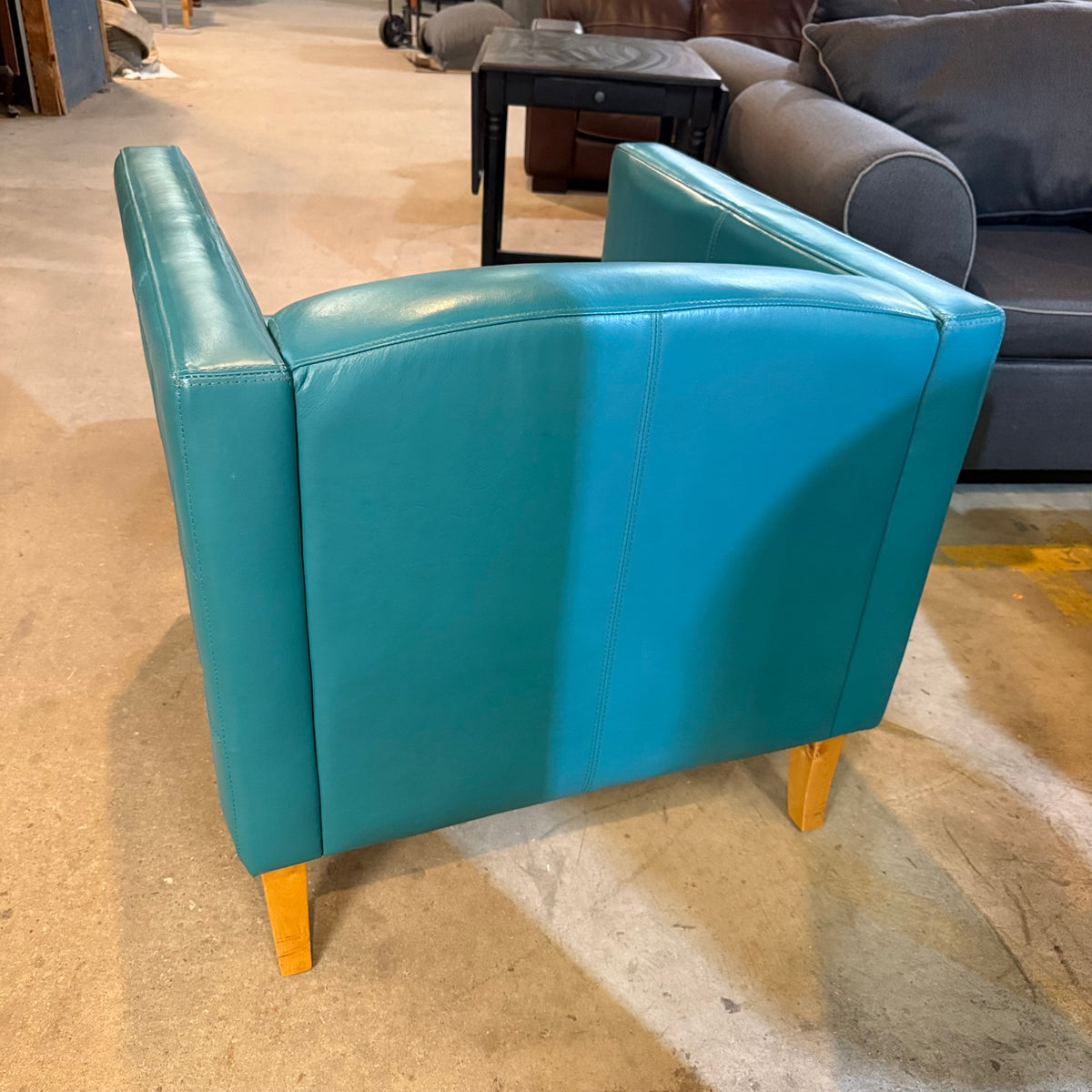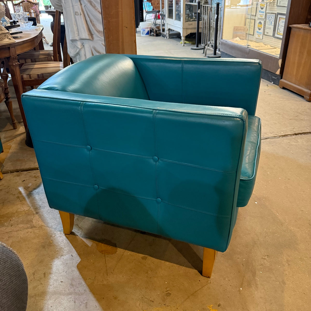 This mid-century modern style club chair is upholstered in a teal leather fabric with a wraparound frame and button-tufting design on the sides. The seat cushion is removable and secured in place with Velcro strips. The chair sits on square, tapered wooden legs and there is a zipper underneath to stow away the legs for moving purposes.