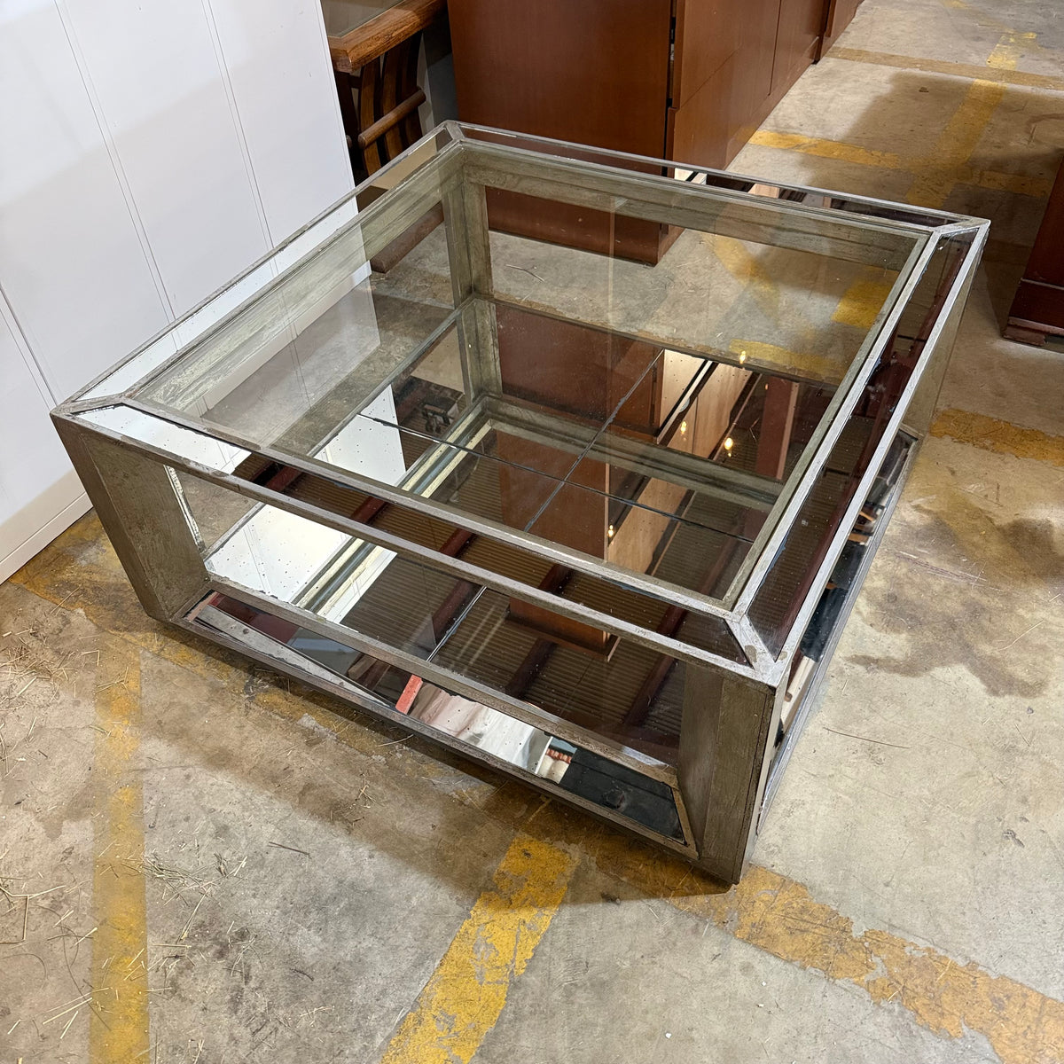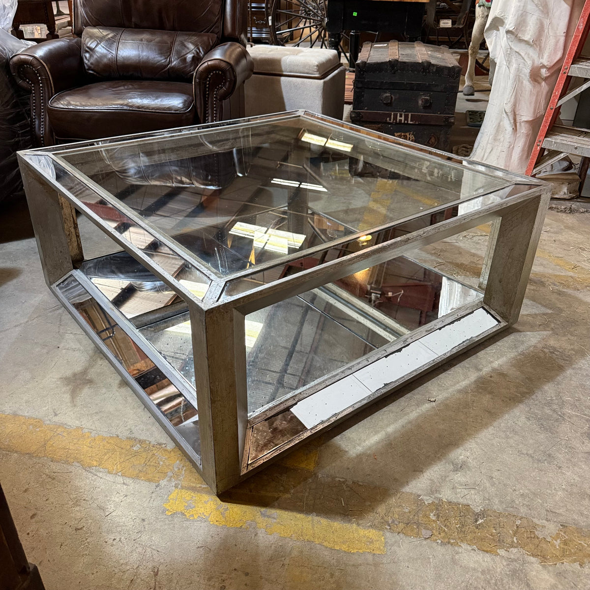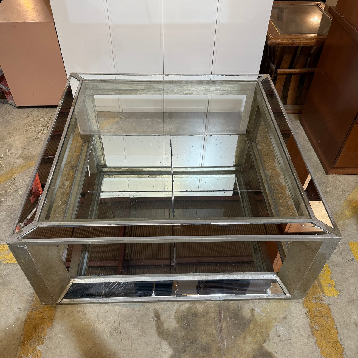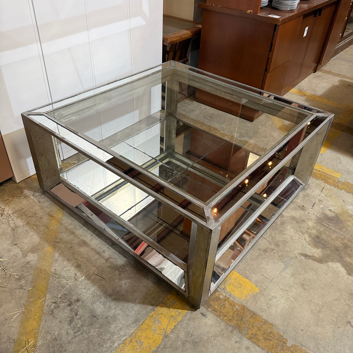 This product is a previously owned mirrored and glass top coffee table. It sits on a hefty frame and features a glass top with mirror pieces of paneling along the sides and a mirrored lower-tier open shelf space below.