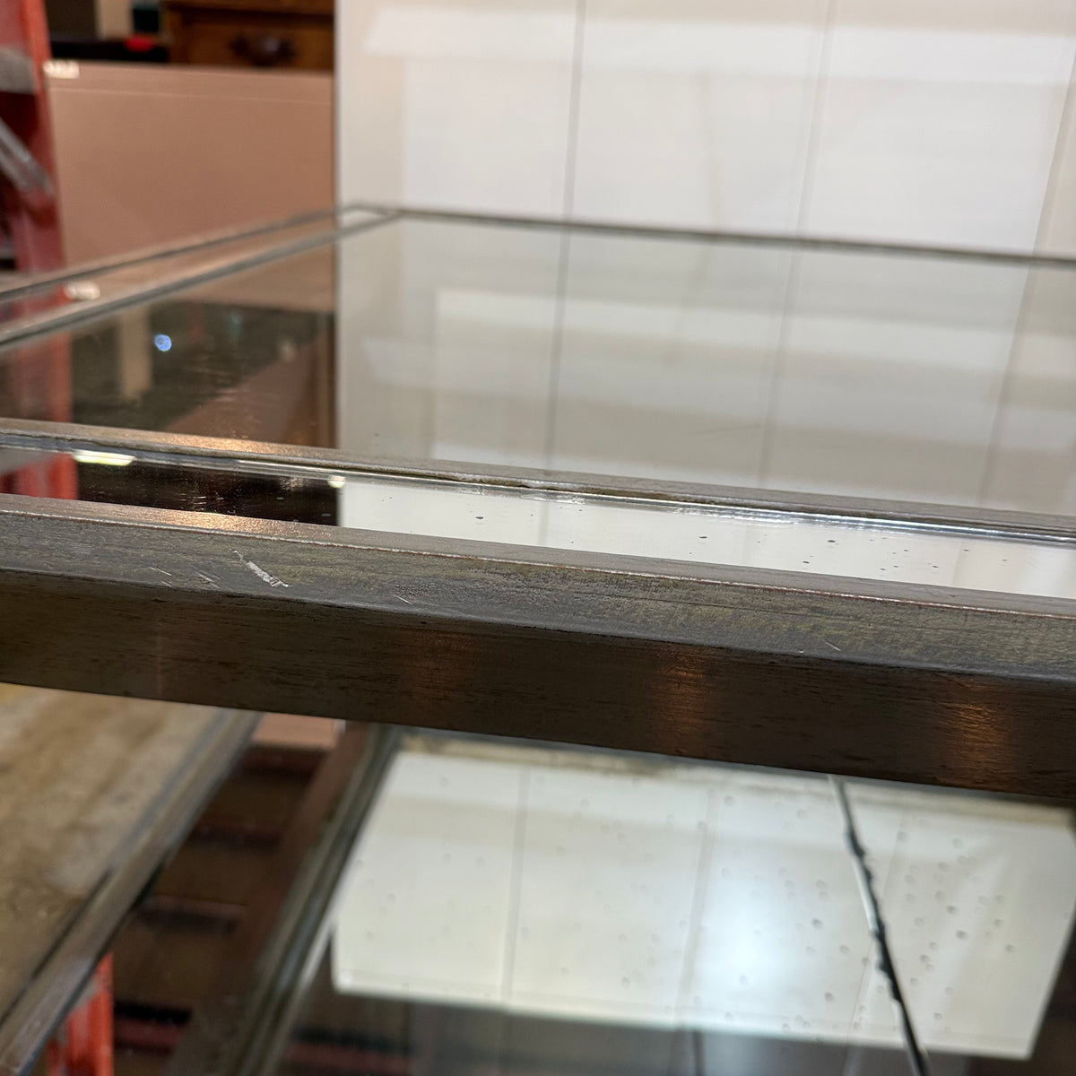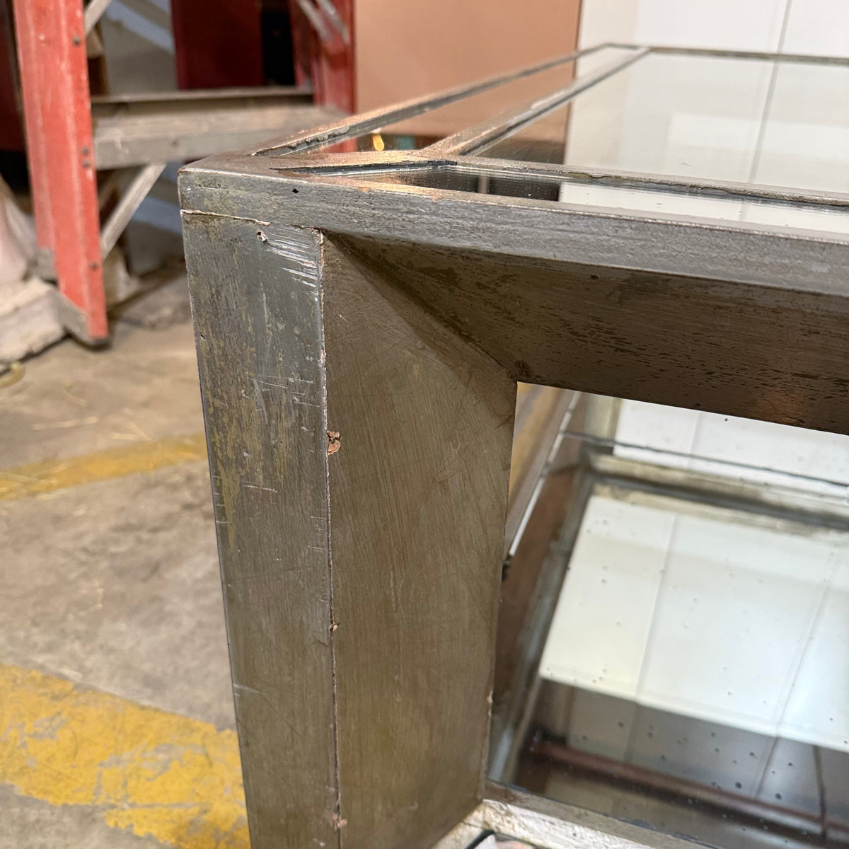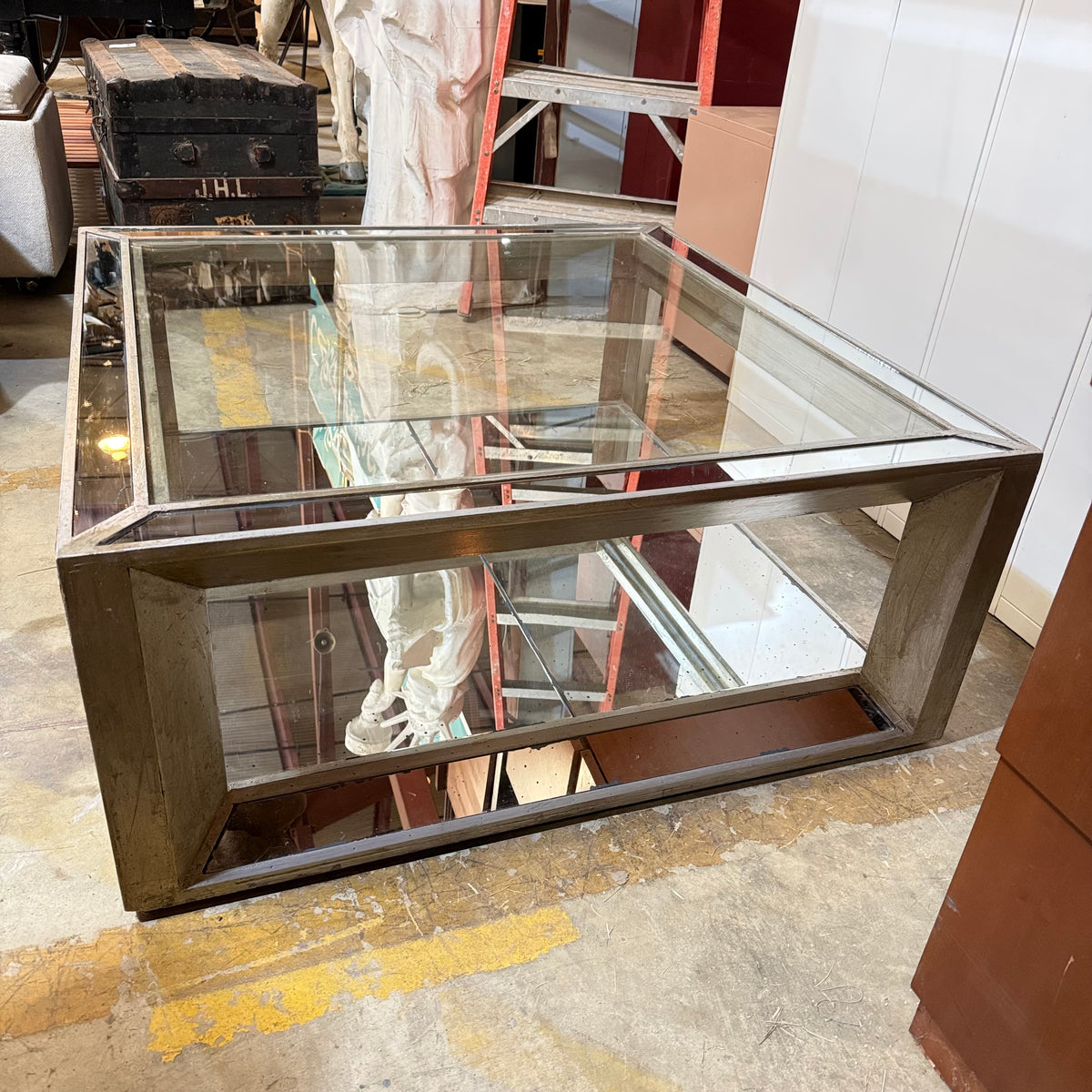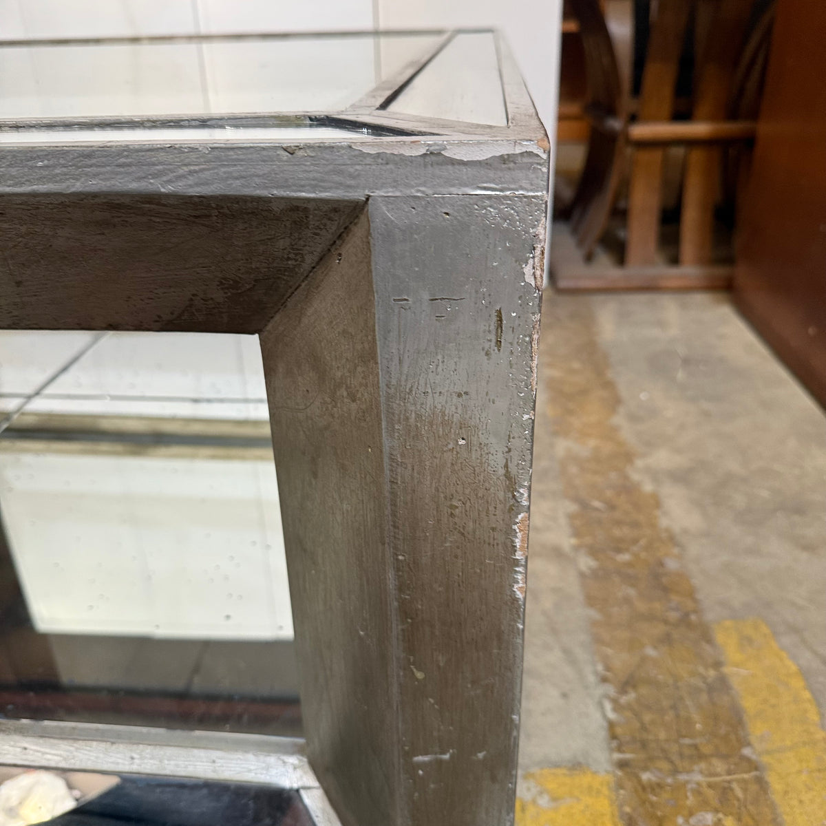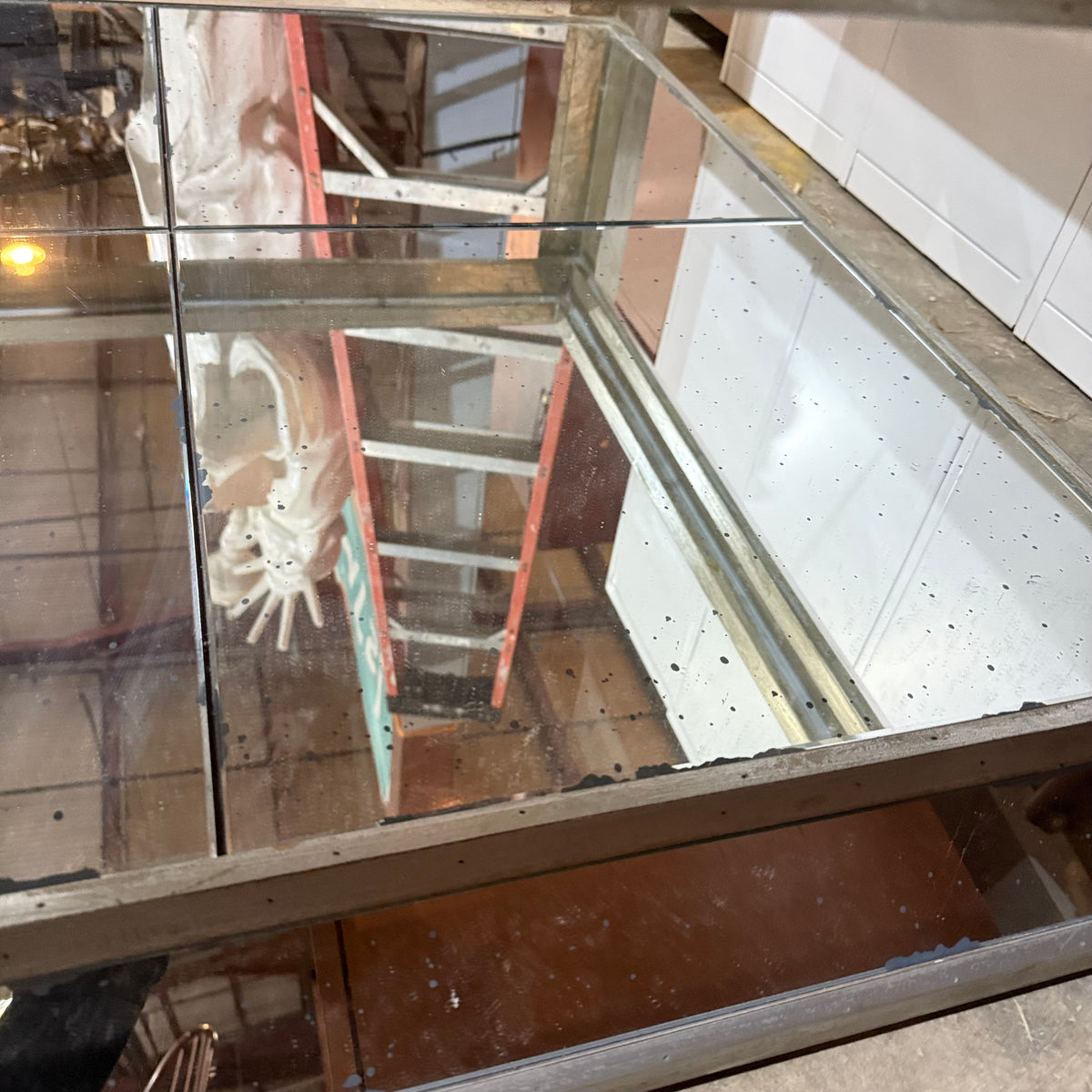 This product is a previously owned mirrored and glass top coffee table. It sits on a hefty frame and features a glass top with mirror pieces of paneling along the sides and a mirrored lower-tier open shelf space below.