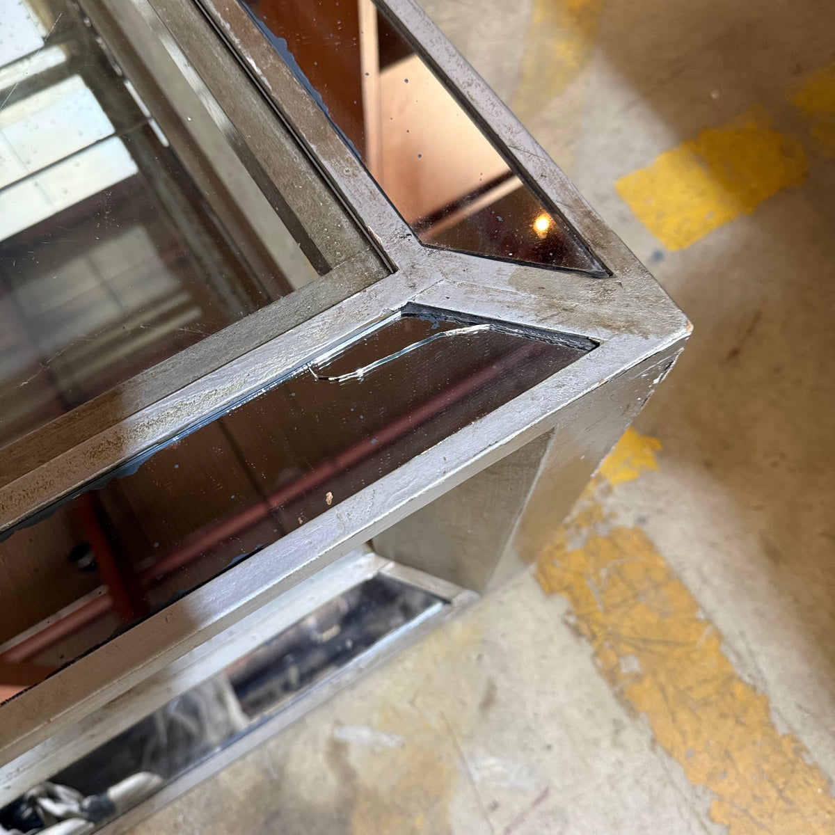 Please note, there is a small crack to the mirror paneling towards the top nearby one of the corners. There is also wear and chipping to the finish throughout the frame (see photos).