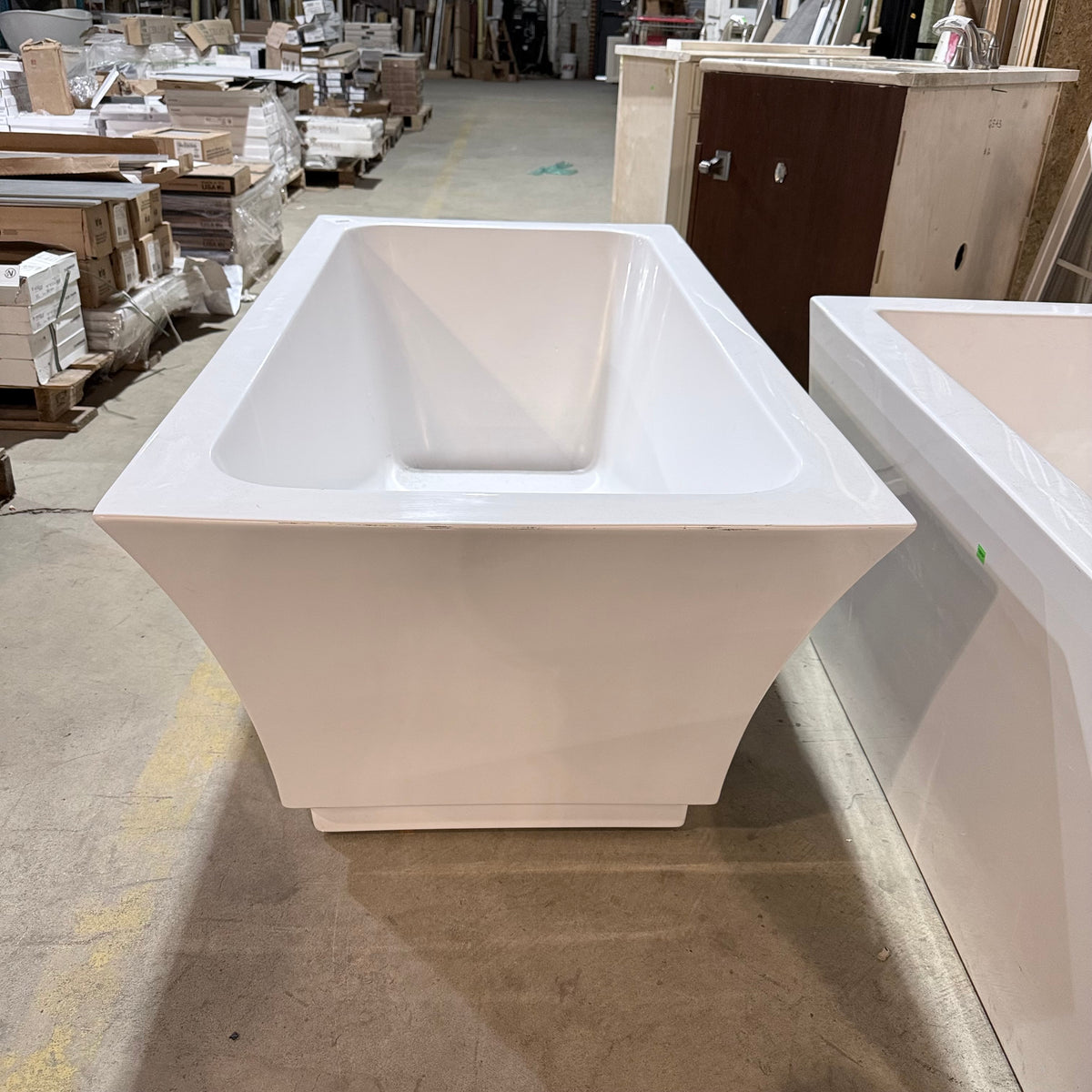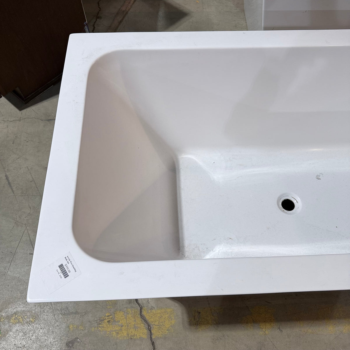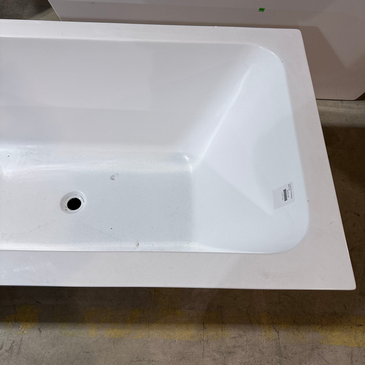 This is a previously owned 59" acrylic and fiberglass soaking bathtub in a glossy white finish. It sits on a subtle integrated base with leveling feet underneath and features a contemporary, minimalistic style with clean, straight lines and slightly flared sidewalls. There is a drain hole cut-out at the bottom. There is no overflow hole cut-out on this bath tub. The bathtub is designed for use with a floor-mounted or wall-mounted faucet.
