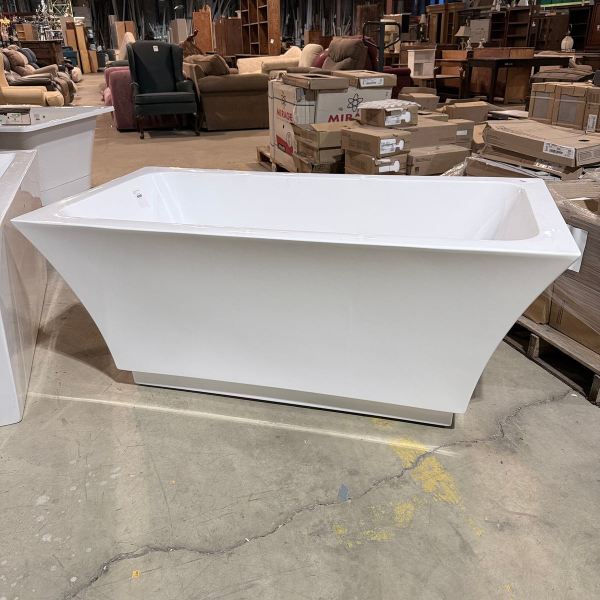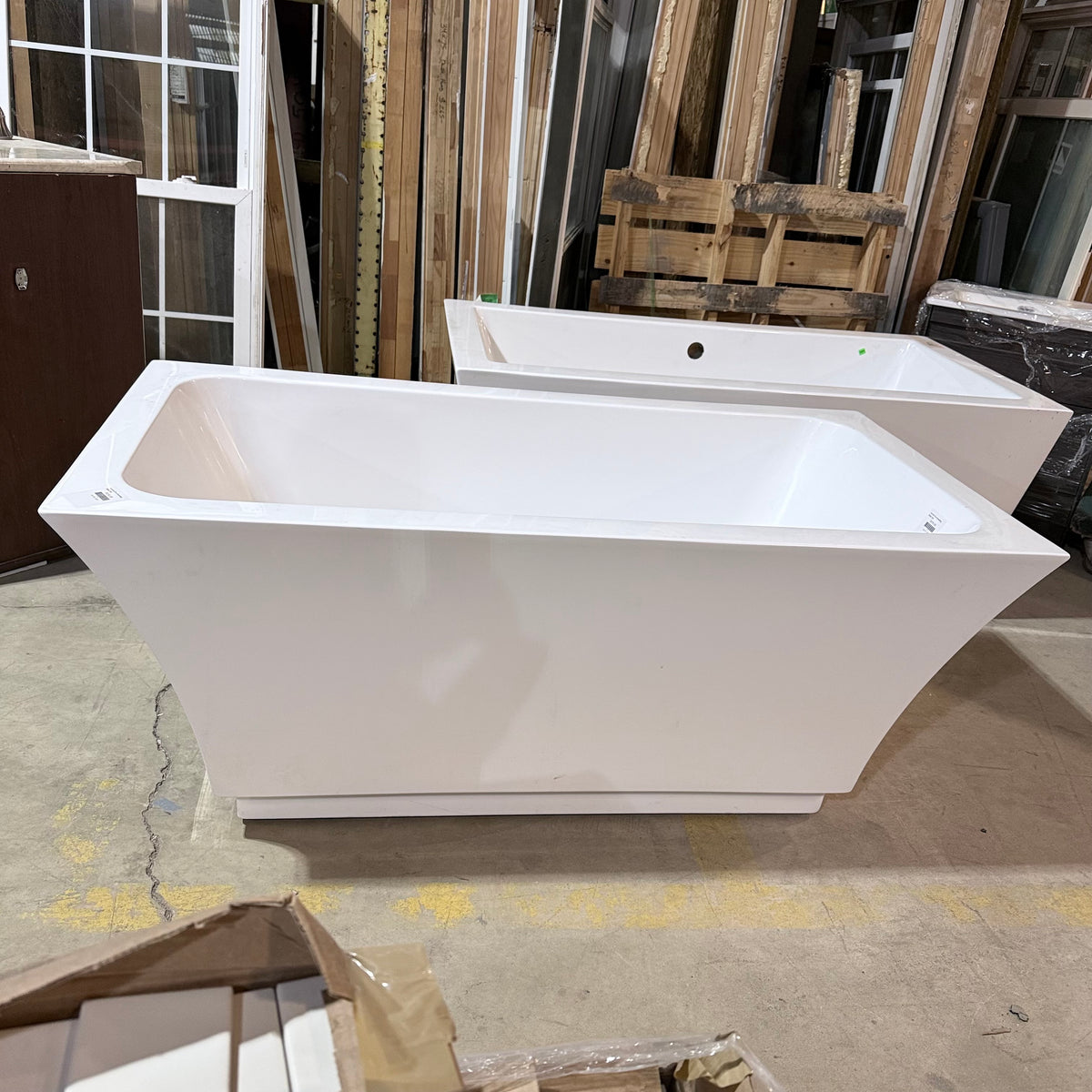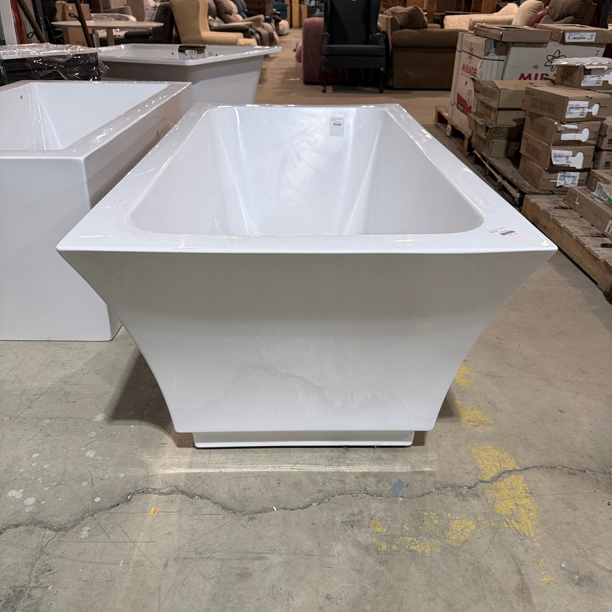 This is a previously owned 59" acrylic and fiberglass soaking bathtub in a glossy white finish. It sits on a subtle integrated base with leveling feet underneath and features a contemporary, minimalistic style with clean, straight lines and slightly flared sidewalls. There is a drain hole cut-out at the bottom. There is no overflow hole cut-out on this bath tub. The bathtub is designed for use with a floor-mounted or wall-mounted faucet.