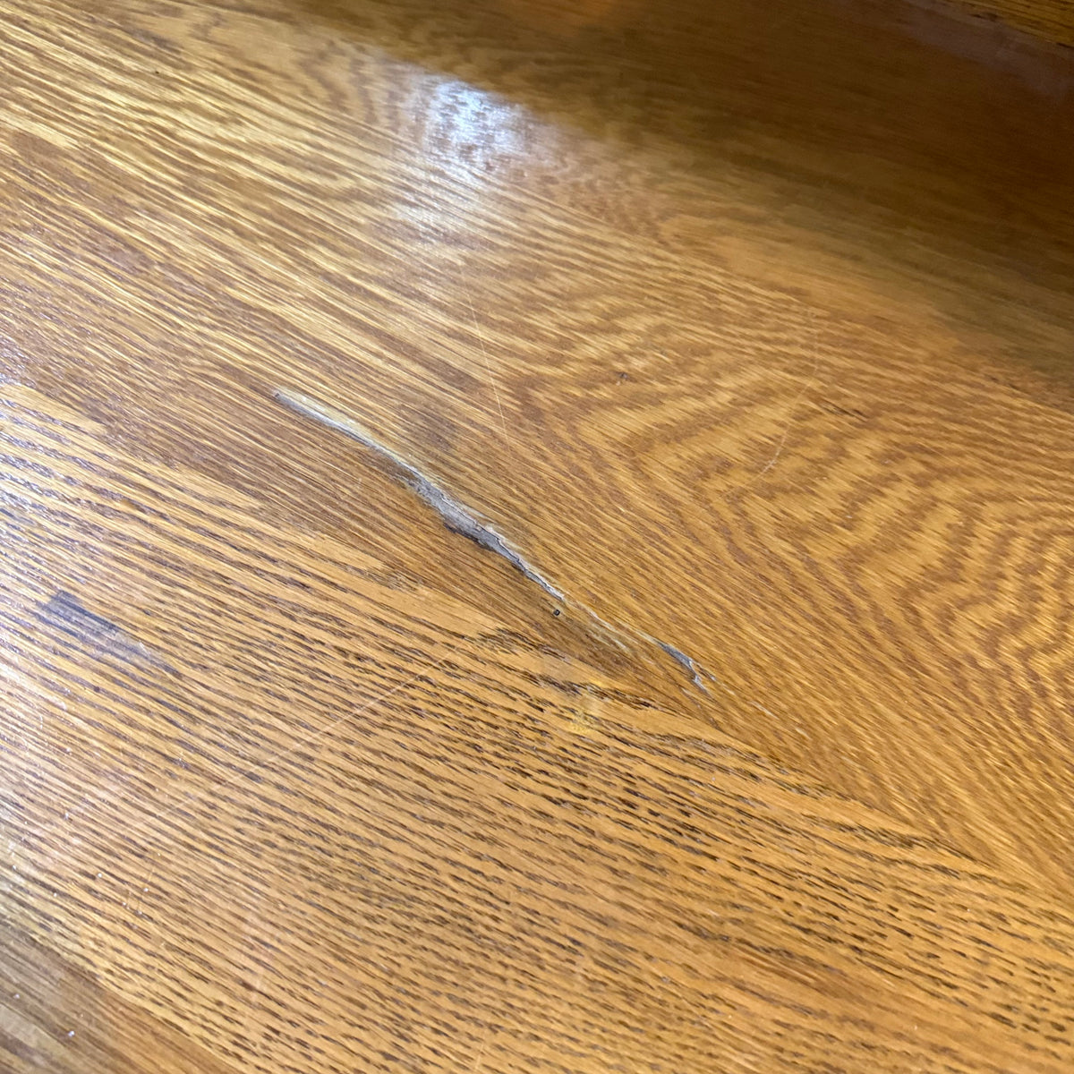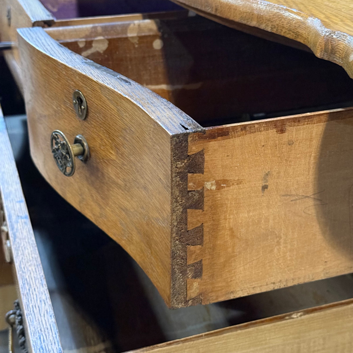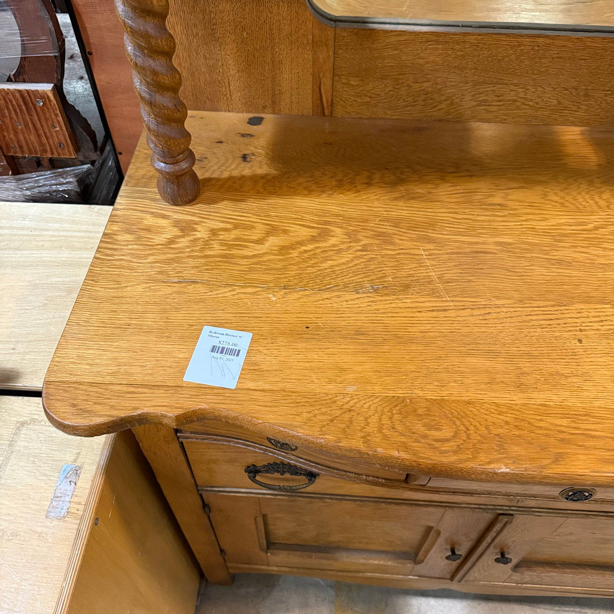 Please note, there is a small, but kind of deep nick to the wood along the surface top. There is also wear to the finish in some areas and some of the knob hardware has been replaced. Please also note, there is some loss to the silvering on the mirror (see photos).