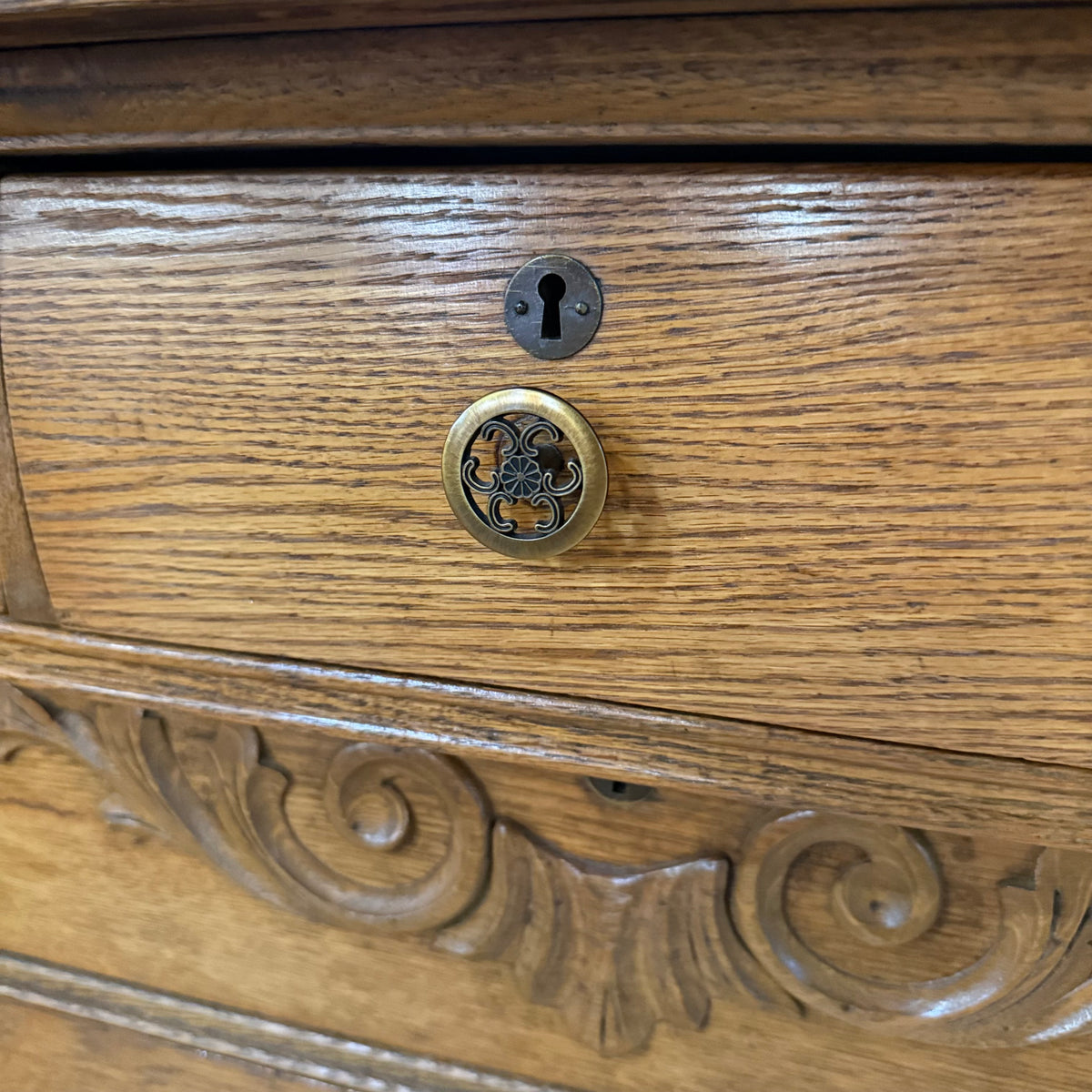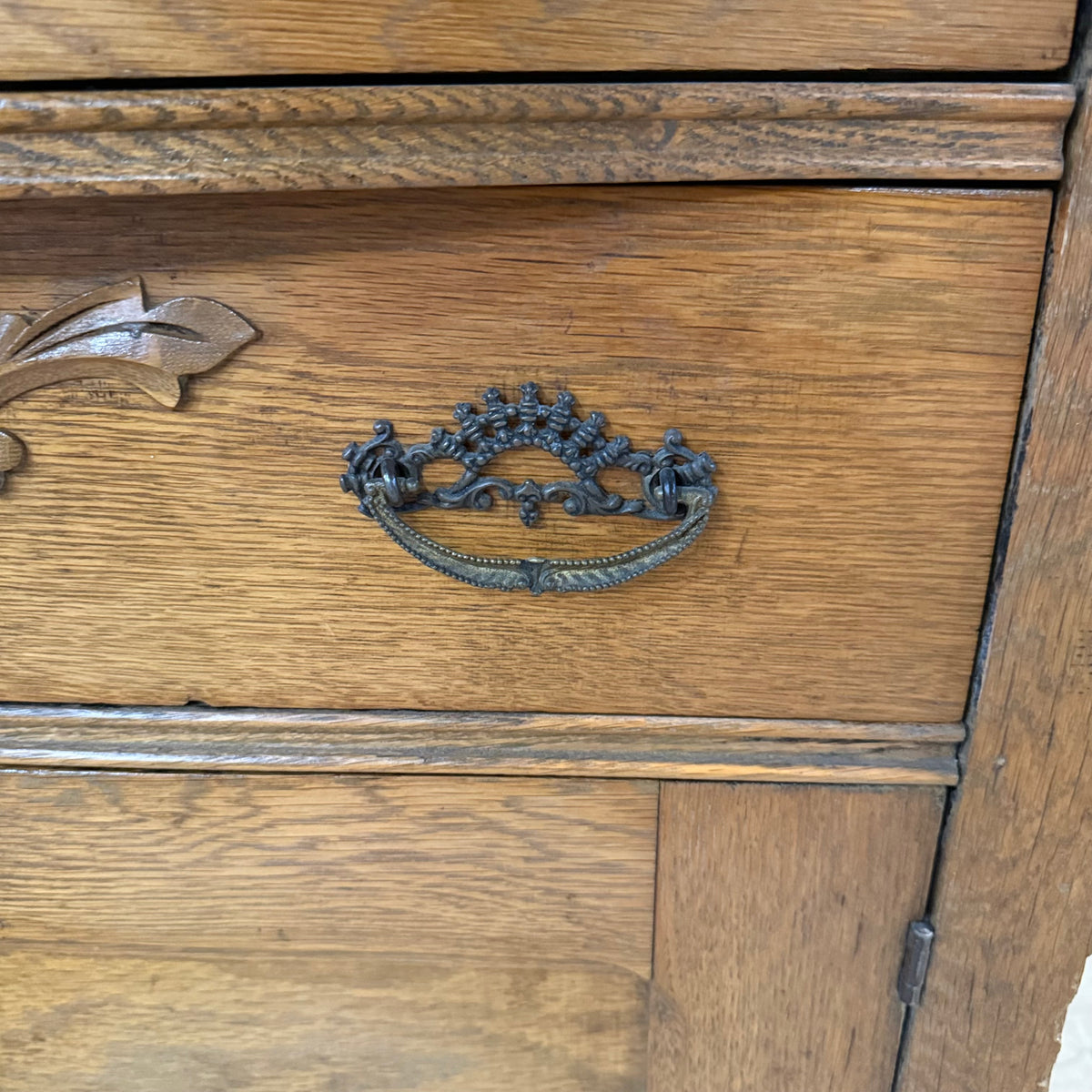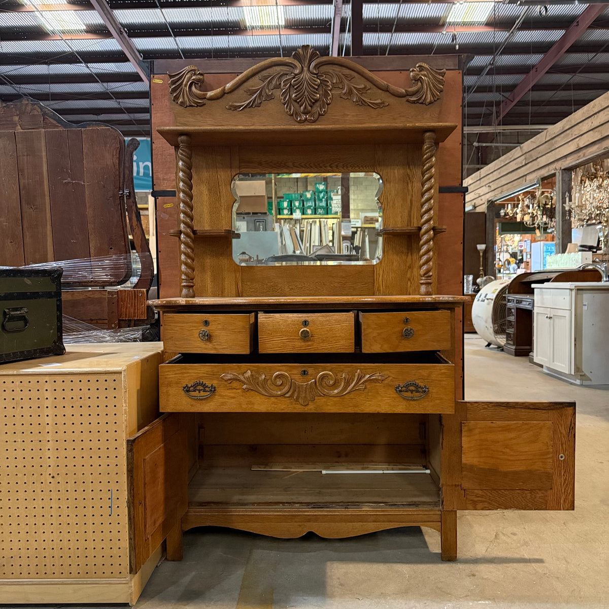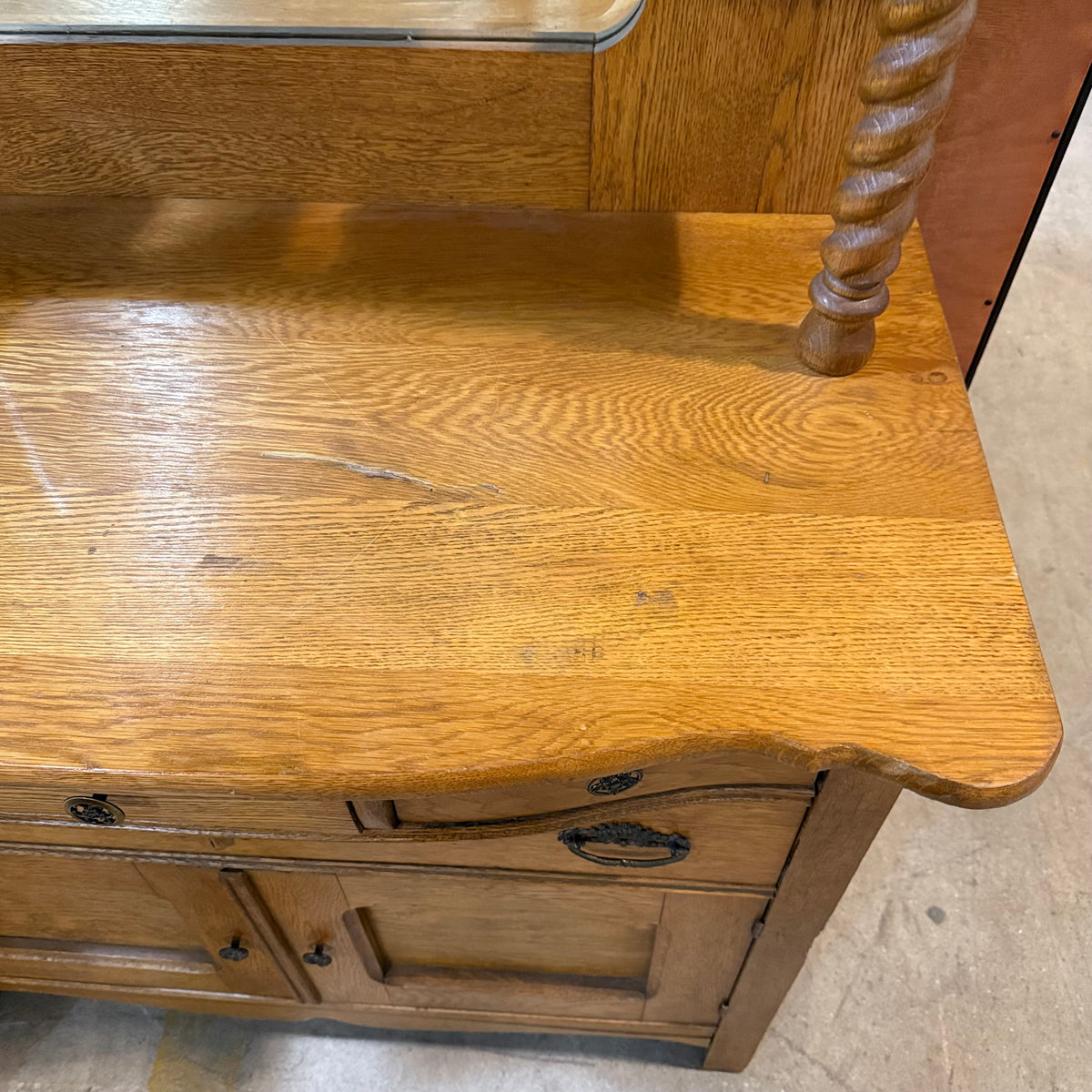 This ornately carved vintage oak sideboard features beautiful quarter sawn tiger oak throughout, a large display shelf overhead with turned support columns at either side and applied trim along the back, a mirror with a beveled edge and two smaller shelves at either side of the mirror. It has four drawers with applied scrolling trim across the larger drawer front and finished with matching pull hardware. There is also a lower storage cabinet behind the double doors. This piece has a rich, warm stain that accentuates the highlights in the oak woodgrain. This sideboard is made in 2 pieces for moving; it is made of solid wood and is quite heavy. There is no key included.
