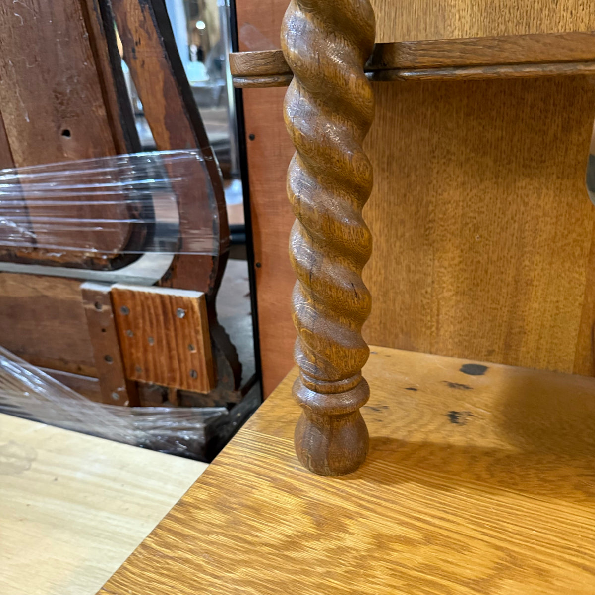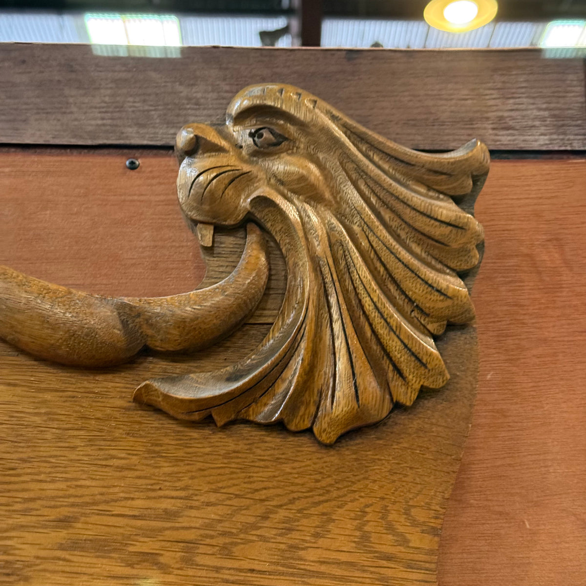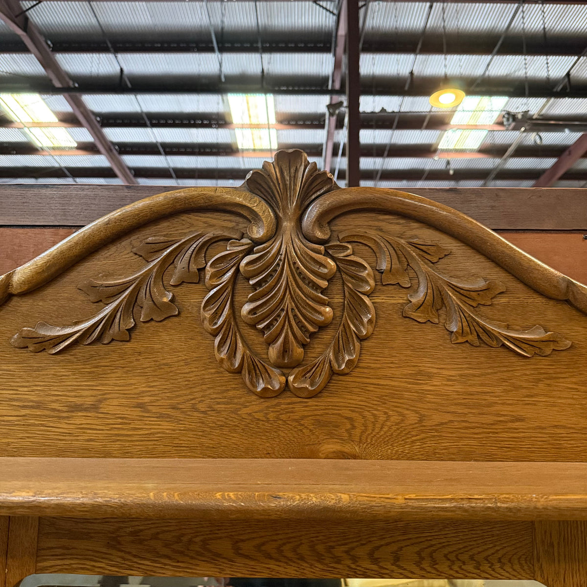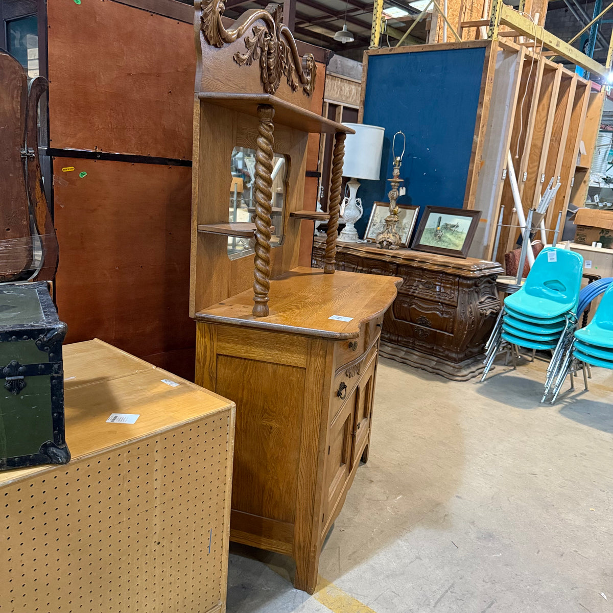 This ornately carved vintage oak sideboard features beautiful quarter sawn tiger oak throughout, a large display shelf overhead with turned support columns at either side and applied trim along the back, a mirror with a beveled edge and two smaller shelves at either side of the mirror. It has four drawers with applied scrolling trim across the larger drawer front and finished with matching pull hardware. There is also a lower storage cabinet behind the double doors. This piece has a rich, warm stain that accentuates the highlights in the oak woodgrain. This sideboard is made in 2 pieces for moving; it is made of solid wood and is quite heavy. There is no key included.