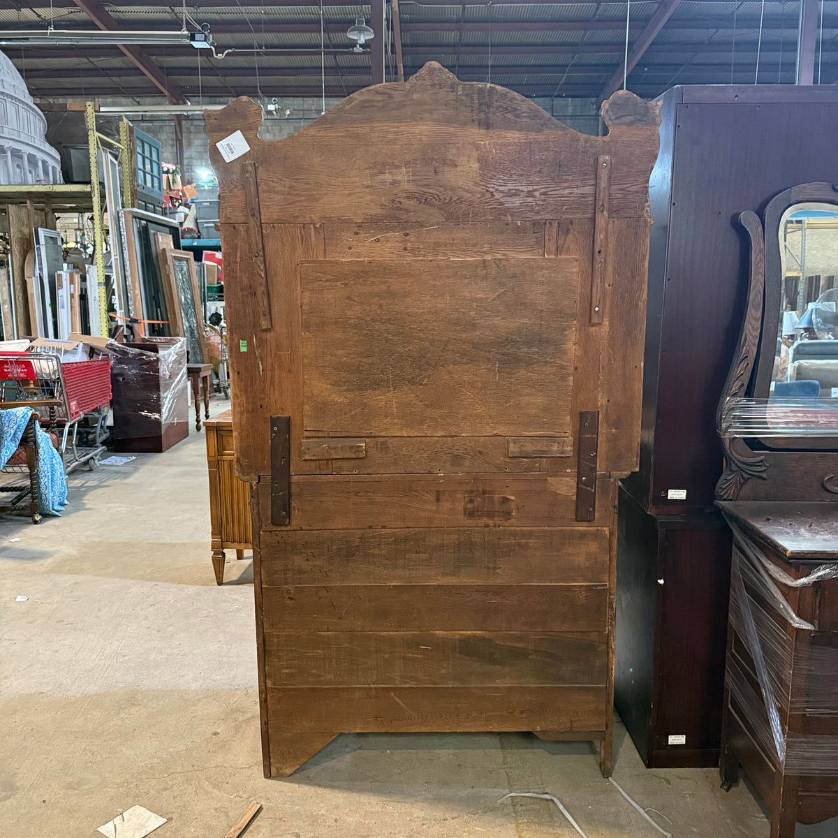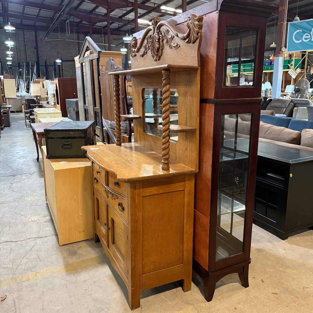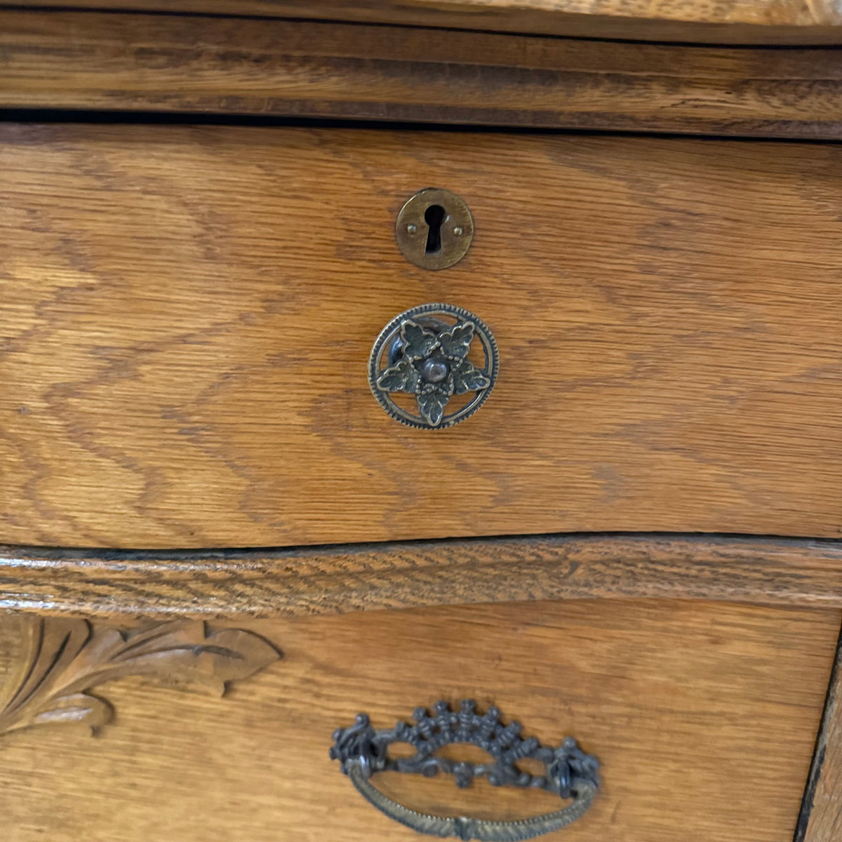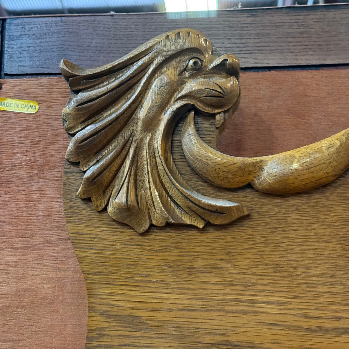 This ornately carved vintage oak sideboard features beautiful quarter sawn tiger oak throughout, a large display shelf overhead with turned support columns at either side and applied trim along the back, a mirror with a beveled edge and two smaller shelves at either side of the mirror. It has four drawers with applied scrolling trim across the larger drawer front and finished with matching pull hardware. There is also a lower storage cabinet behind the double doors. This piece has a rich, warm stain that accentuates the highlights in the oak woodgrain. This sideboard is made in 2 pieces for moving; it is made of solid wood and is quite heavy. There is no key included.