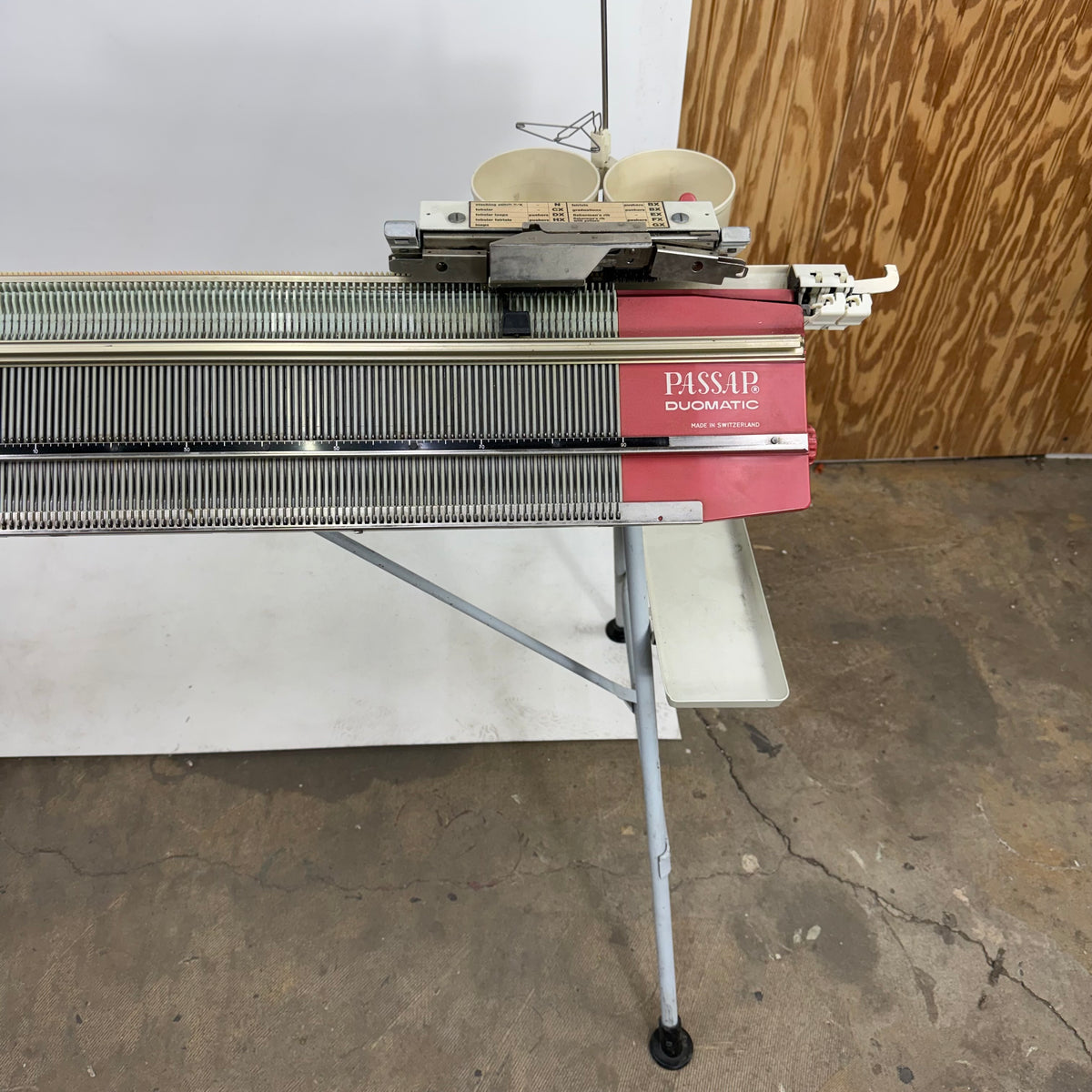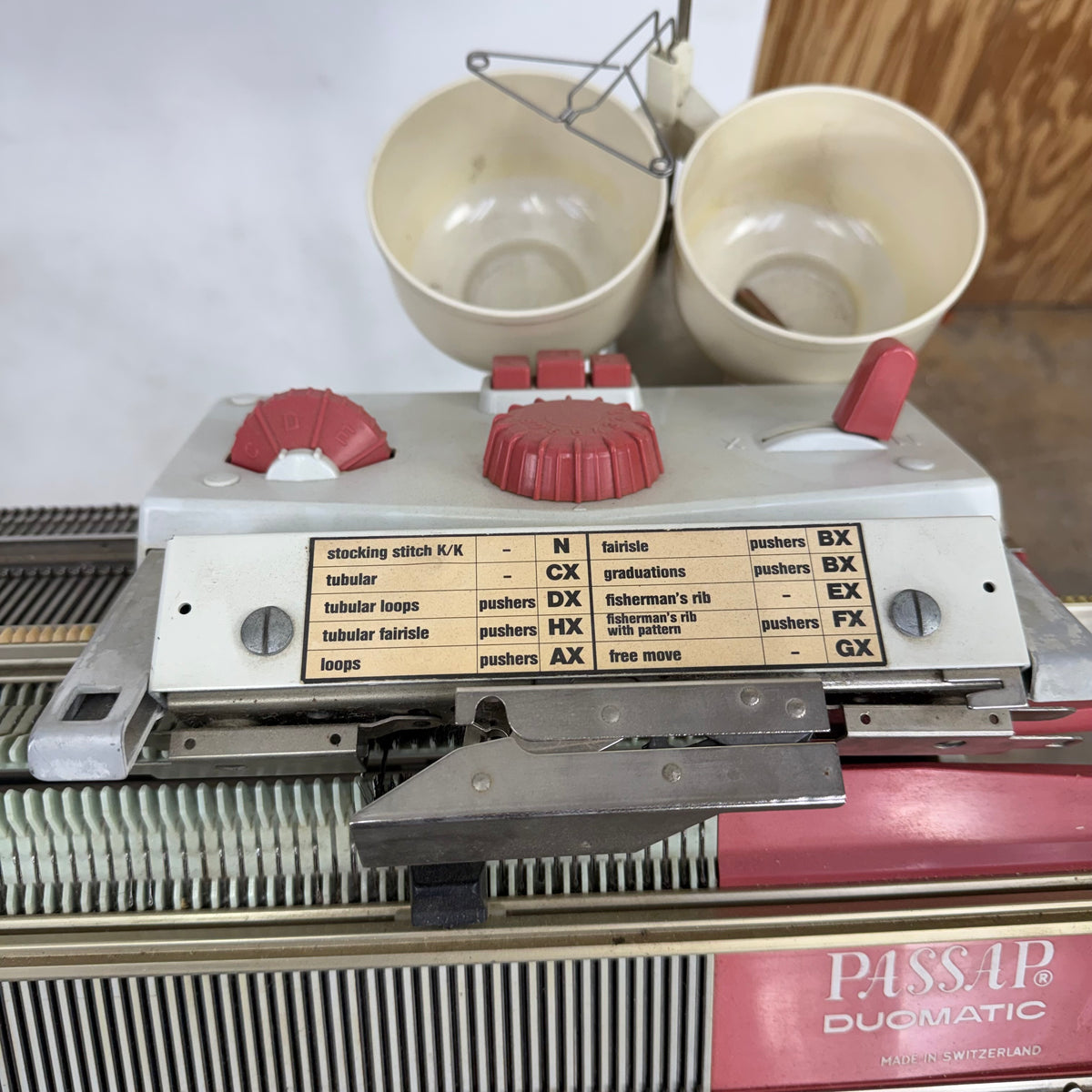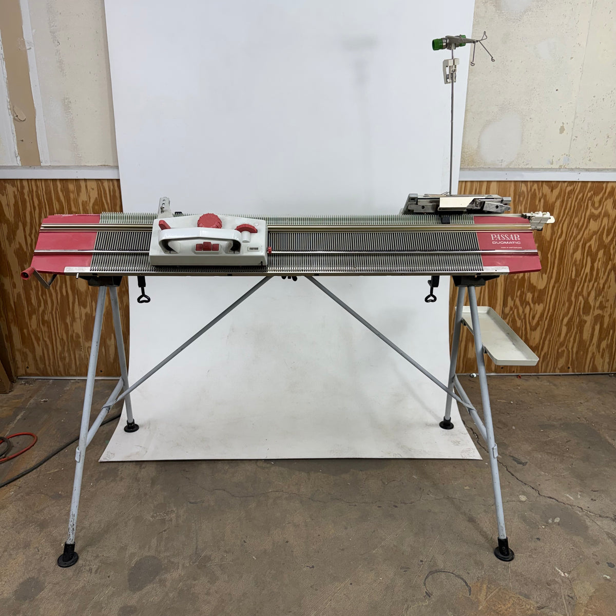 This product is a previously owned Passap duomatic pinkie knitting machine with accessories included. It comes with two needlebeds with needles and pushers, a yarn holder attachment with yarn feeders, a front lock/carriage, a back lock/carriage, orange and black stripping tools, weights and a couple of other accessories. The locks/carriages appear to be in great shape. This knitting machine has been taken apart and will need to be re-assembled after purchase. Click here to view the online manual for this machine.