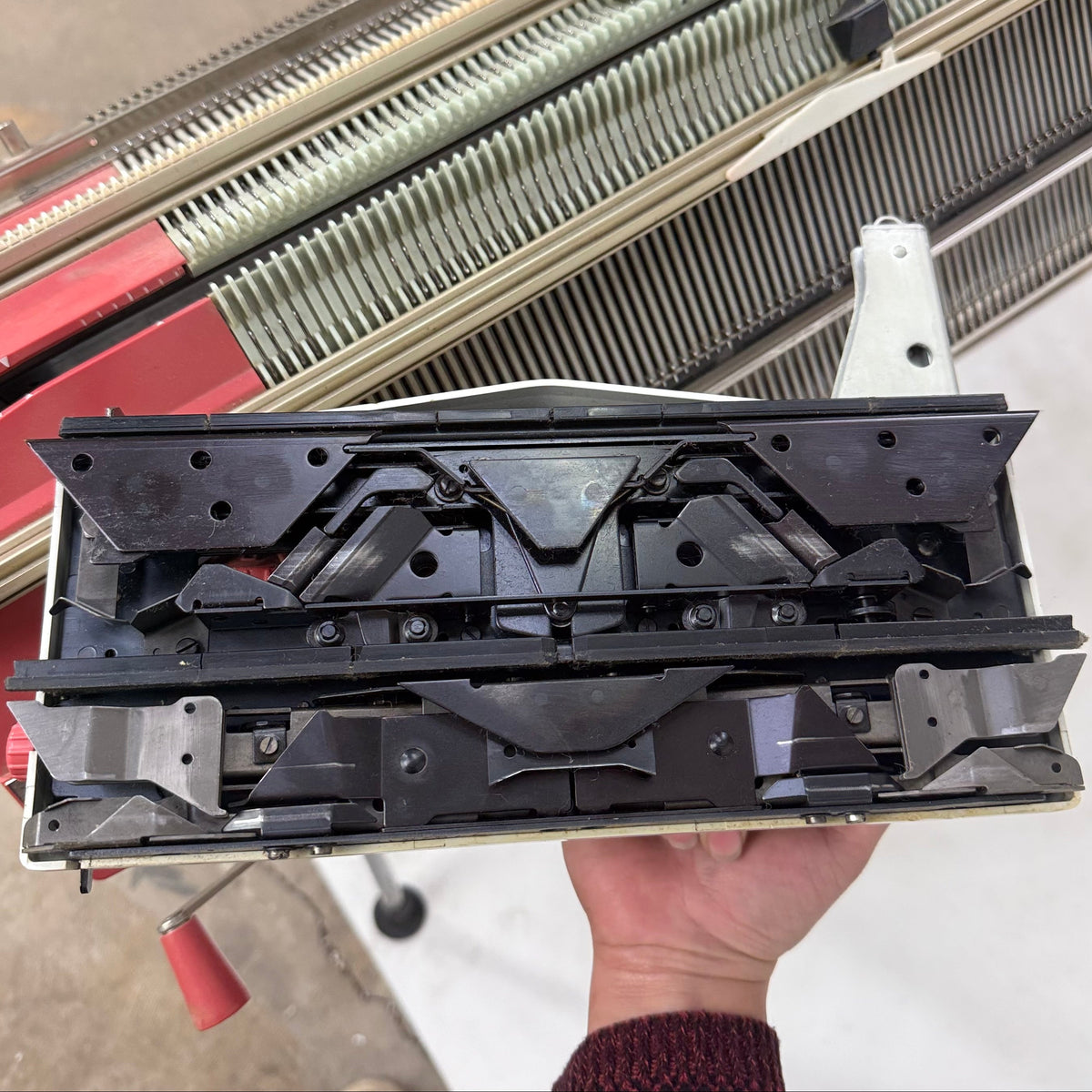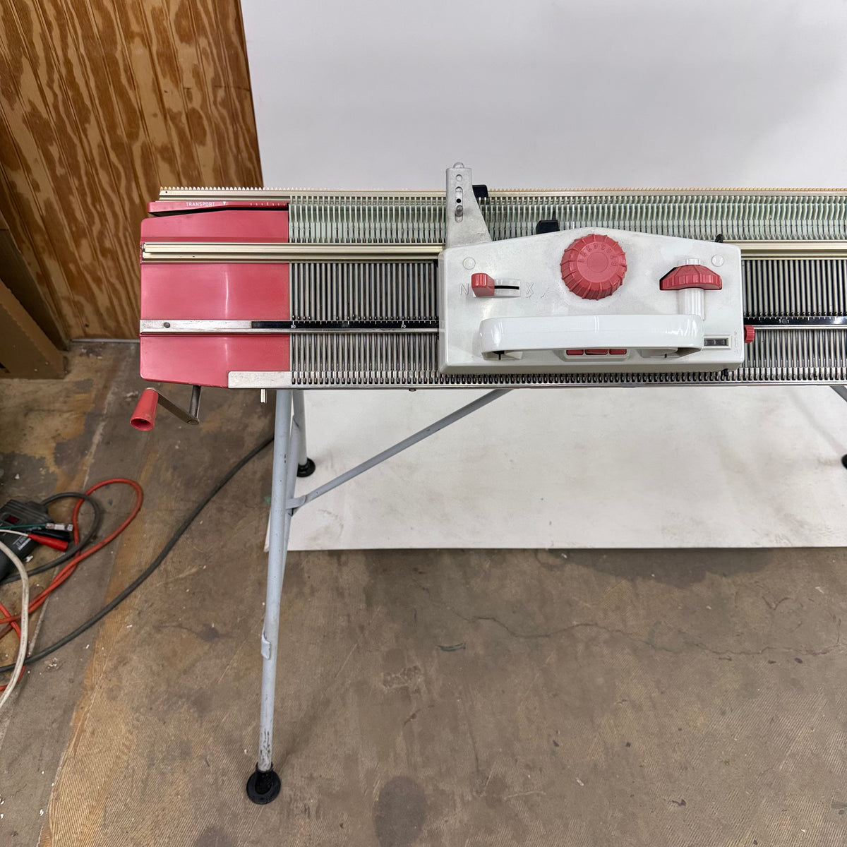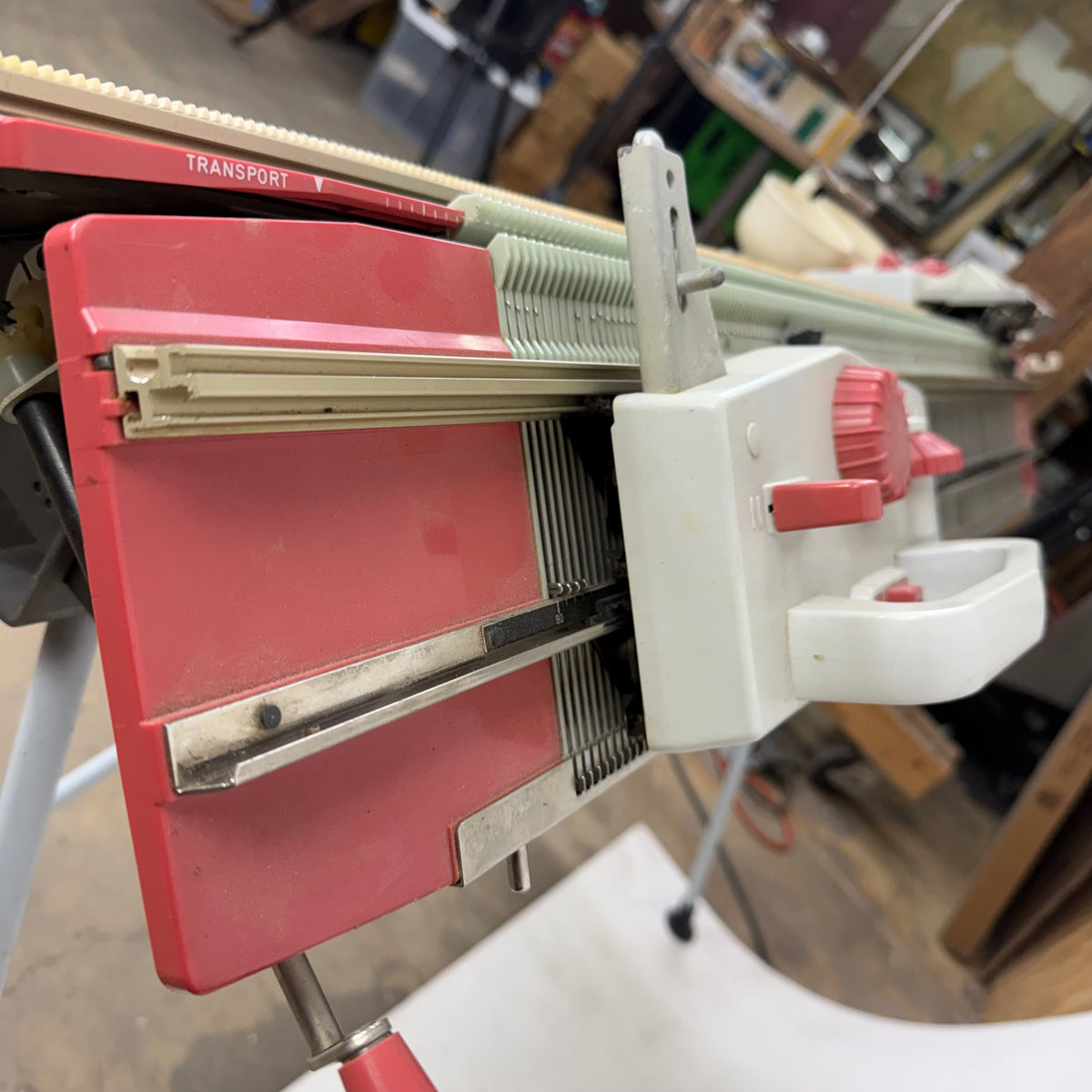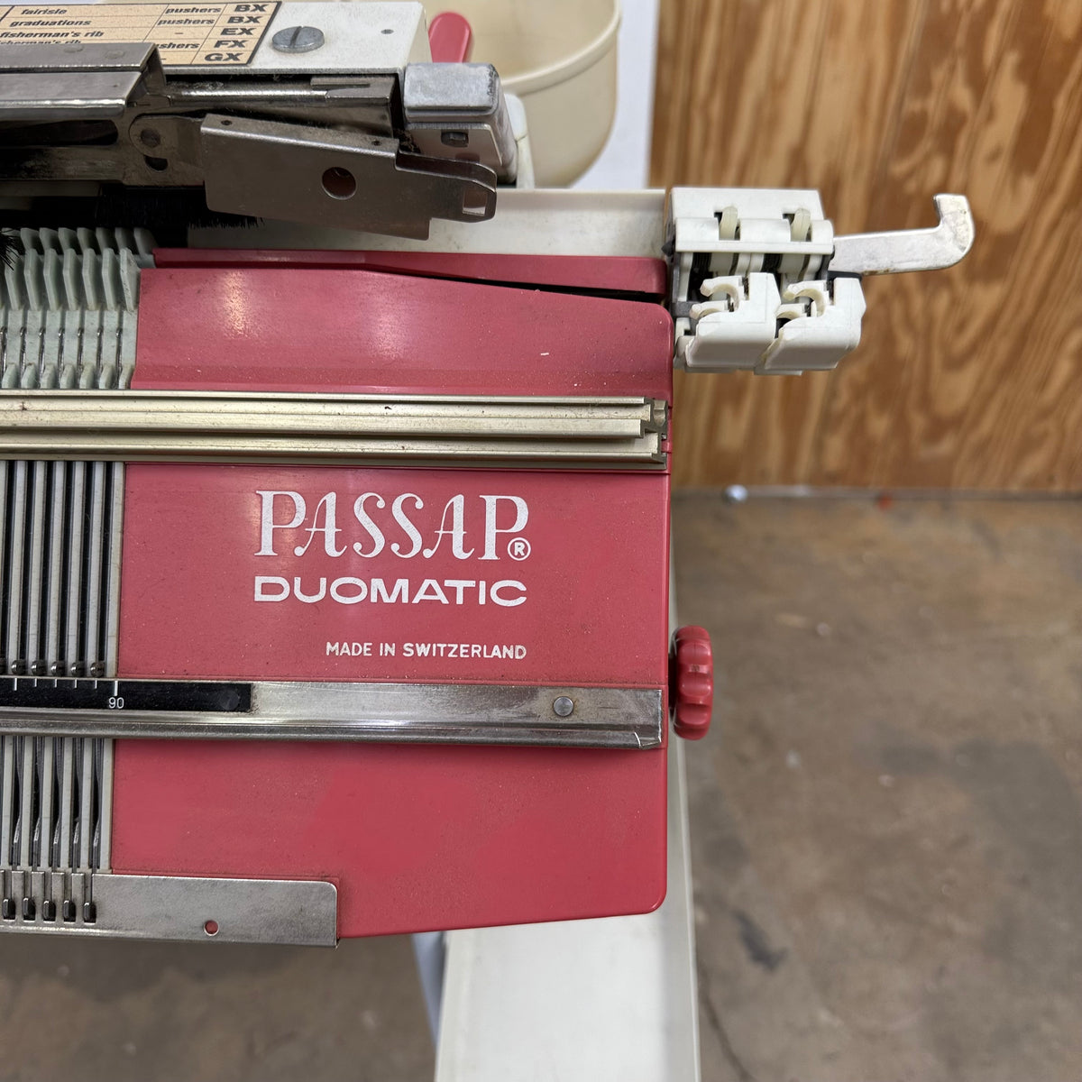 This product is a previously owned Passap duomatic pinkie knitting machine with accessories included. It comes with two needlebeds with needles and pushers, a yarn holder attachment with yarn feeders, a front lock/carriage, a back lock/carriage, orange and black stripping tools, weights and a couple of other accessories. The locks/carriages appear to be in great shape. This knitting machine has been taken apart and will need to be re-assembled after purchase. Click here to view the online manual for this machine.