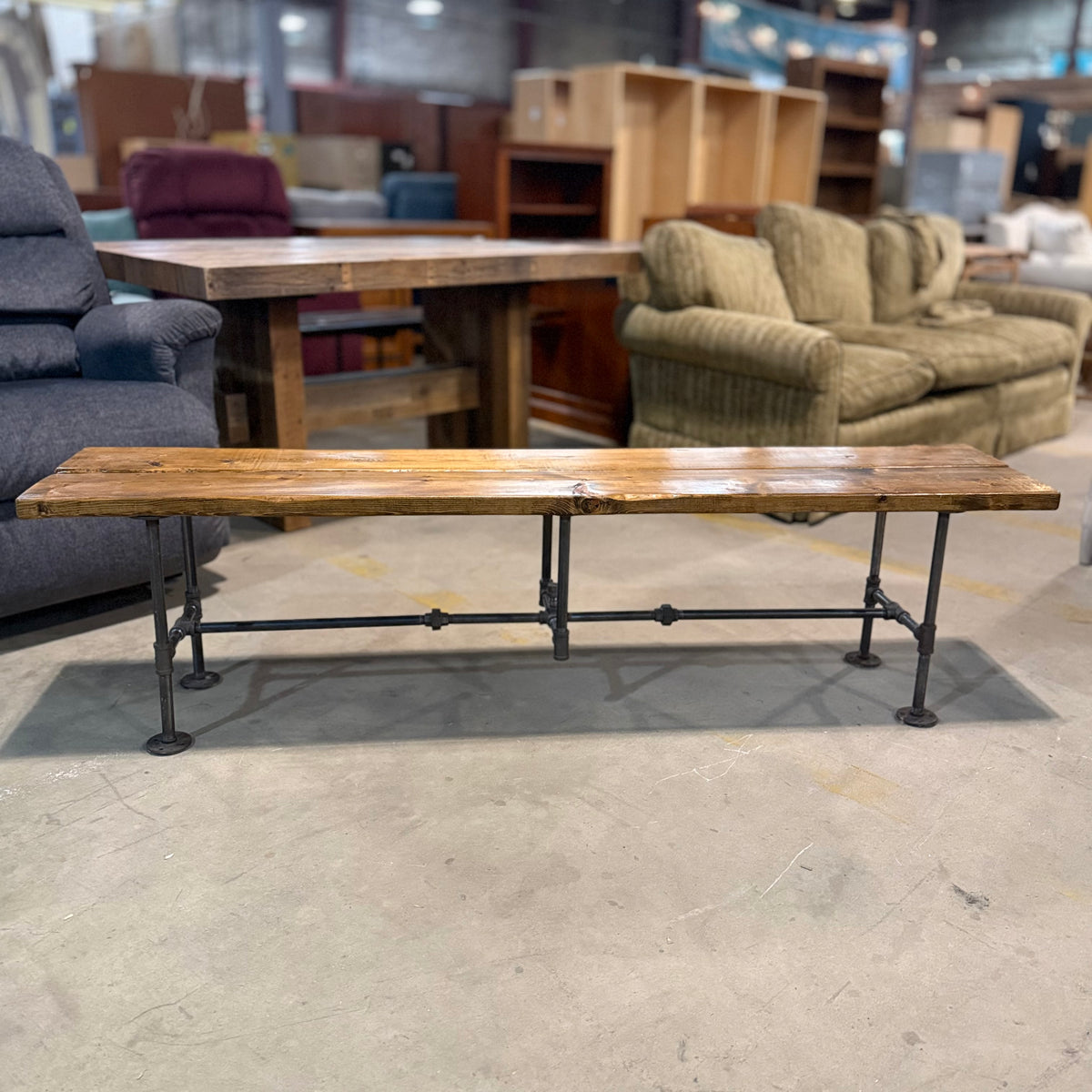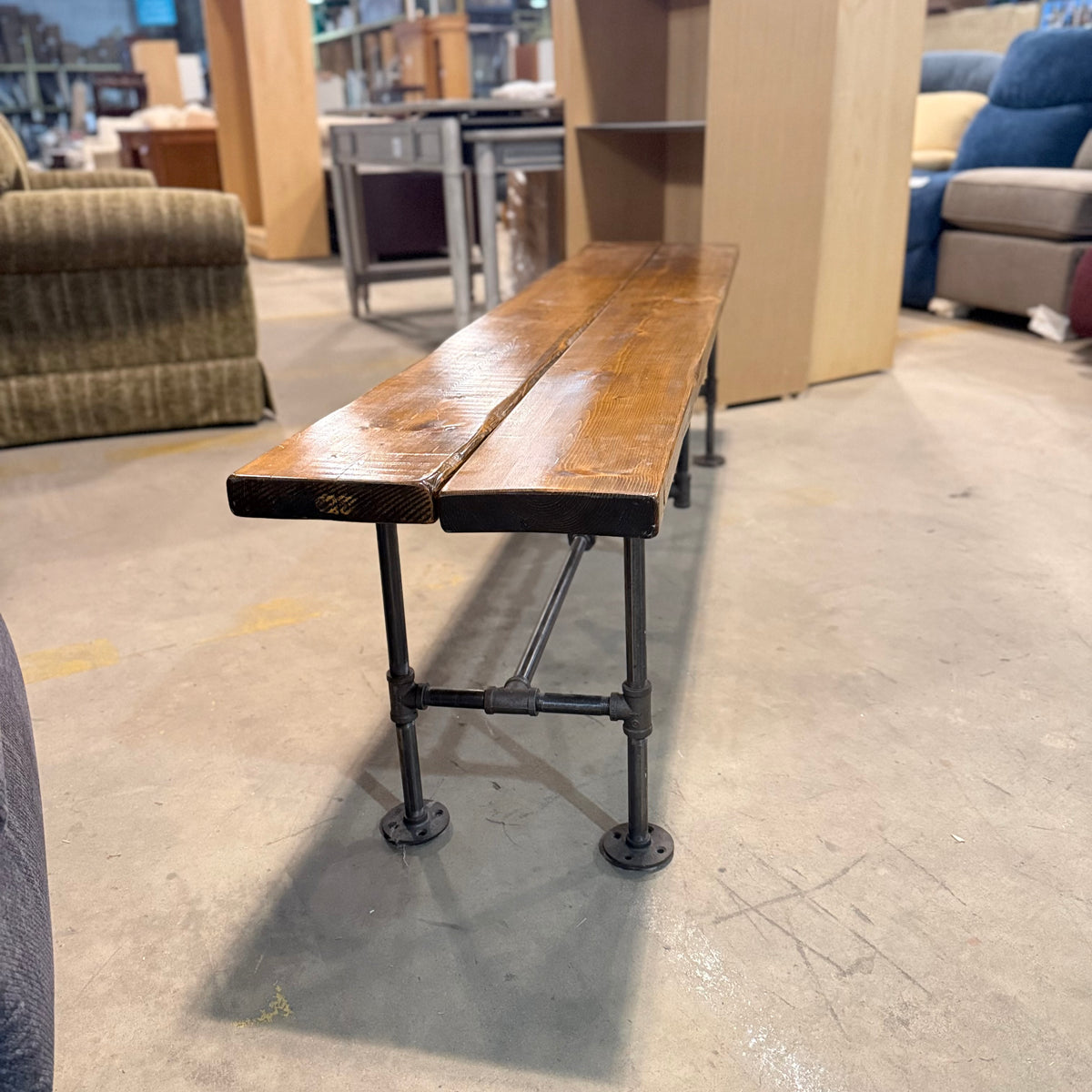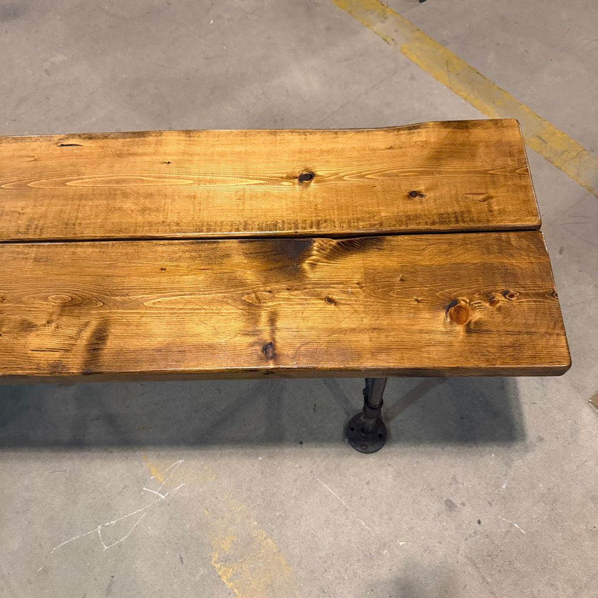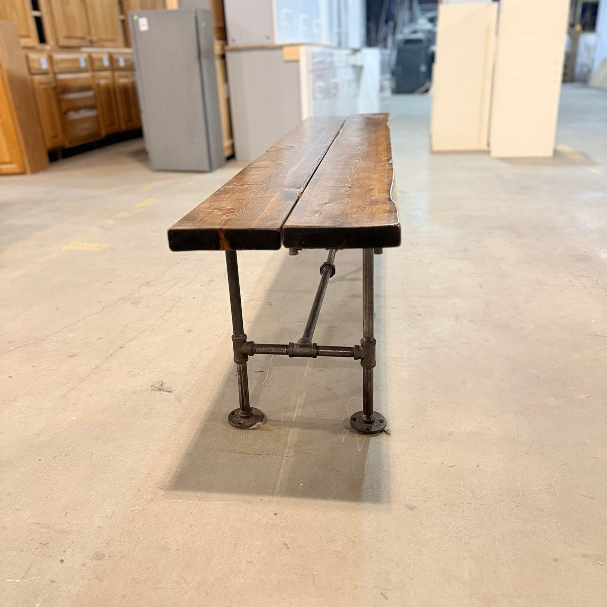 This previously owned pipe legged 2-slat wooden bench is made up of two planks made from reclaimed wood for the seating area and a base constructed using industrial-style metal piping and fittings.