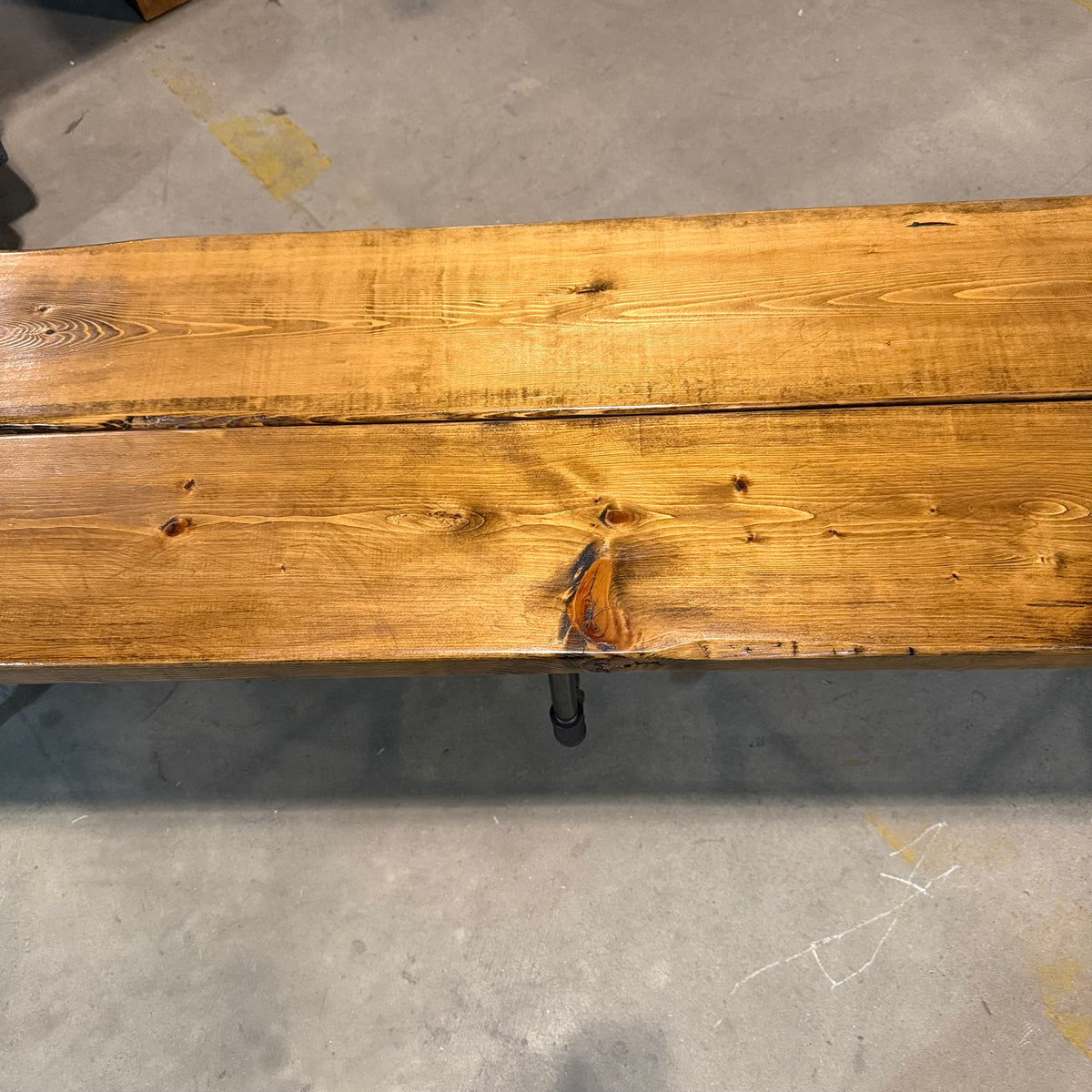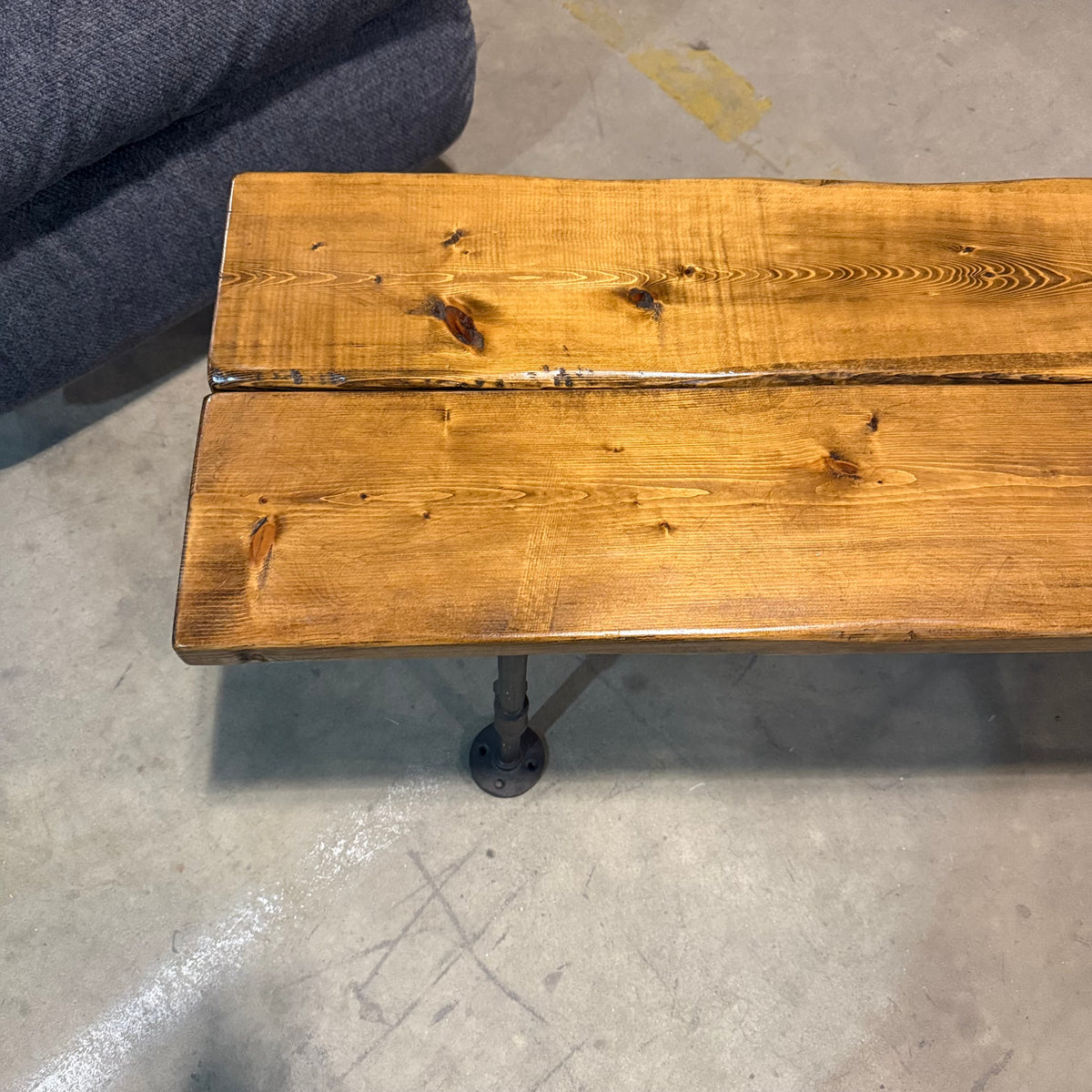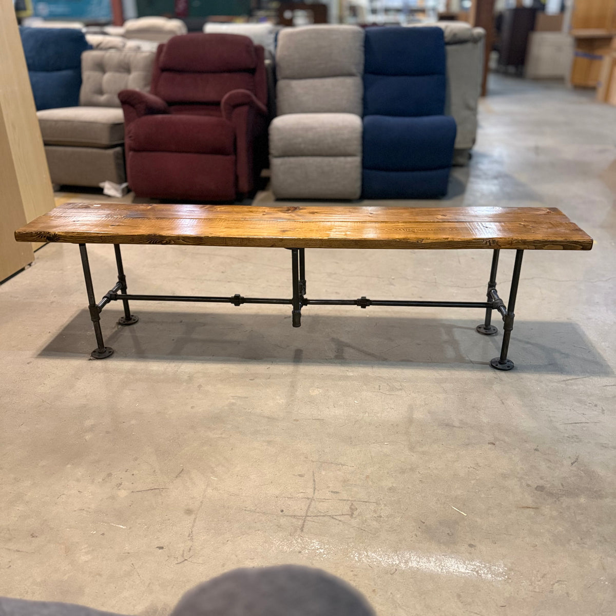 This previously owned pipe legged 2-slat wooden bench is made up of two planks made from reclaimed wood for the seating area and a base constructed using industrial-style metal piping and fittings.