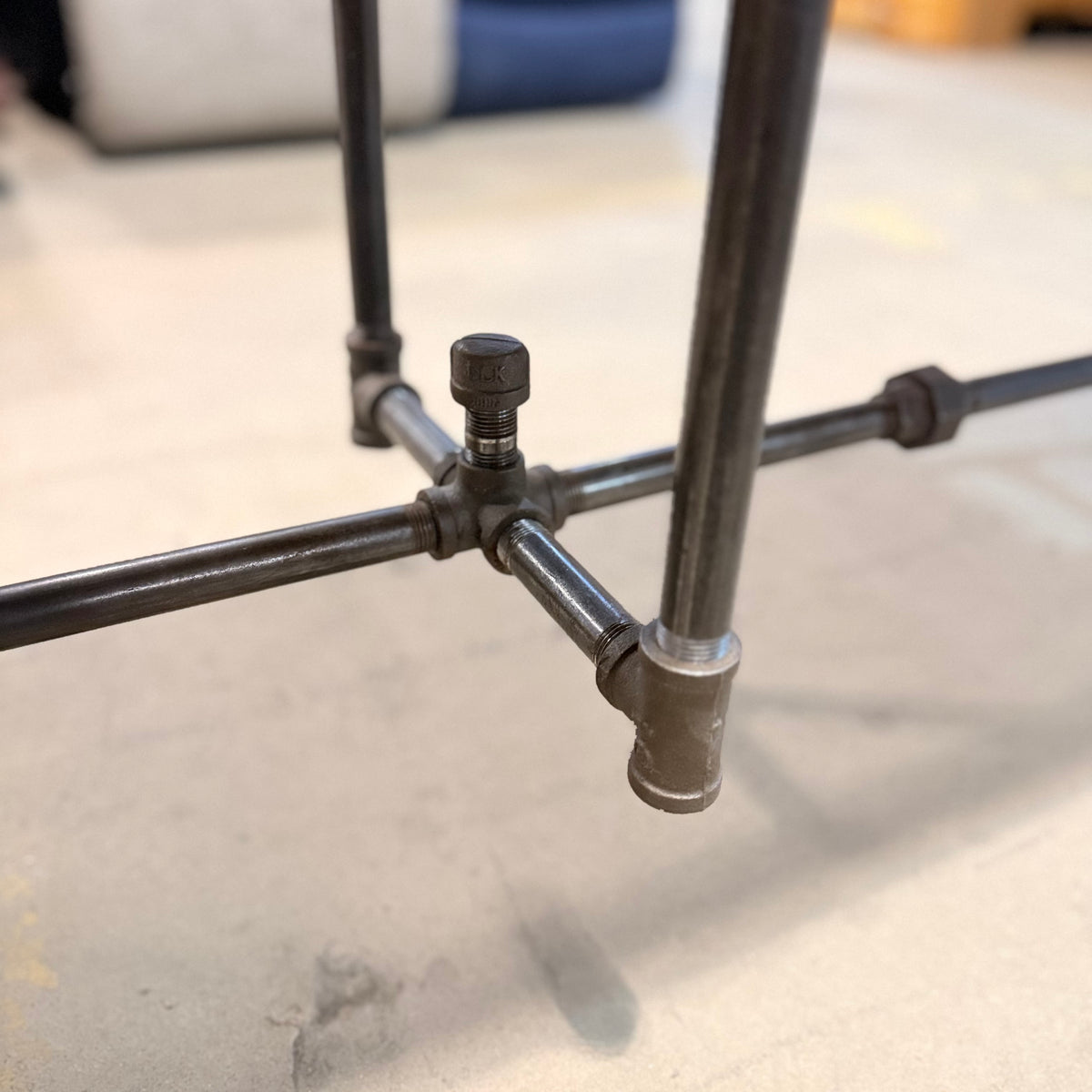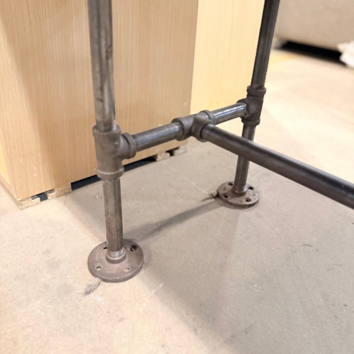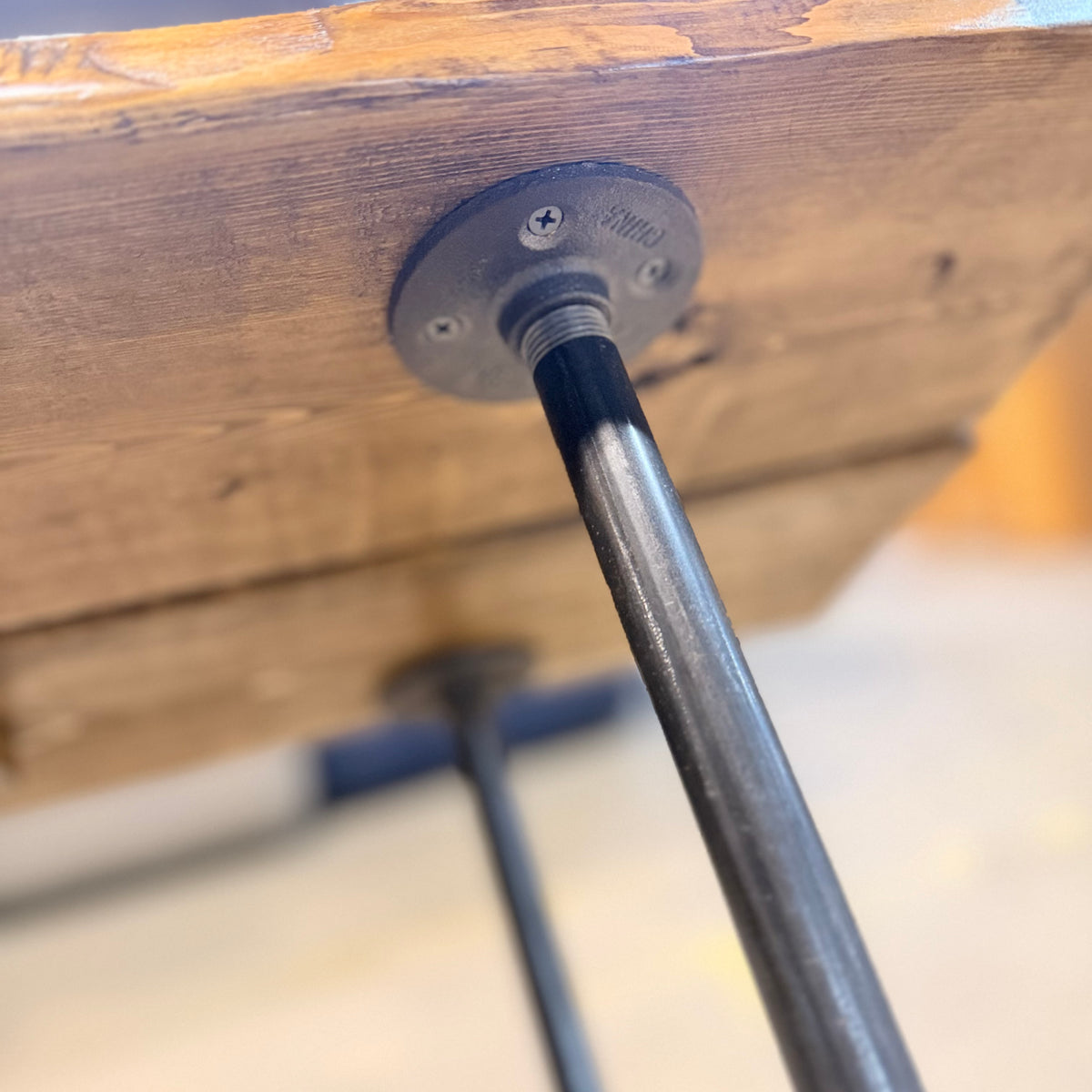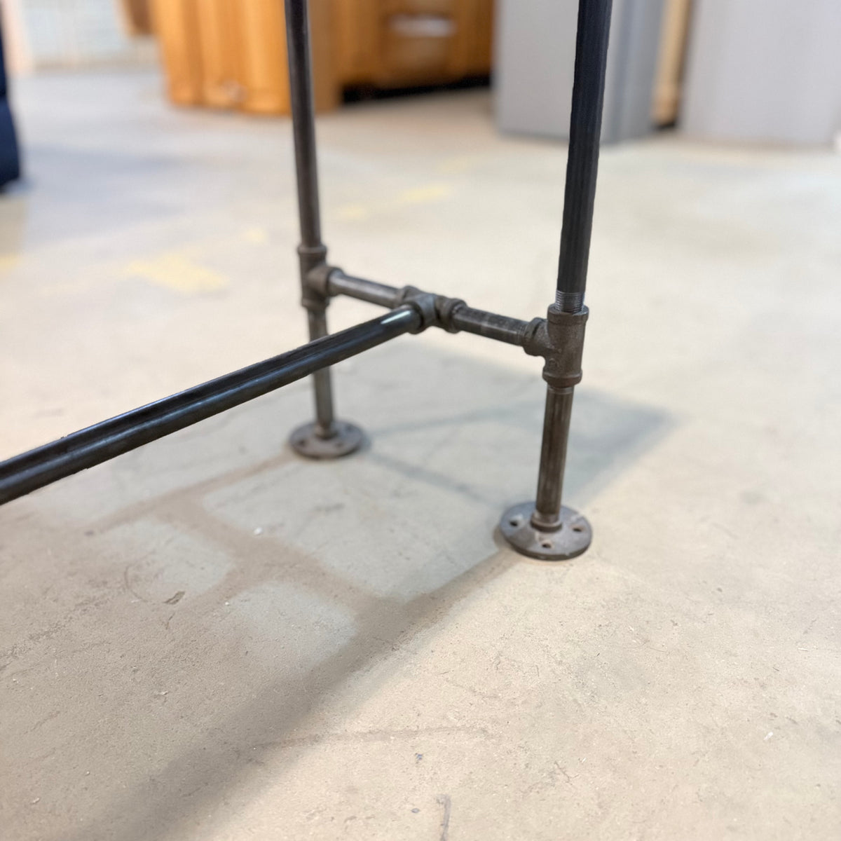 This previously owned pipe legged 2-slat wooden bench is made up of two planks made from reclaimed wood for the seating area and a base constructed using industrial-style metal piping and fittings.