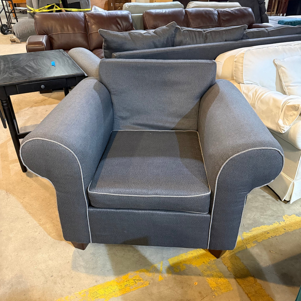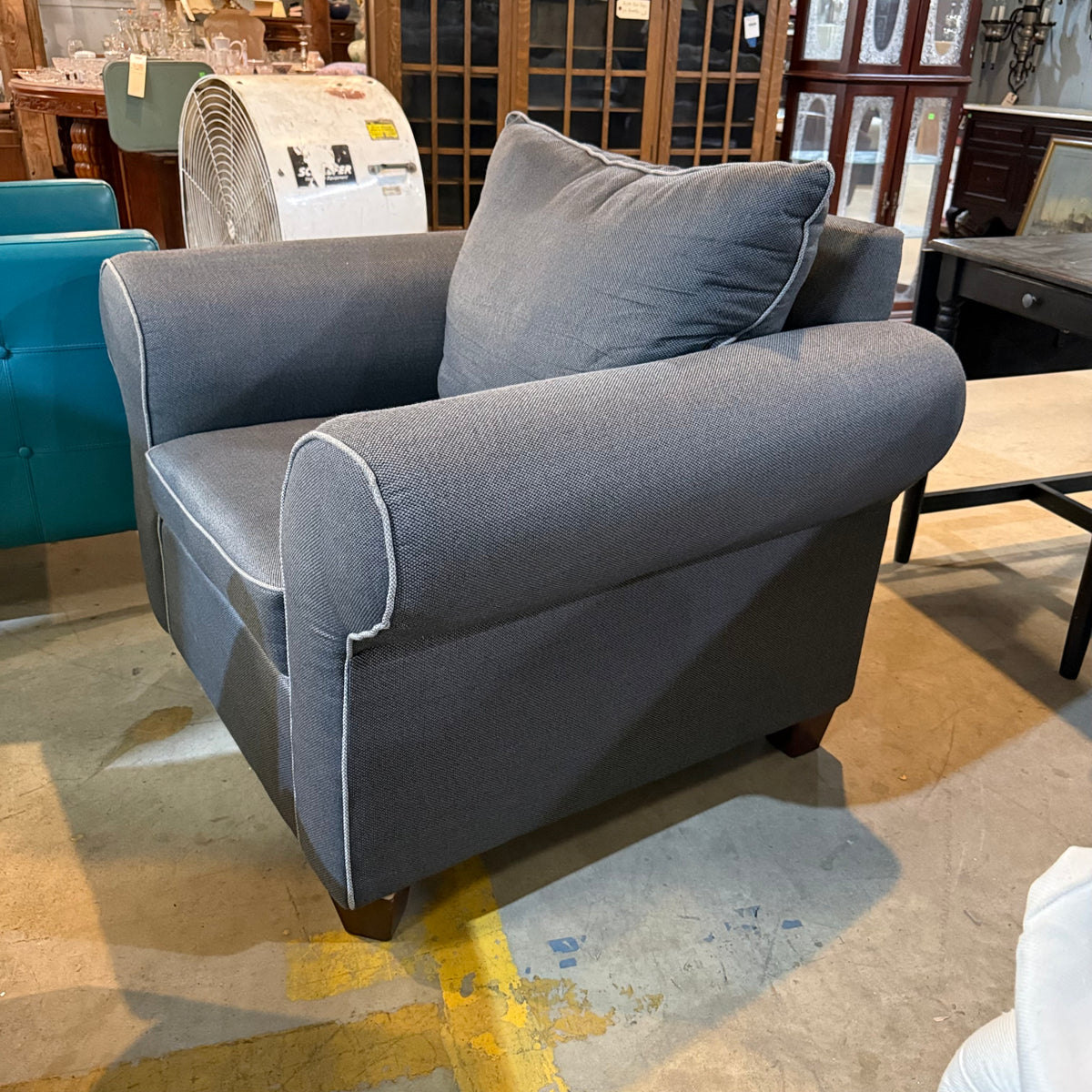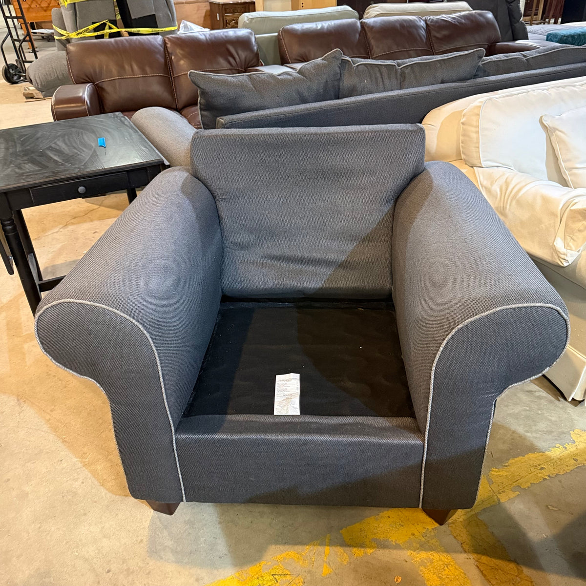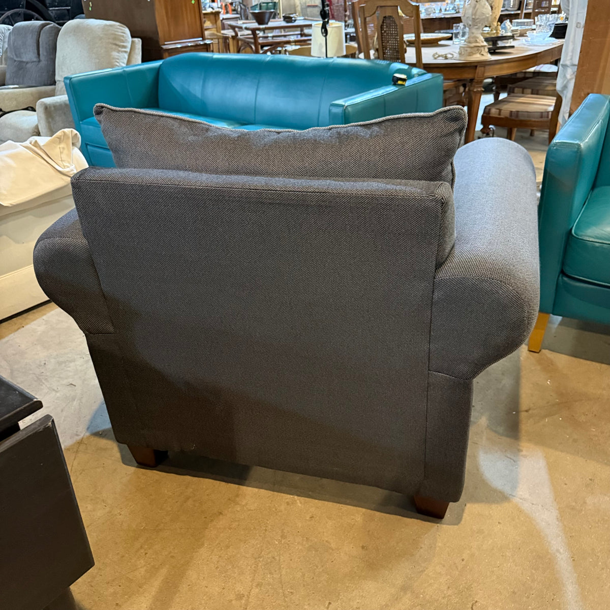 This is a previously owned plush arm chair made by May Furniture and it is upholstered in a dark gray fabric. It sits on block feet and comes with a seat cushion that appears to be filled with polyurethane foam. The seat and back cushion are both removable.