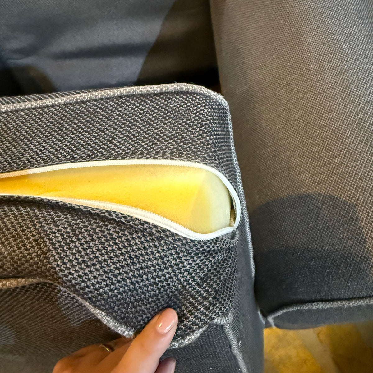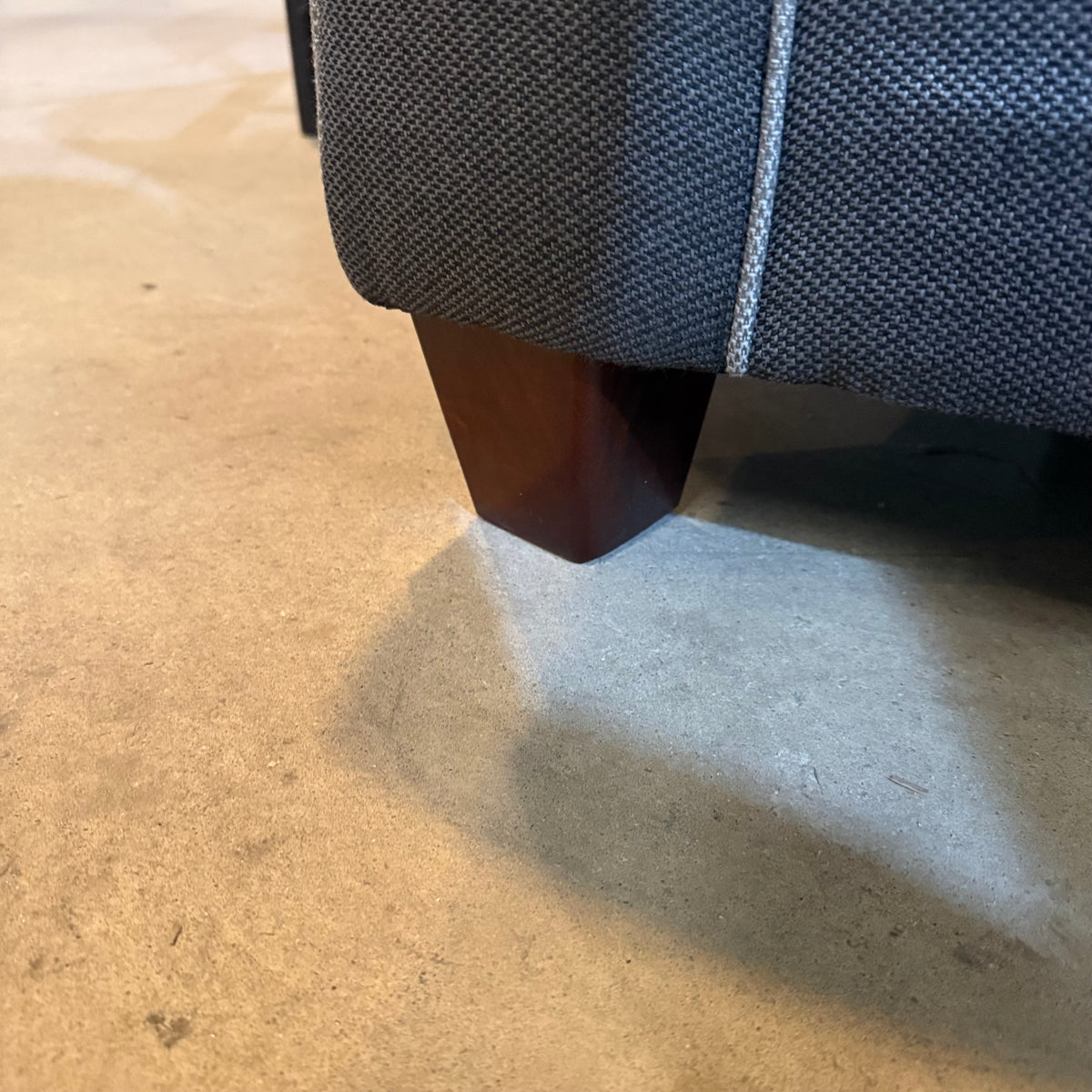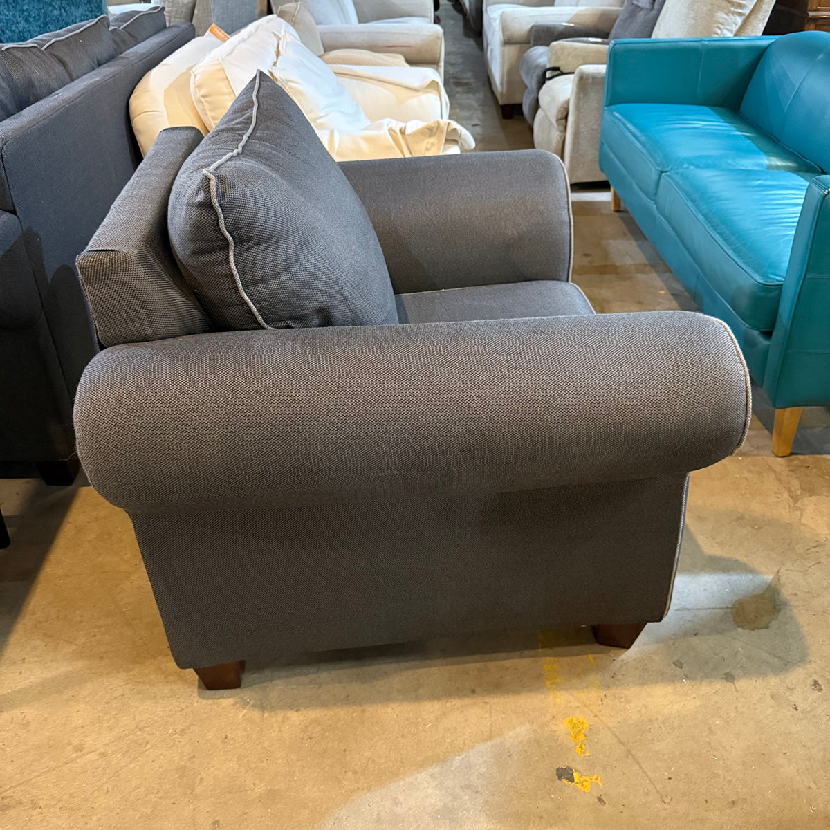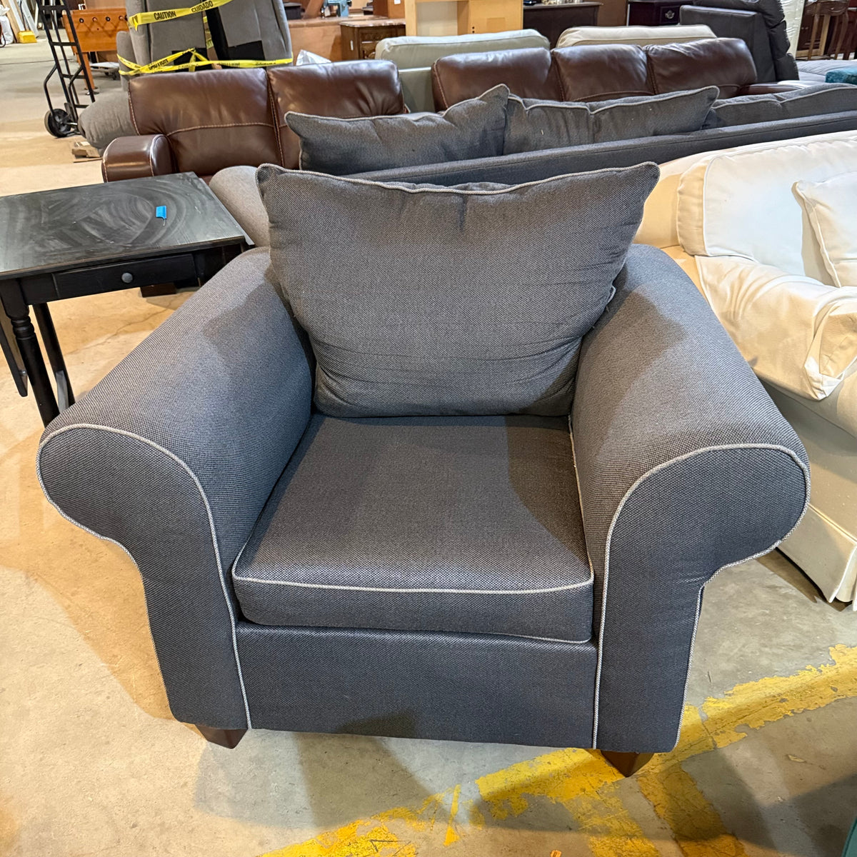 This is a previously owned plush arm chair made by May Furniture and it is upholstered in a dark gray fabric. It sits on block feet and comes with a seat cushion that appears to be filled with polyurethane foam. The seat and back cushion are both removable.