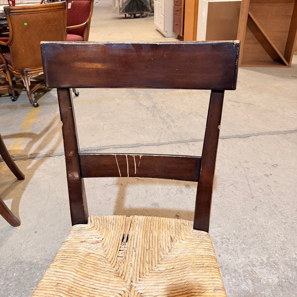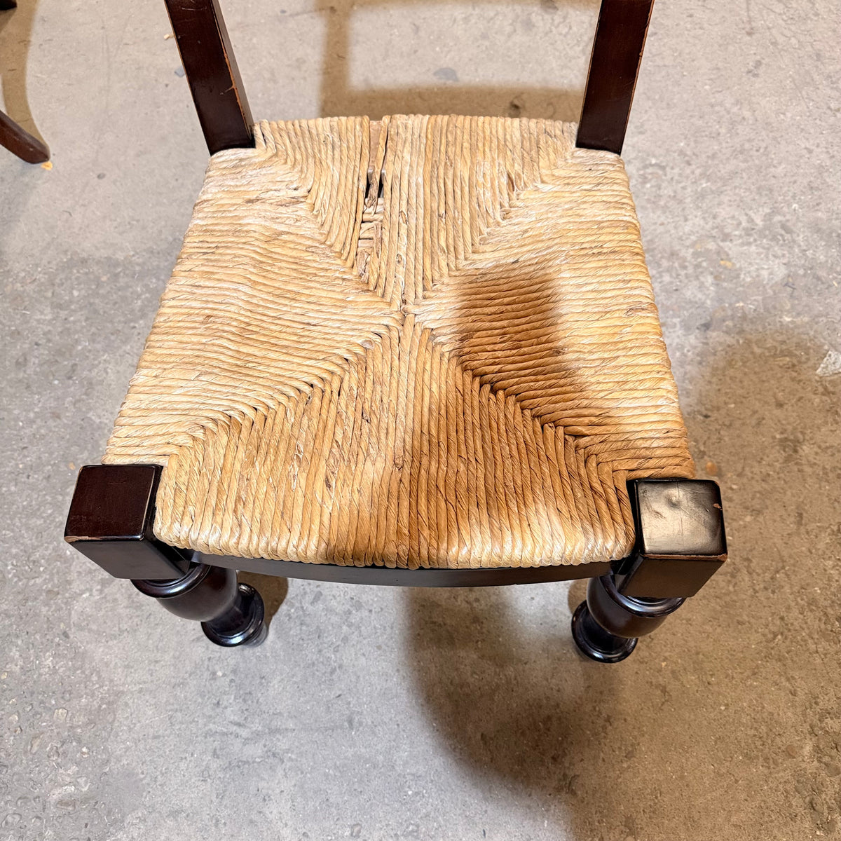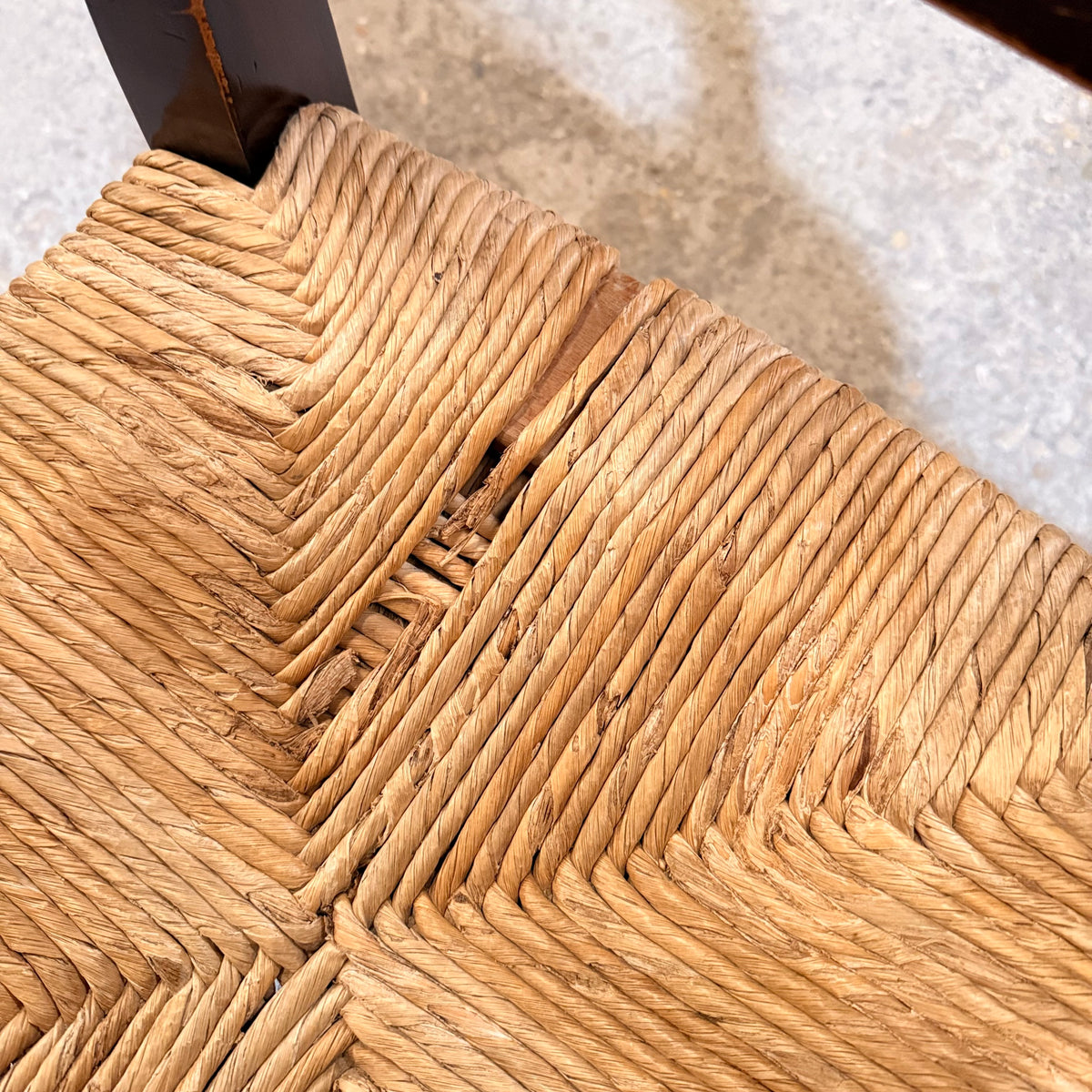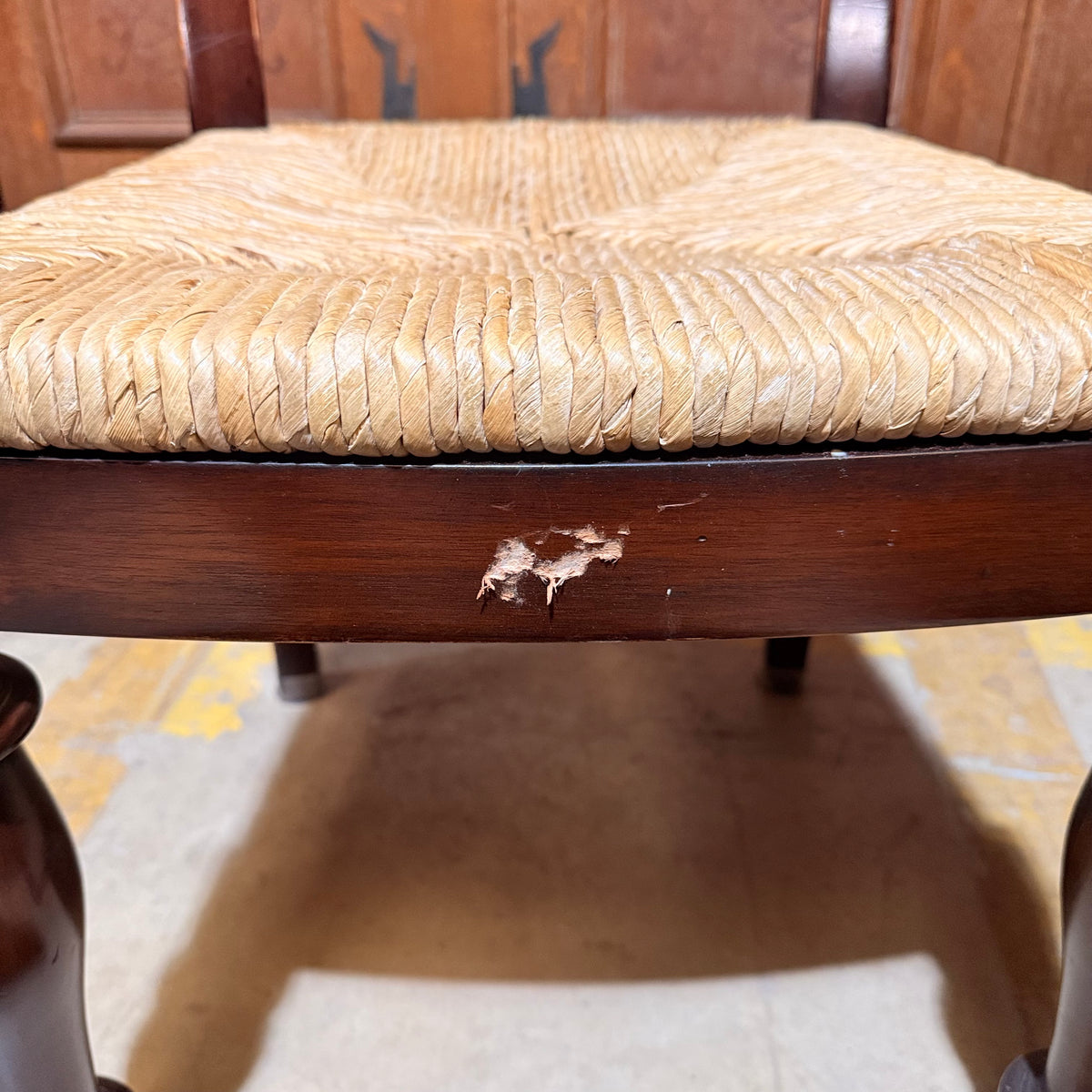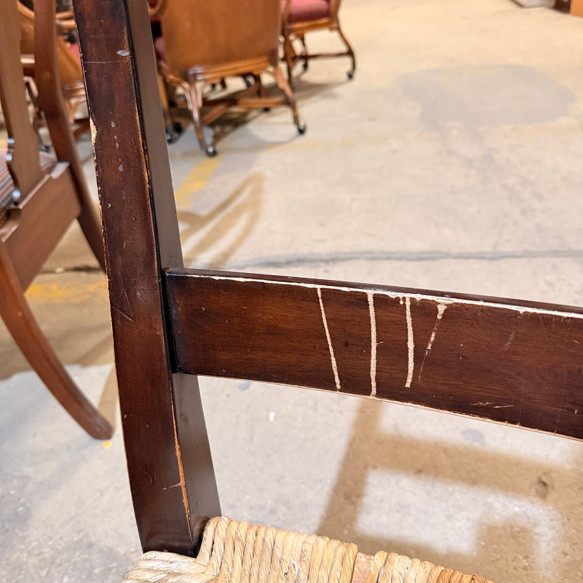 Please note, there are many deep scratches and chips along the surface top of the table. There are also some chips and scratches to the frames of the chairs, especially to their backs and towards the feet. There is one specific dining chair with some damage to the woven straw on the rush seat (see photos).