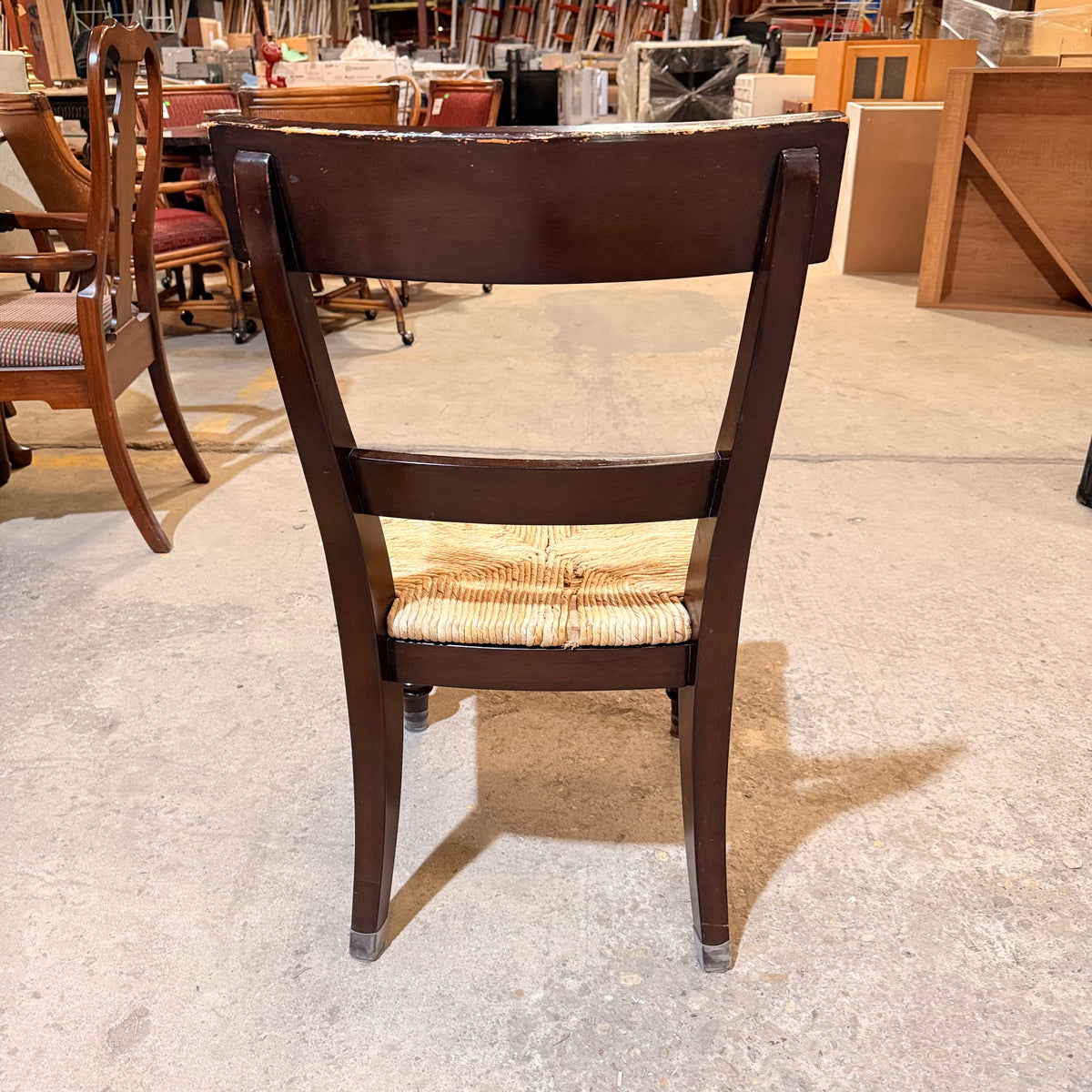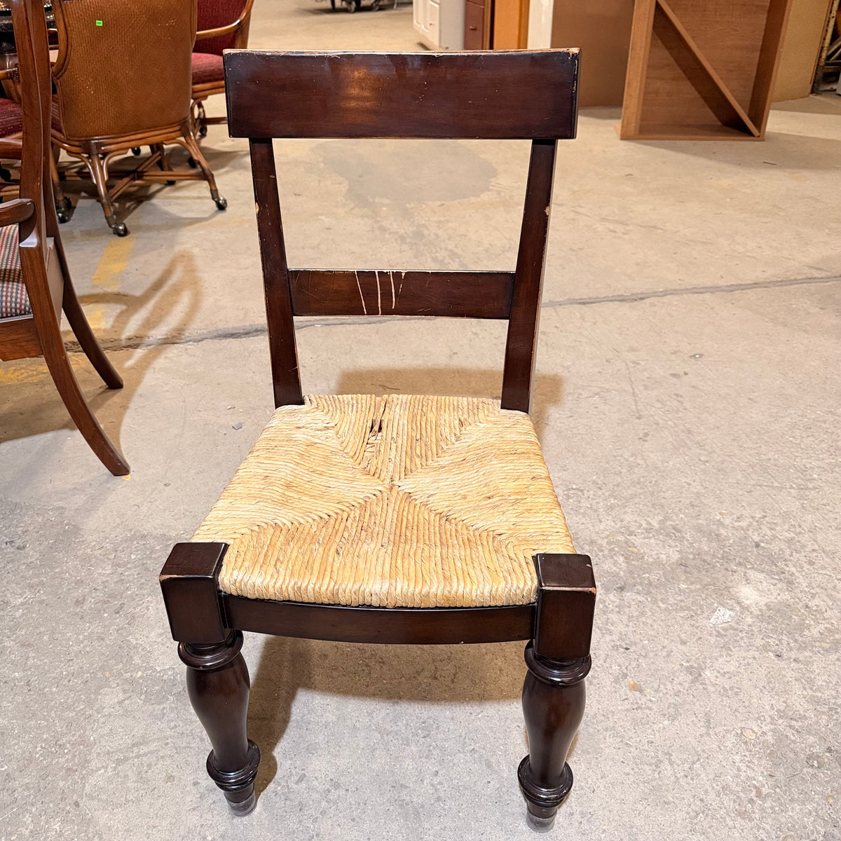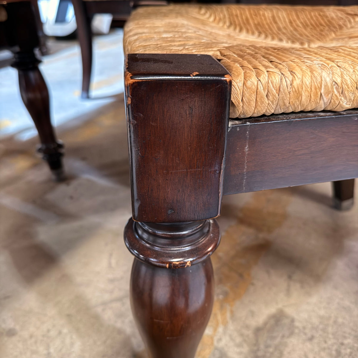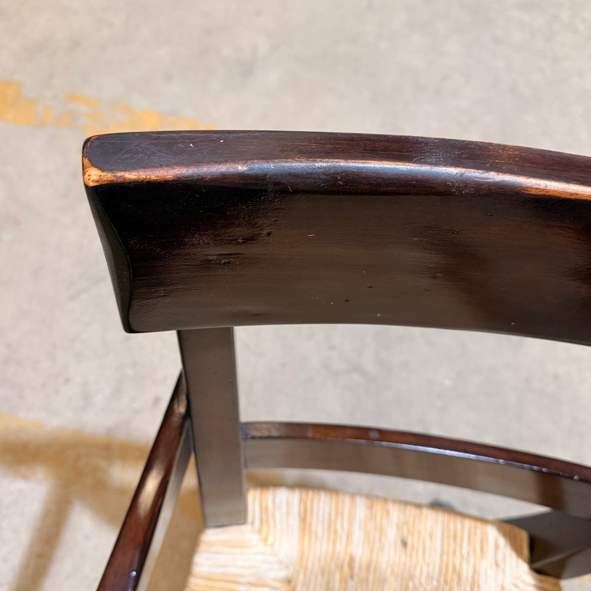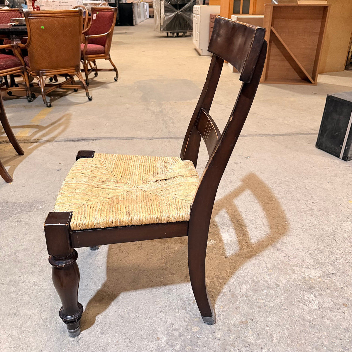 Please note, there are many deep scratches and chips along the surface top of the table. There are also some chips and scratches to the frames of the chairs, especially to their backs and towards the feet. There is one specific dining chair with some damage to the woven straw on the rush seat (see photos).