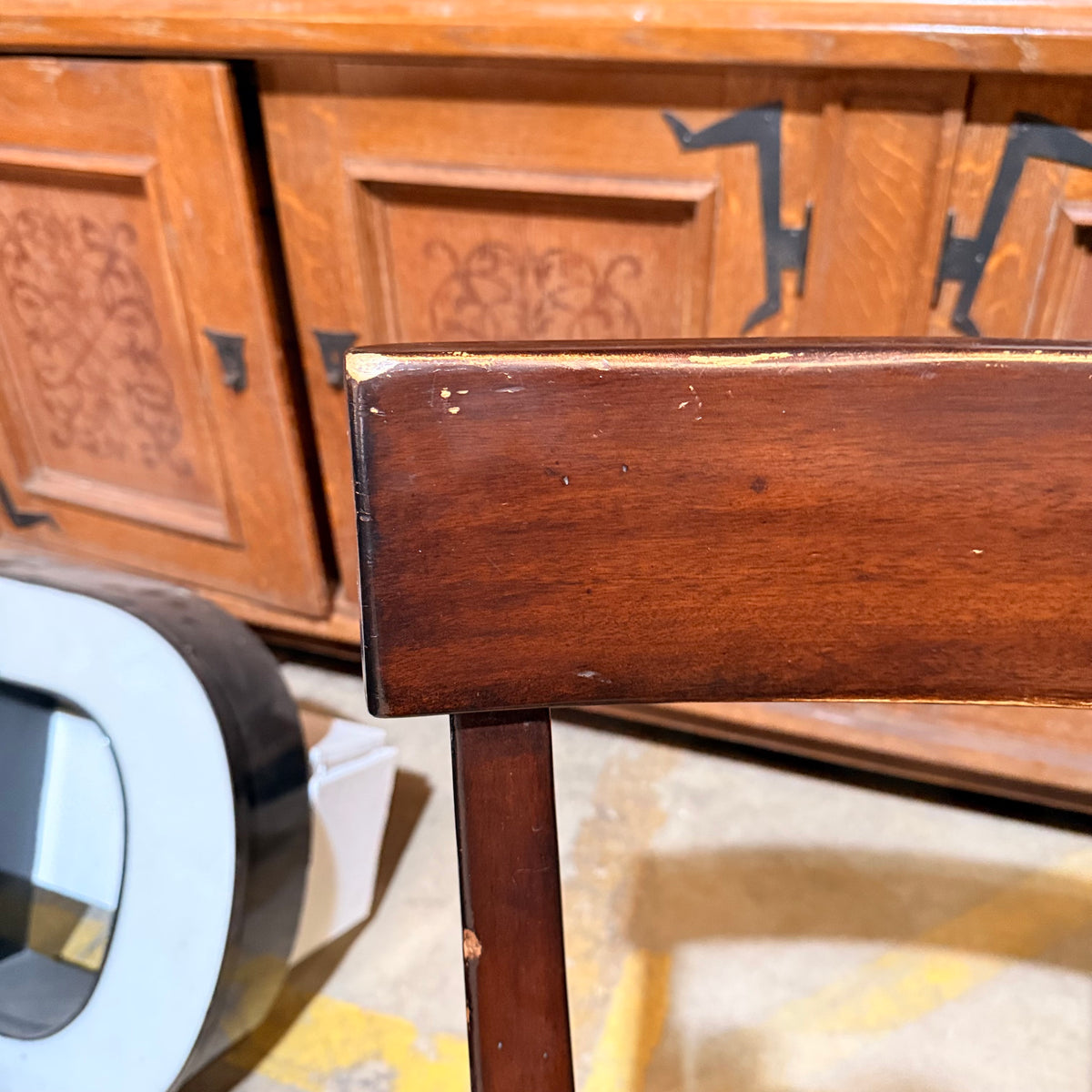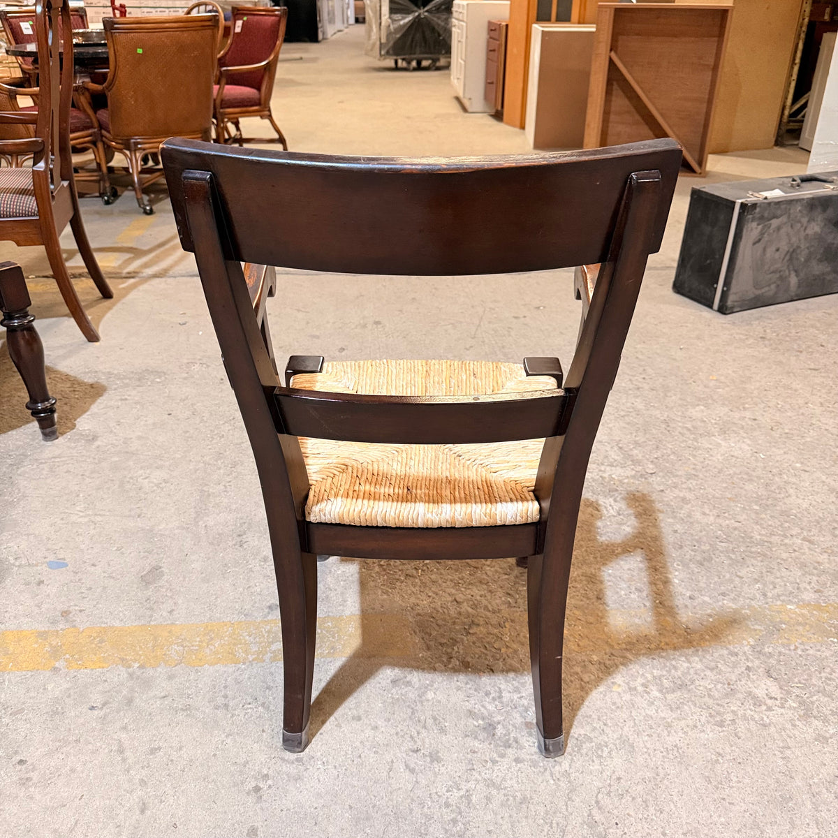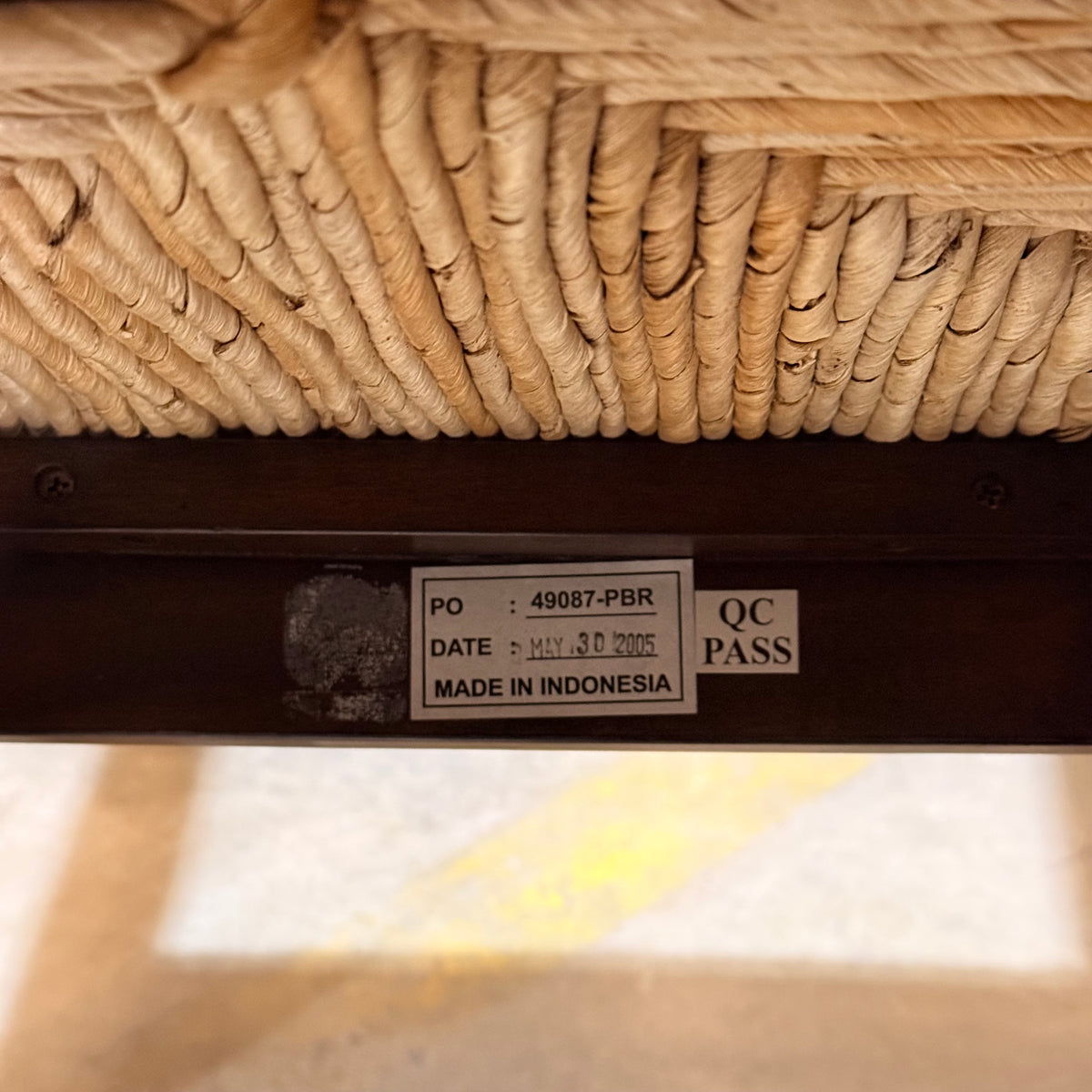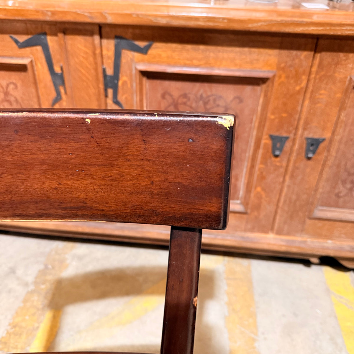 Please note, there are many deep scratches and chips along the surface top of the table. There are also some chips and scratches to the frames of the chairs, especially to their backs and towards the feet. There is one specific dining chair with some damage to the woven straw on the rush seat (see photos).
